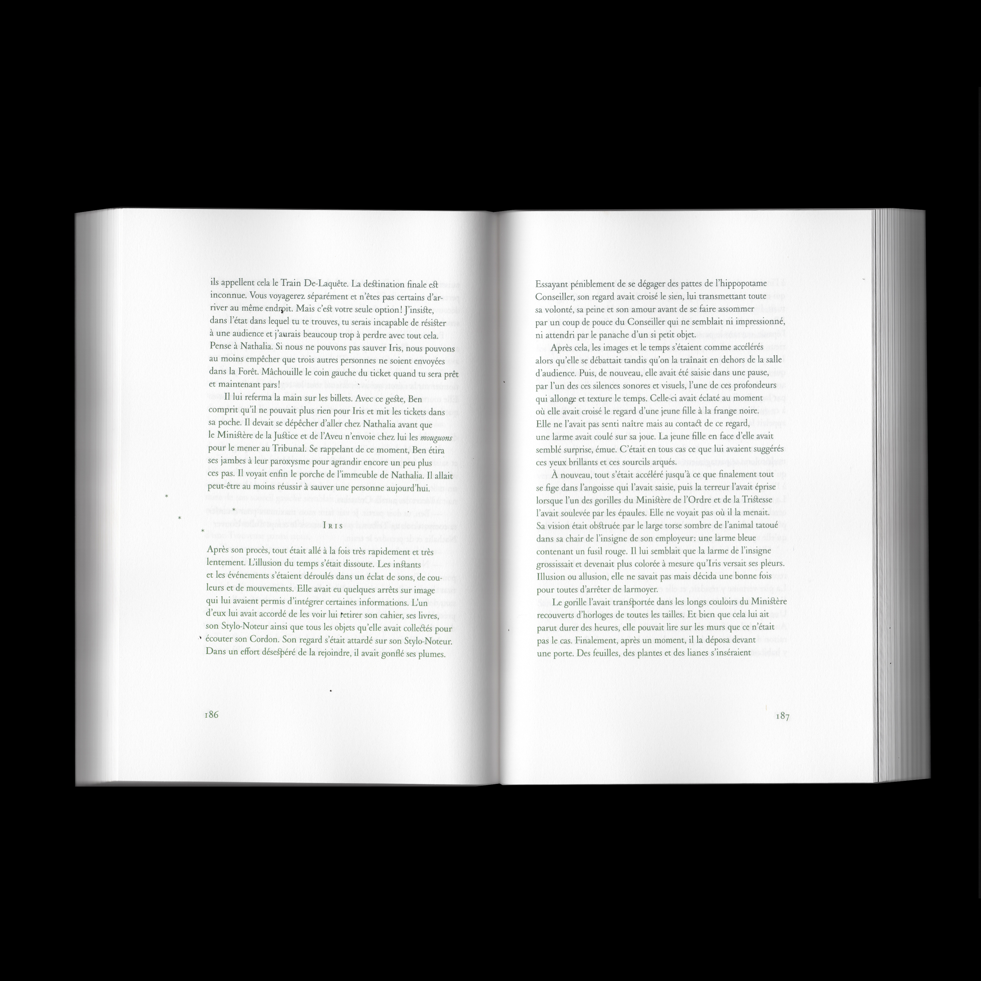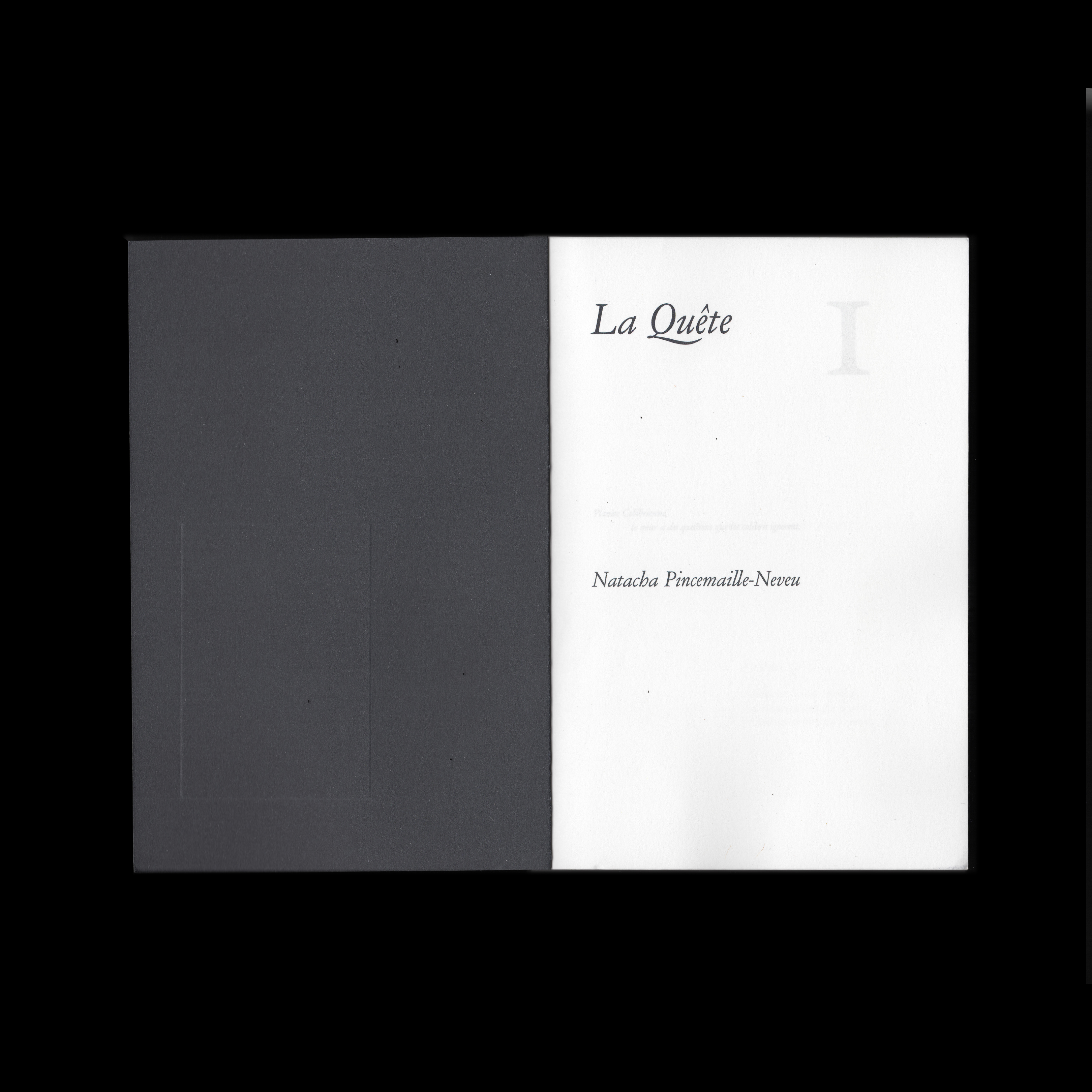 The Quest, Vol. I is an imaginary novel written by therapist, teacher and writer Natacha Pincemaille-Neveu and published in spring 2022. The book is available at The G(u)ardeners. To design this book, Atelier Nom Commun (Maya Cunat and Quentin Gaudry) used Henry designed by Matthieu Cortat and distributed by 205TF.