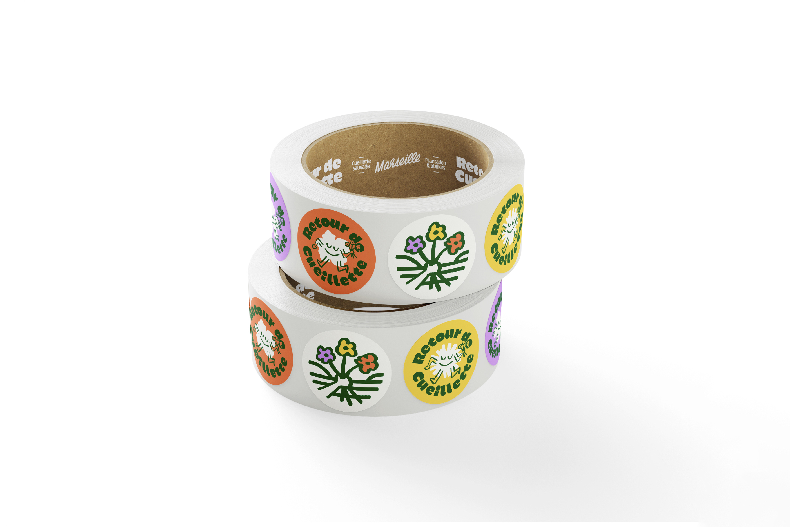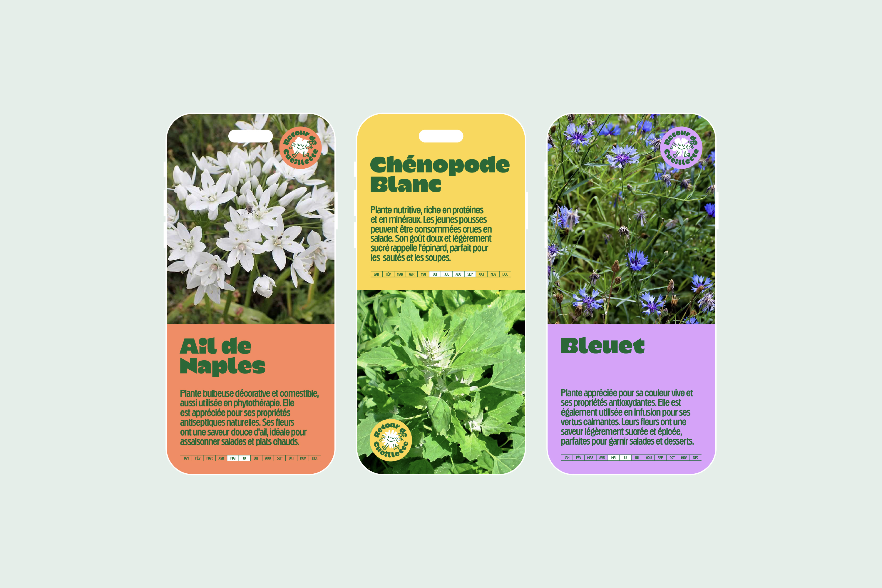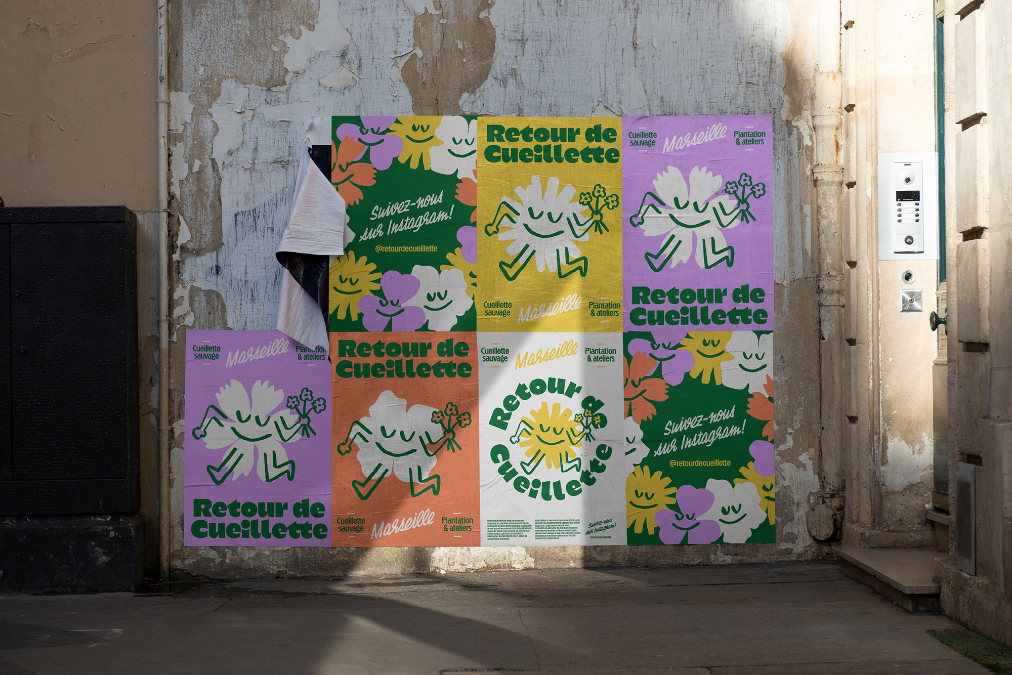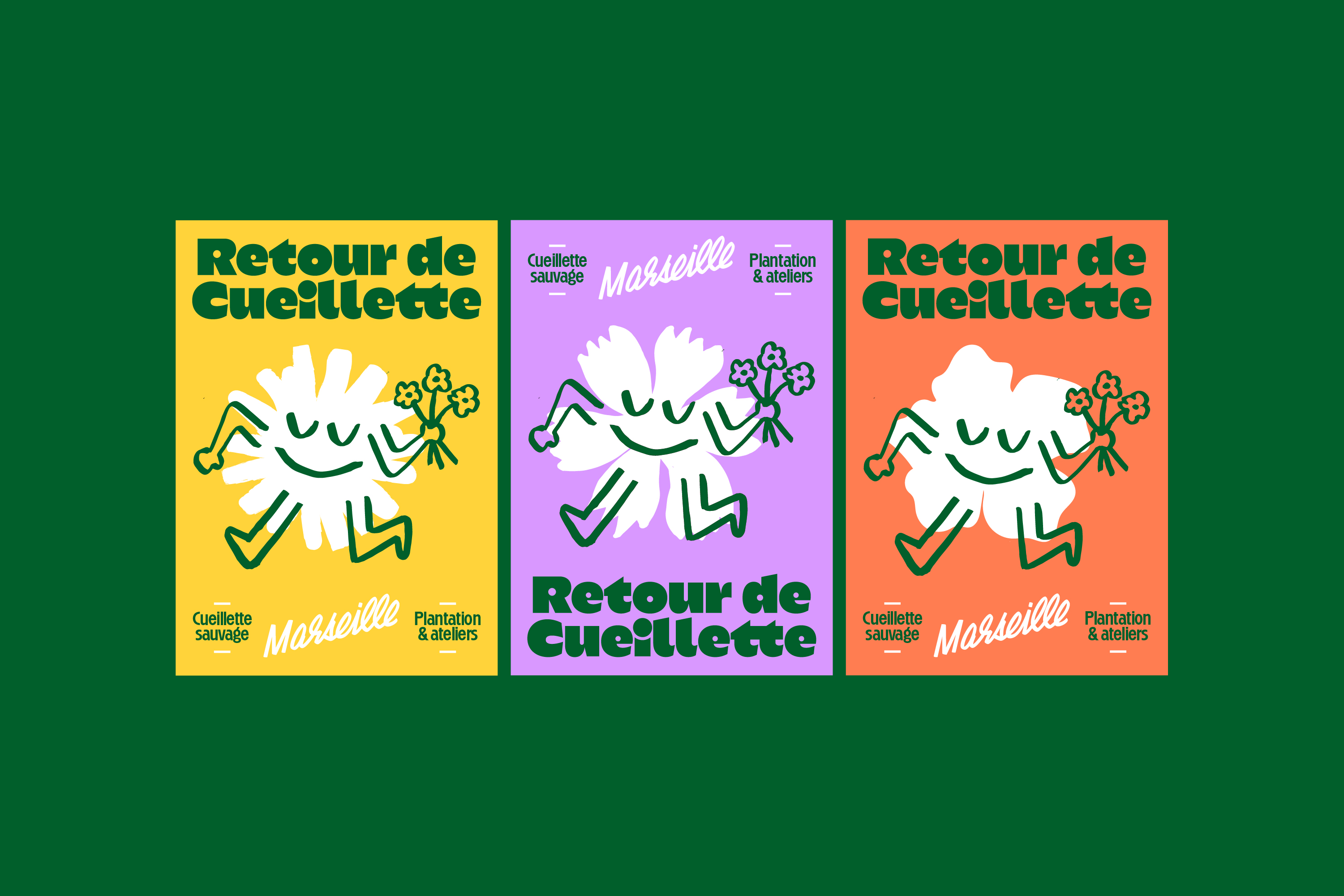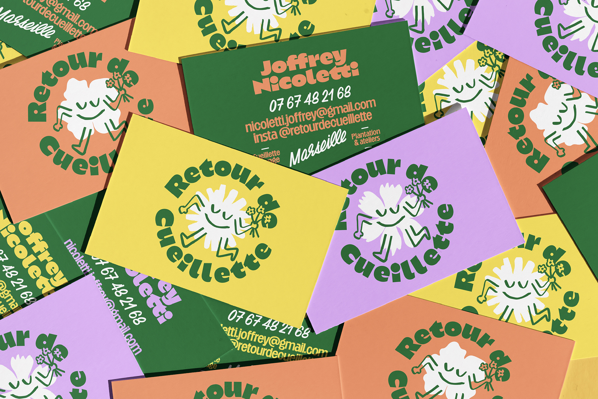 Retour de Cueillette provides edible flowers and aromatic plants to restaurants in Marseille, France. Created in 2024, the structure promotes sustainable wildcrafting with participatory workshops and nature walks. To design the identity, Odd Forms Studio used the typeface Kaio Krilin by Romain Oudin, Disc by Lucas Descroix, and Chaumont Script by Alexandre Bassi.