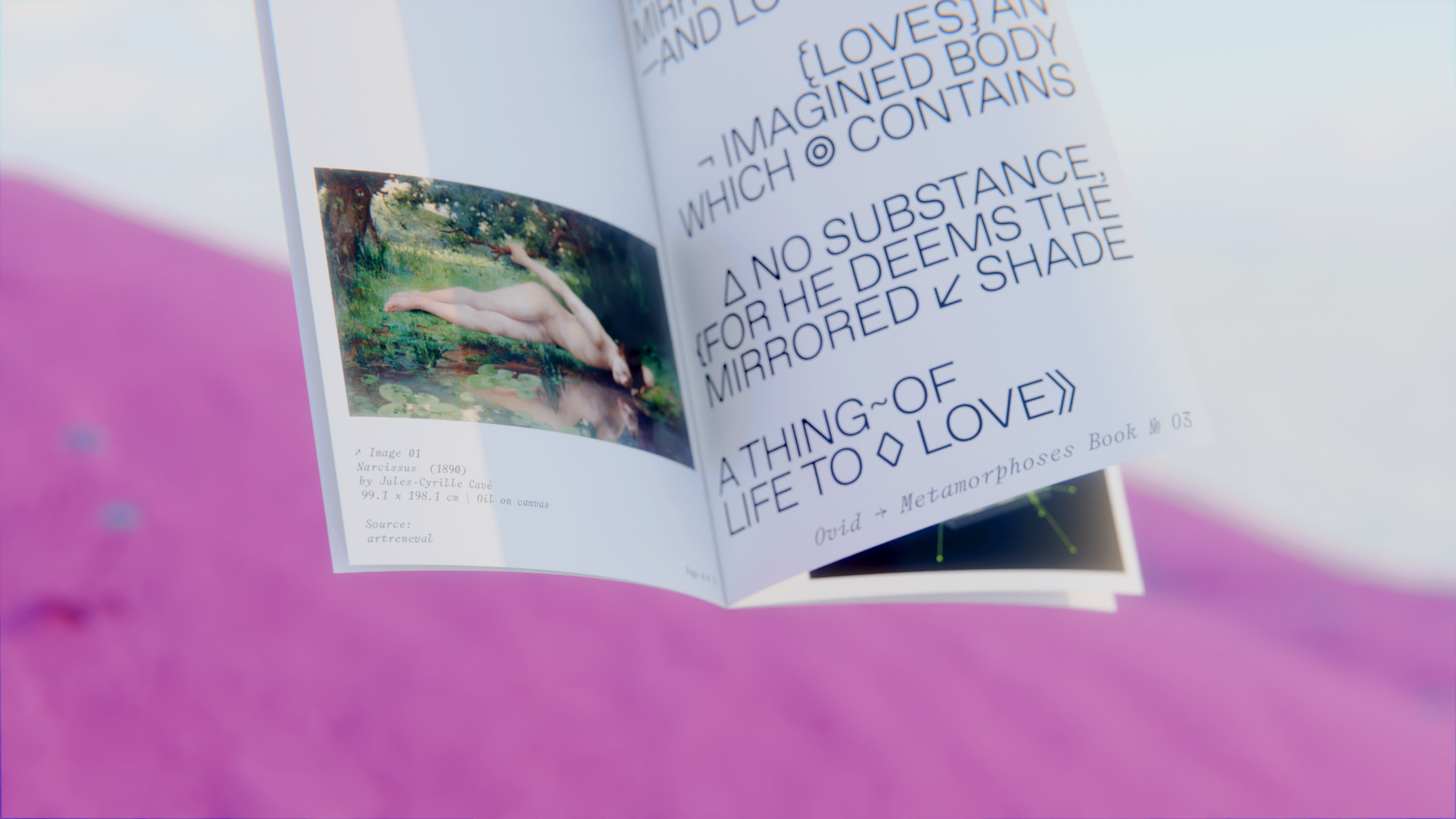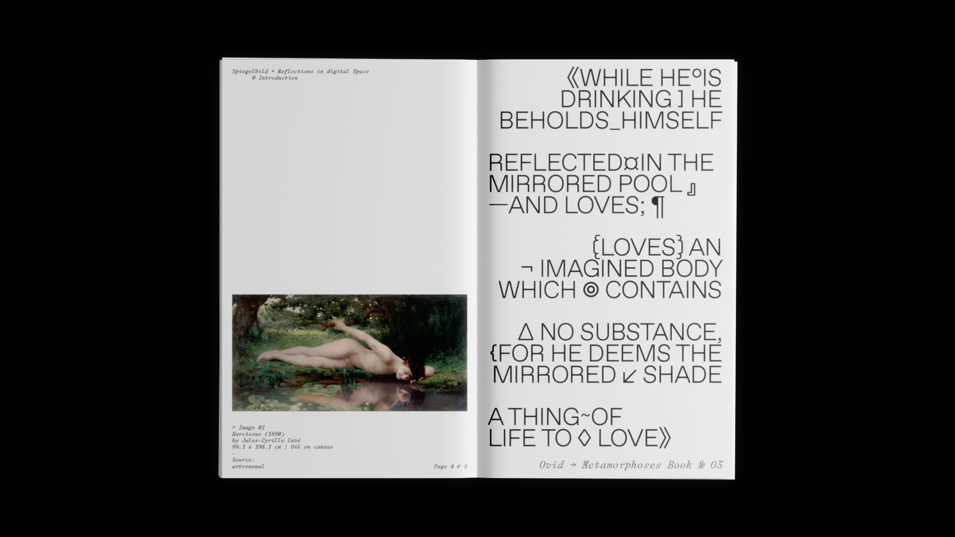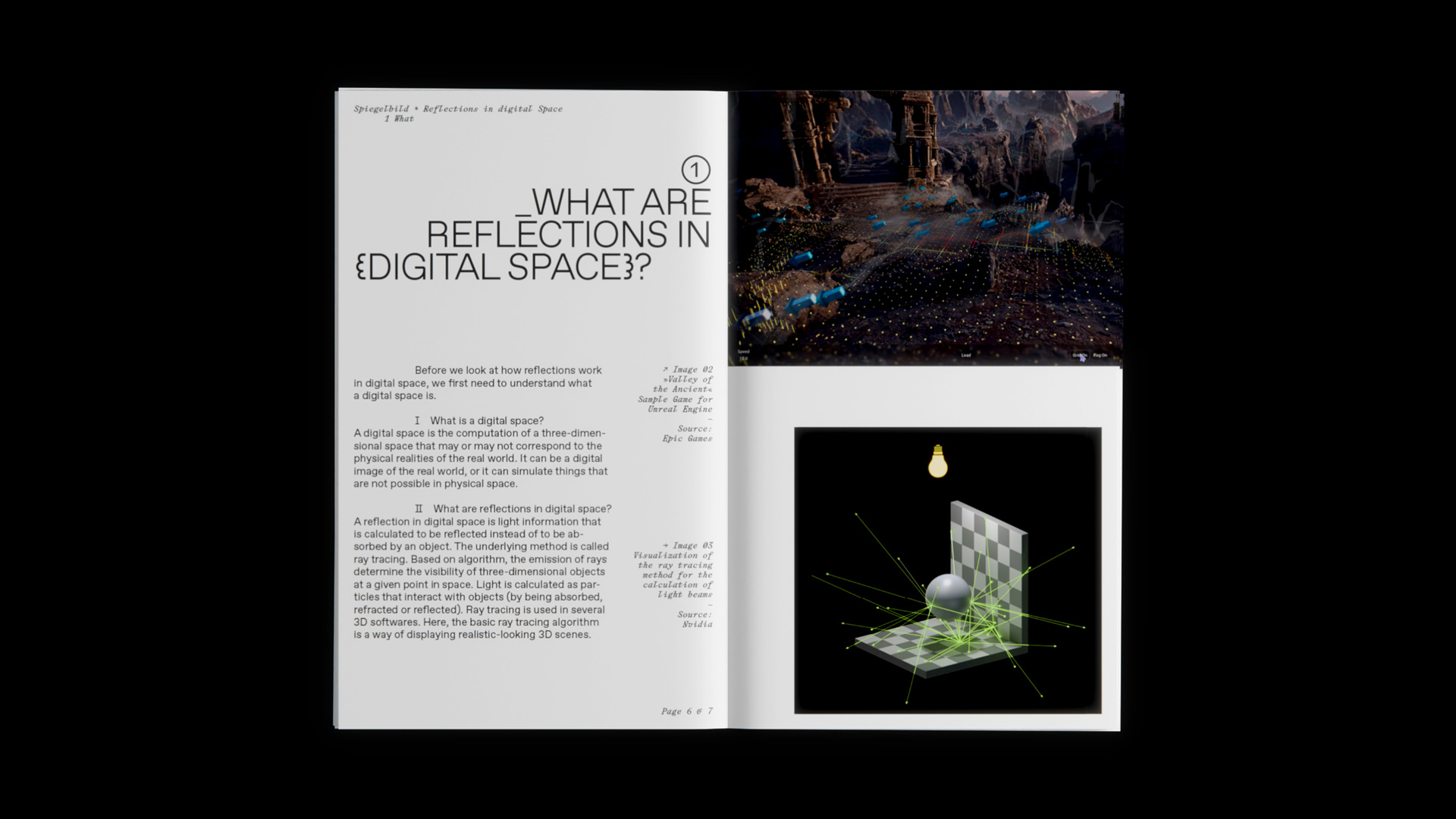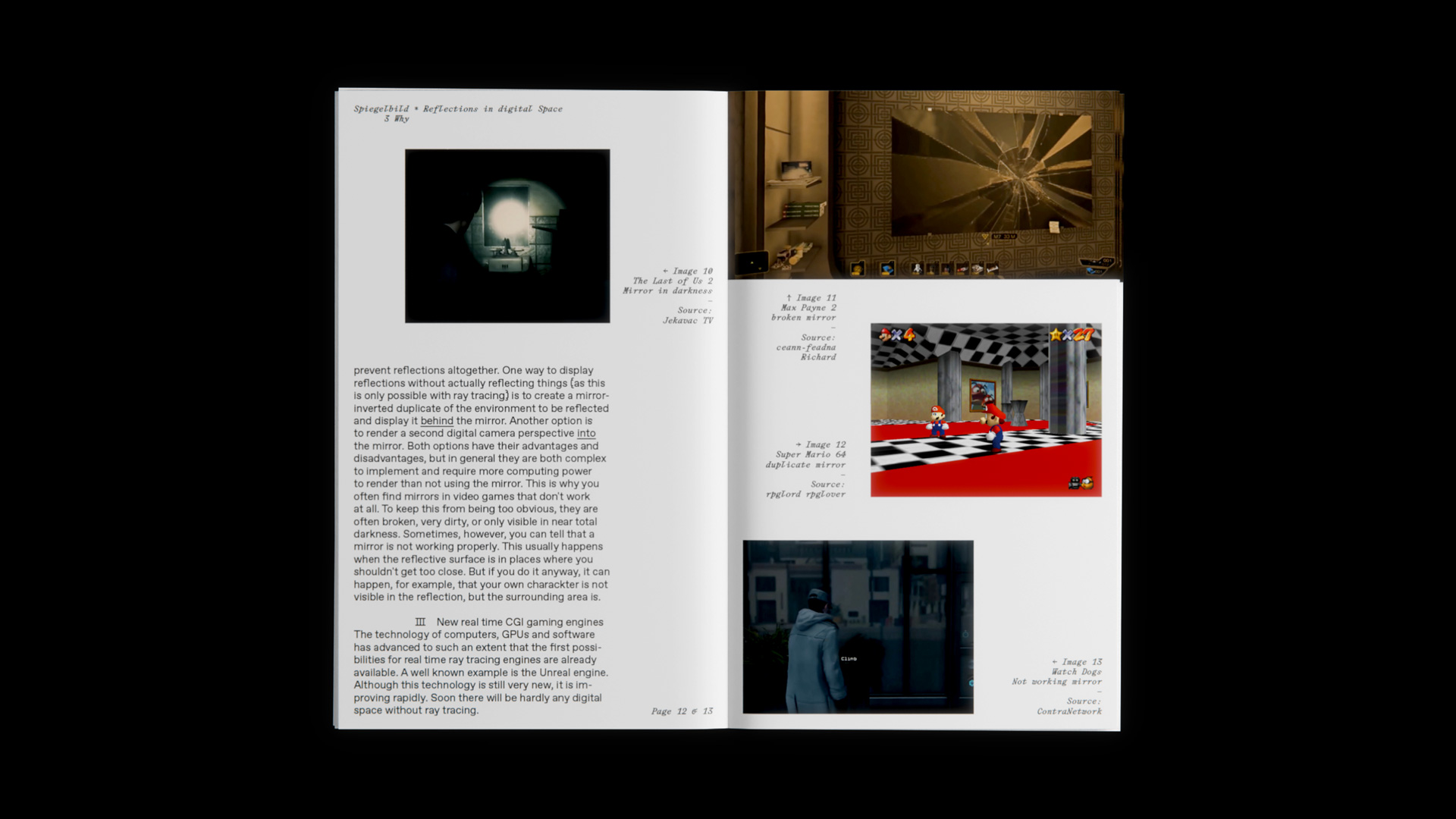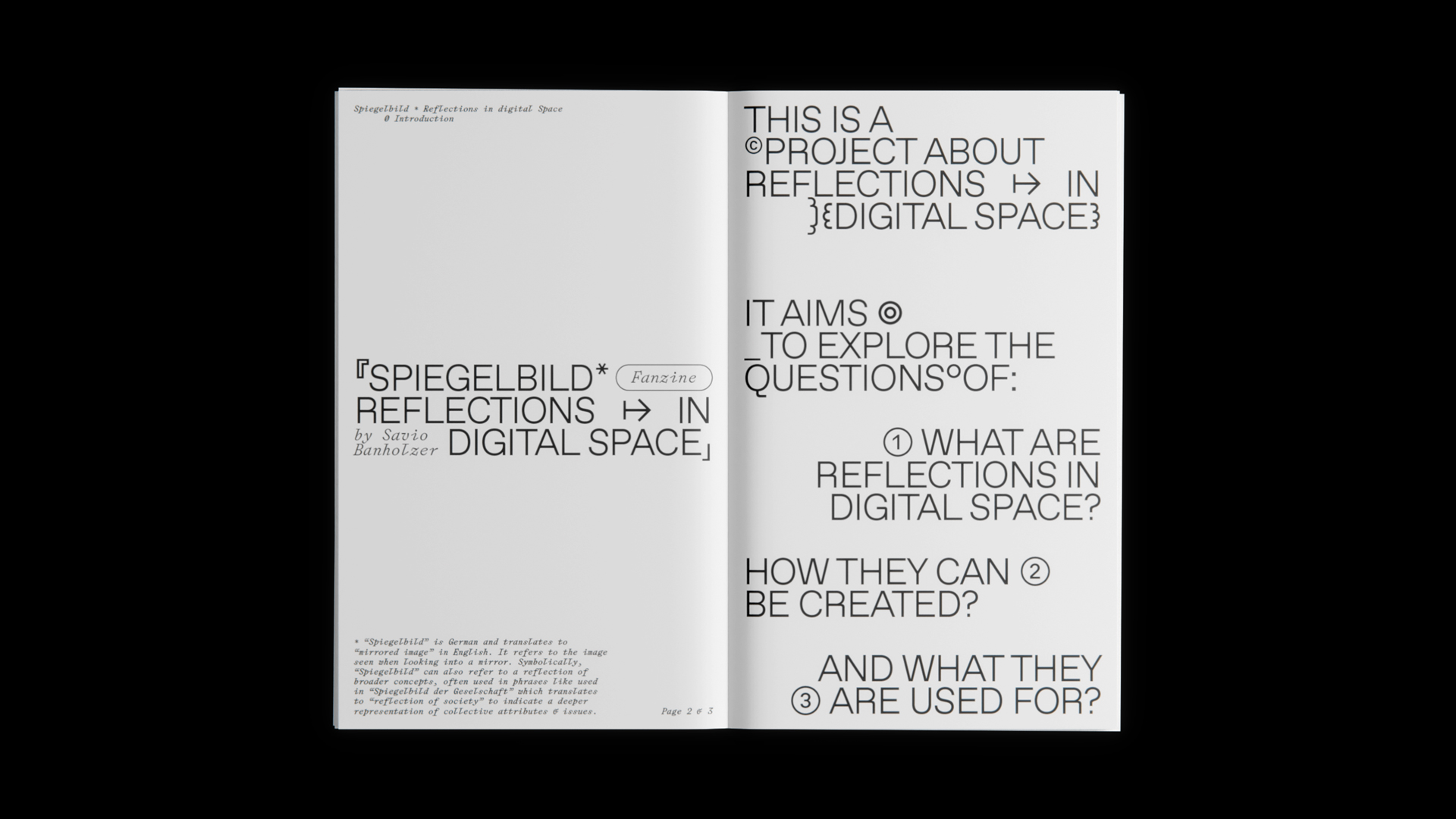 Spiegelbild – Reflections in Digital Space is a zine made as an investigation into the amazing world of reflections in digital space. It aims to explore and to answer the questions of: What are reflections in digital space? How can they be created? As well as, what are they used for?