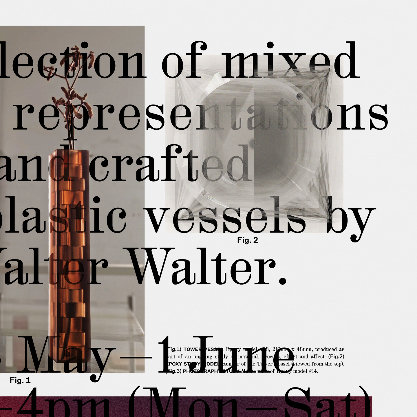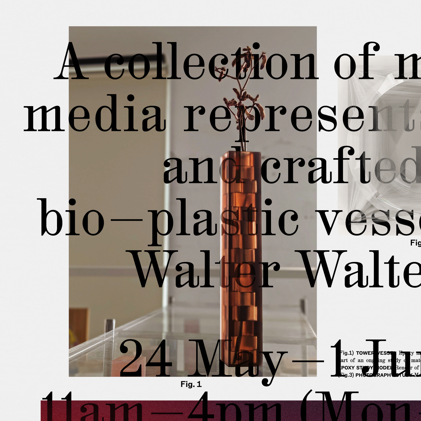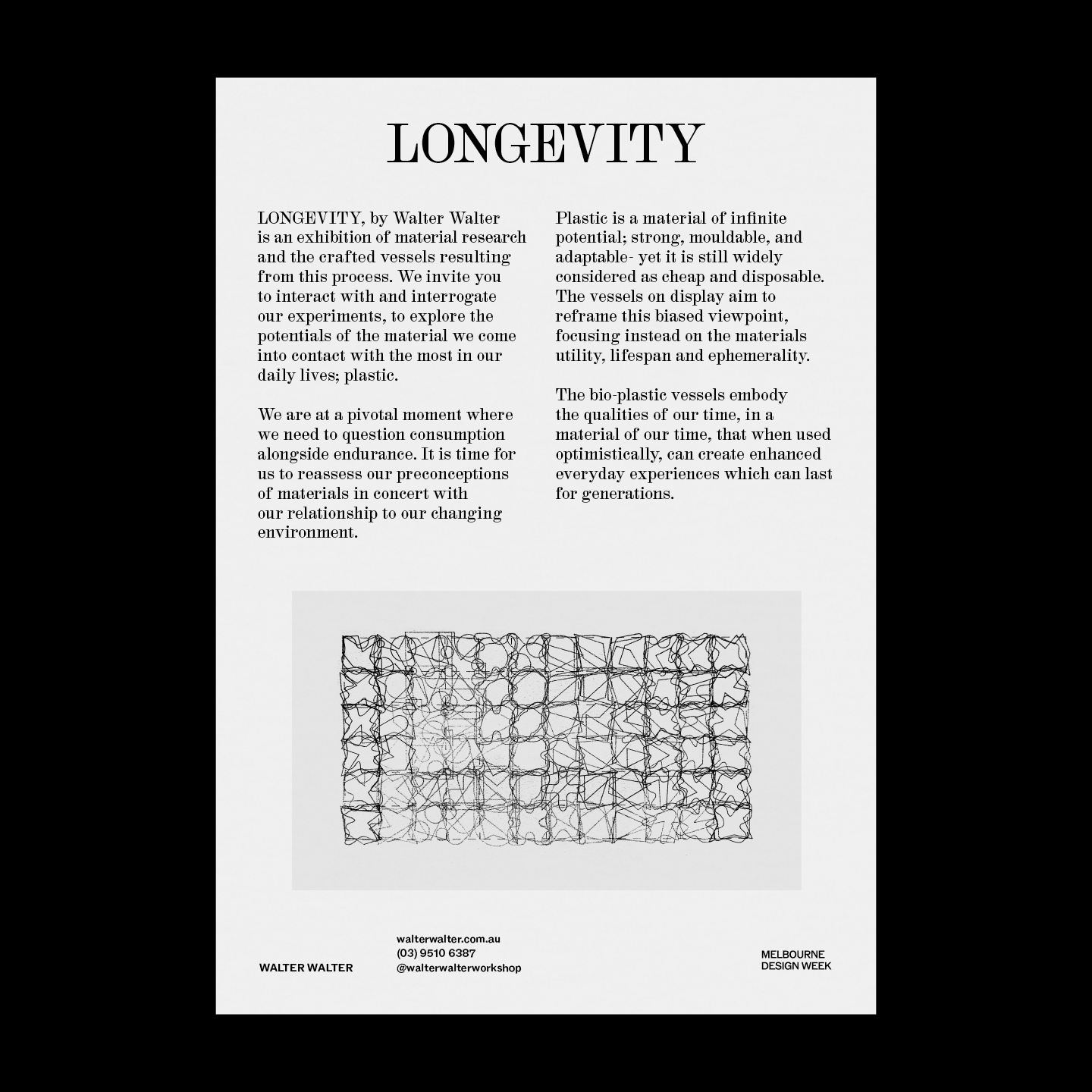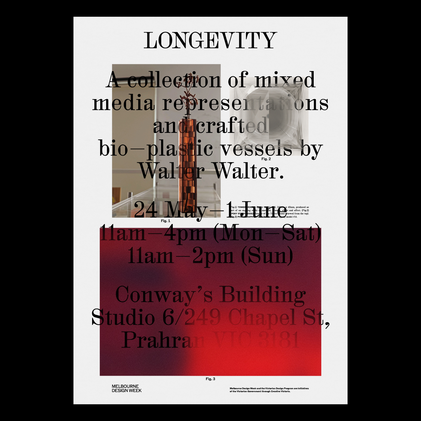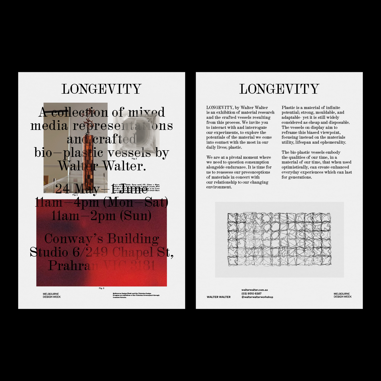 M.Giesser, a communication design practice based in Melbourne, created this poster and invitation for Walter Walter’s upcoming exhibition LONGEVITY, presented as part of the 2024 Melbourne Design Week program. The design language references the layered and transparent qualities found in the bio-plastic vessels themselves. The design was typeset with HAL Colant, published by HAL Typefaces, and ABC Rom by Seb McLauchlan, published by Dinamo Typefaces.