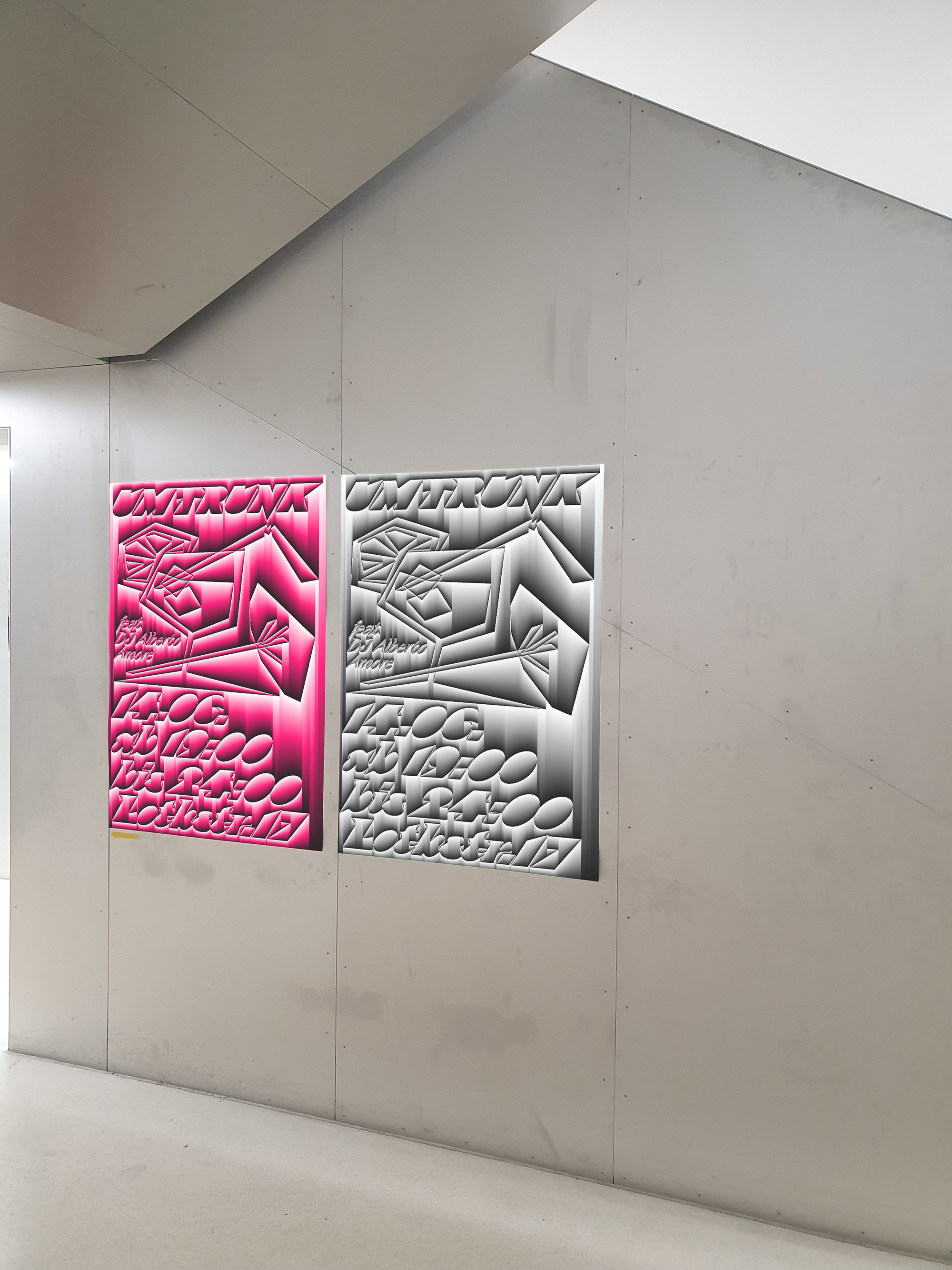 Tobias Moser harnessed the bold, dynamic flair of VZWO Choreo Display, blending its massive black style with its sleek, swinging thin style to craft captivating posters and animations for the electrifying “UMTRUNK” event by Hochschule München’s Faculty of Design.