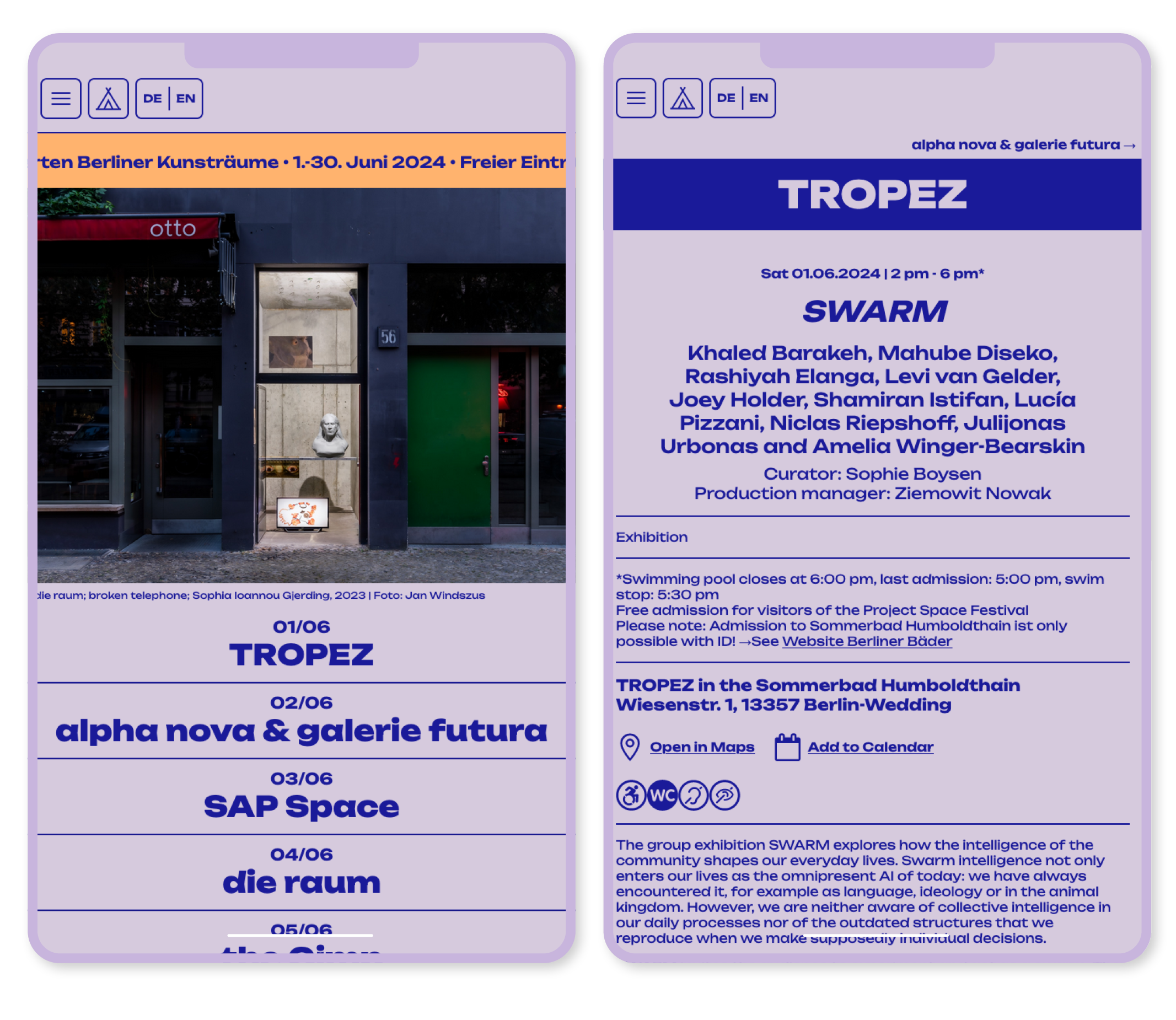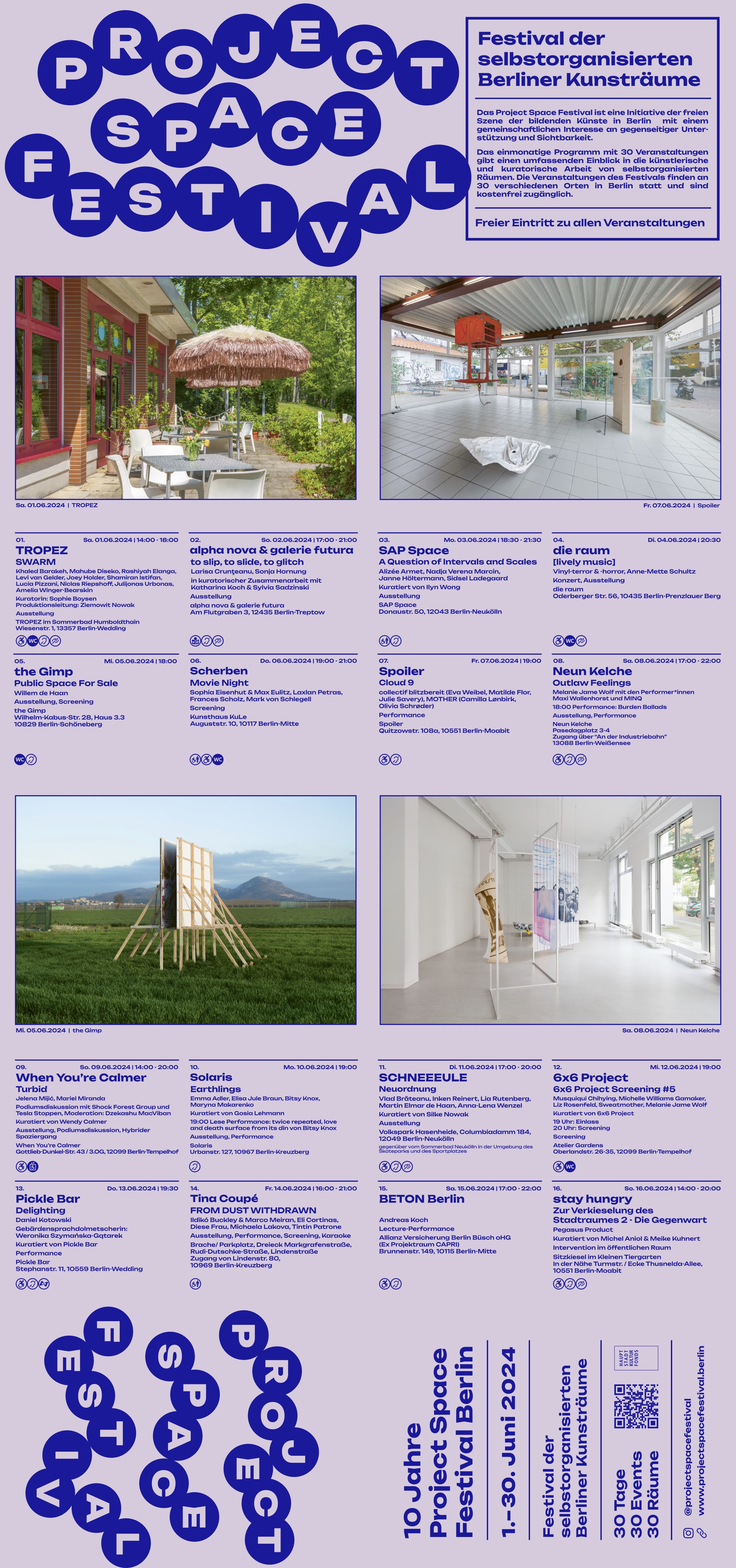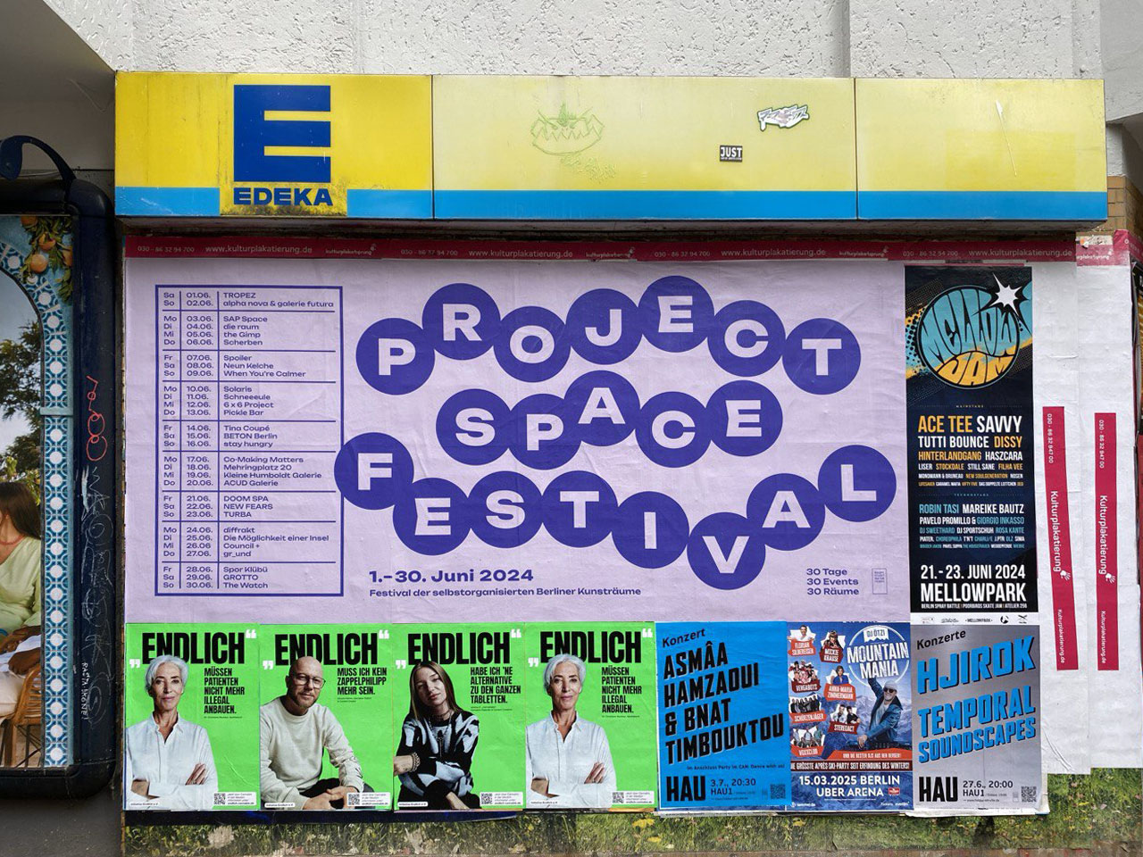 Project Space Festival is a yearly event dedicated to self-organized art spaces in Berlin. Art spaces that stand at the intersection between where art is made and where art is shown. The festival was started in 2014 but paused in 2020 and 2021 due to the COVID pandemic.