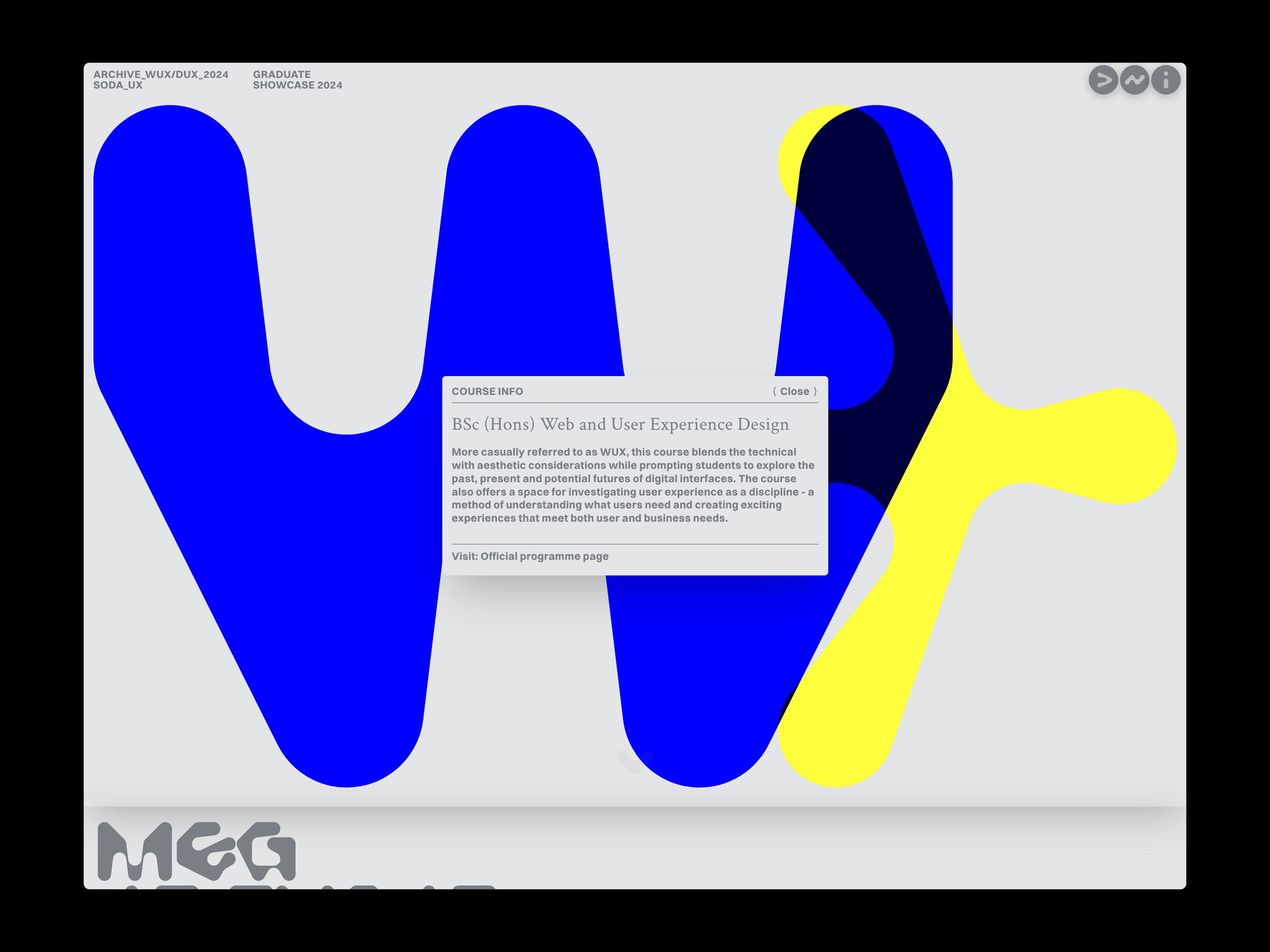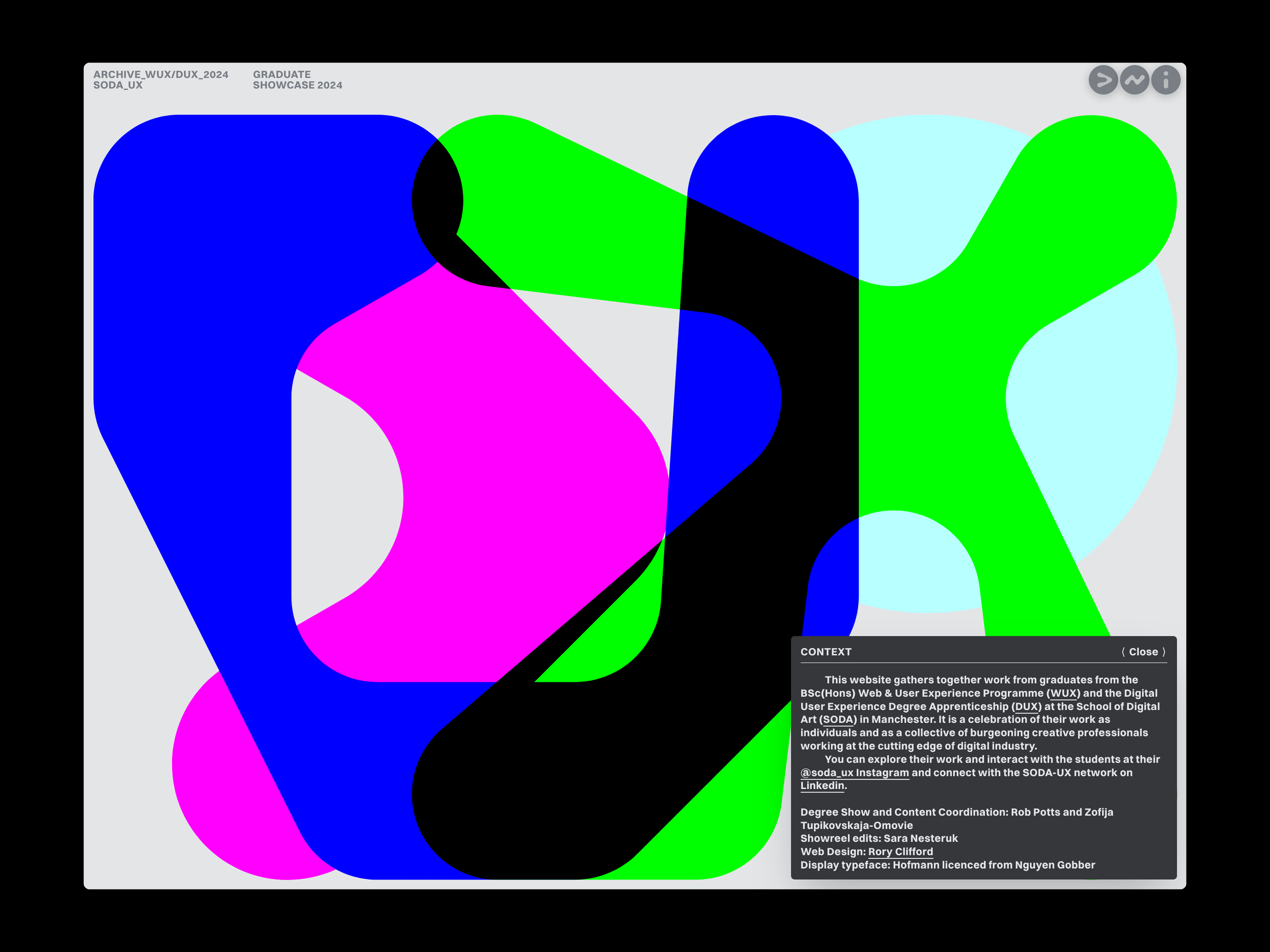 Rory Clifford collaborated with SODA_UX to design and develop the SODA_UX Graduation Website. The website showcases the final year projects of students enrolled in the BSc (Hons) Digital User Experience Degree Apprenticeship (DUX) and BSc (Hons) Web and User Experience Design (WUX) programs at the School of Digital Arts in Manchester, UK.