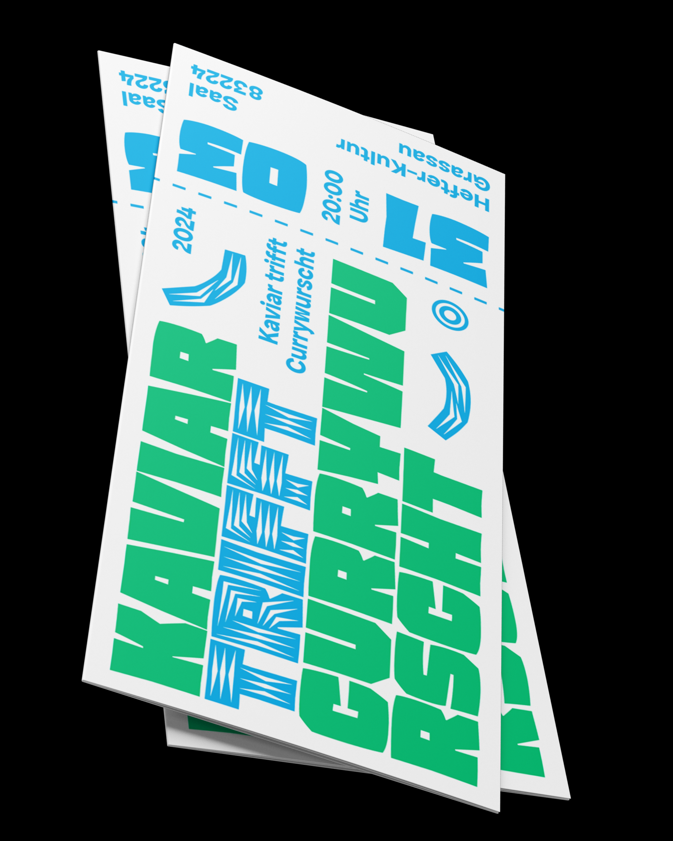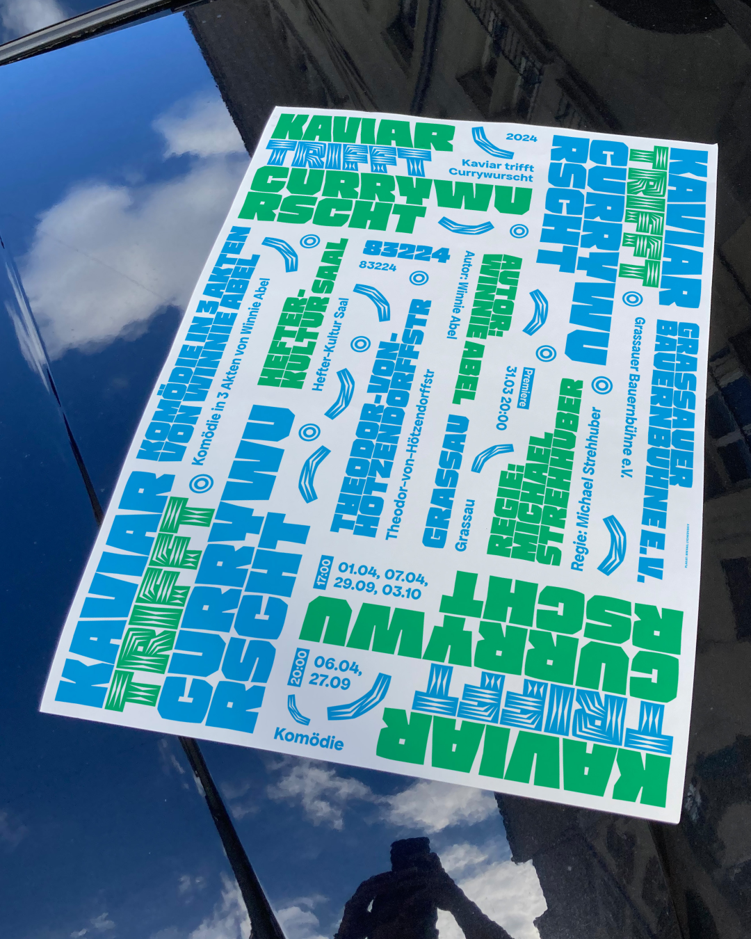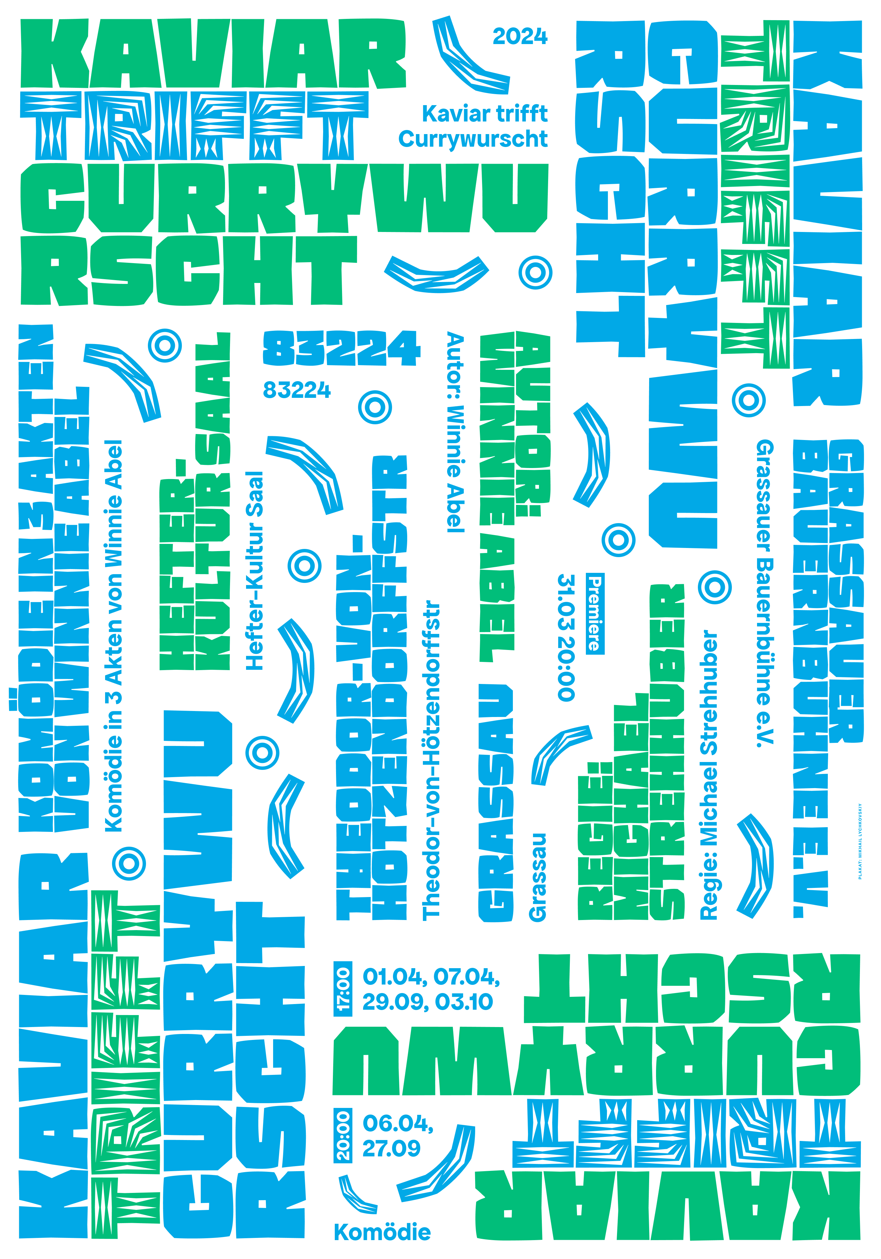 Kaviar trifft Currywurscht (“Caviar meets Curry Sausage”) is a theatrical play performed at Hefter-Kultur Saal in Grassau. I made a fictional poster for it as part of a workshop by Peter Bankov.
