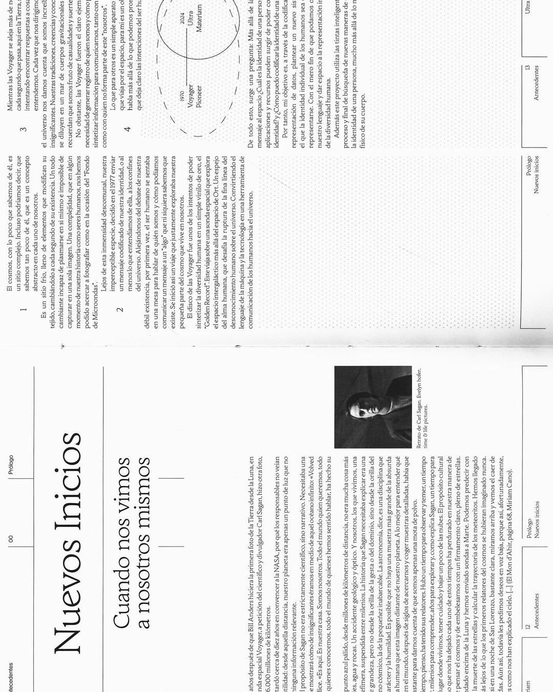 Ultra Materiam embarks on a journey to visually represent complex and abstract aspects of human identity, taking the legacy of the NASA Voyager mission as its starting point. The project goes beyond graphic experimentation and encourages reflection on human nature through the comparison of six anthropological theories, leading to a new model based on personality, morality and physiology.