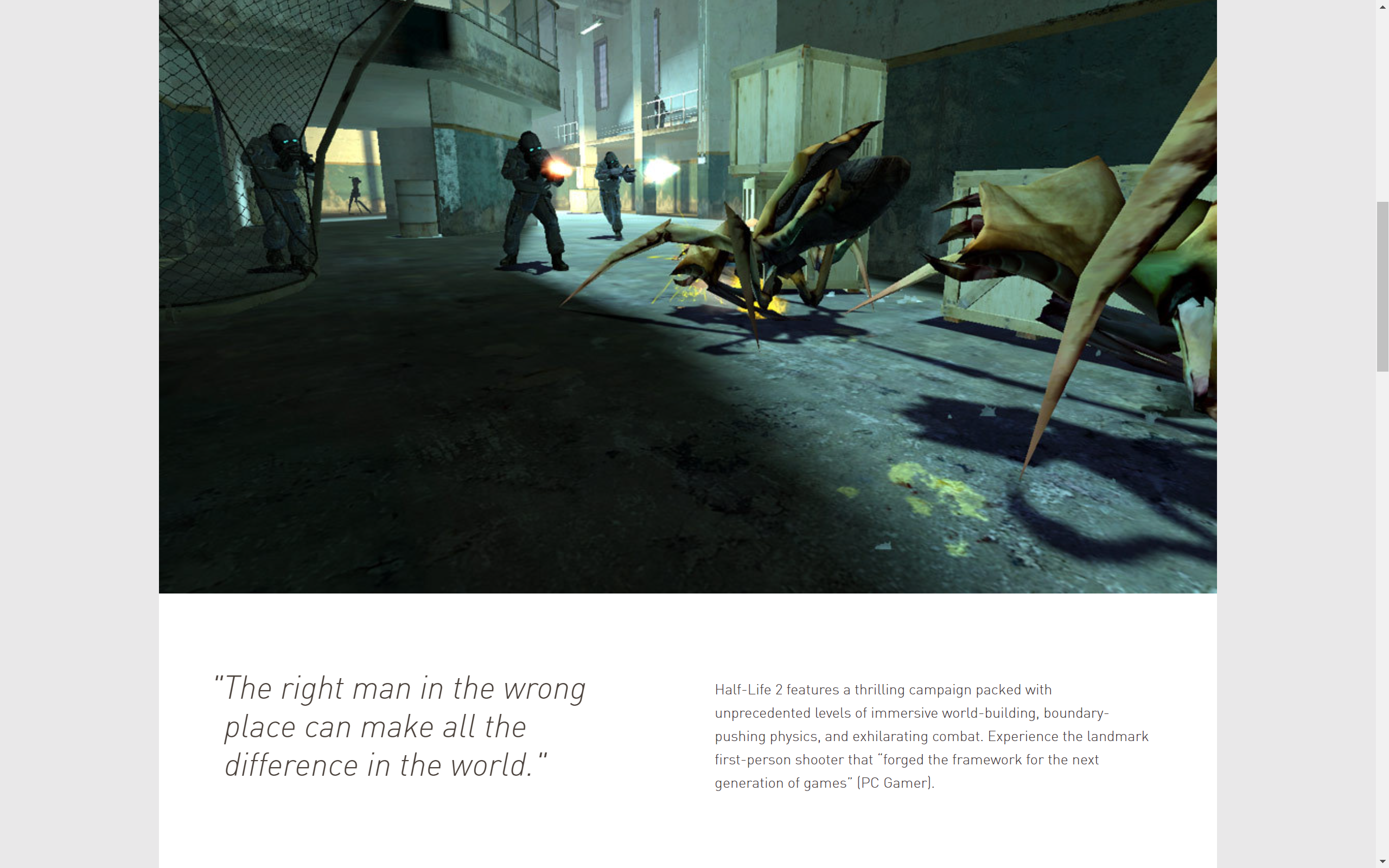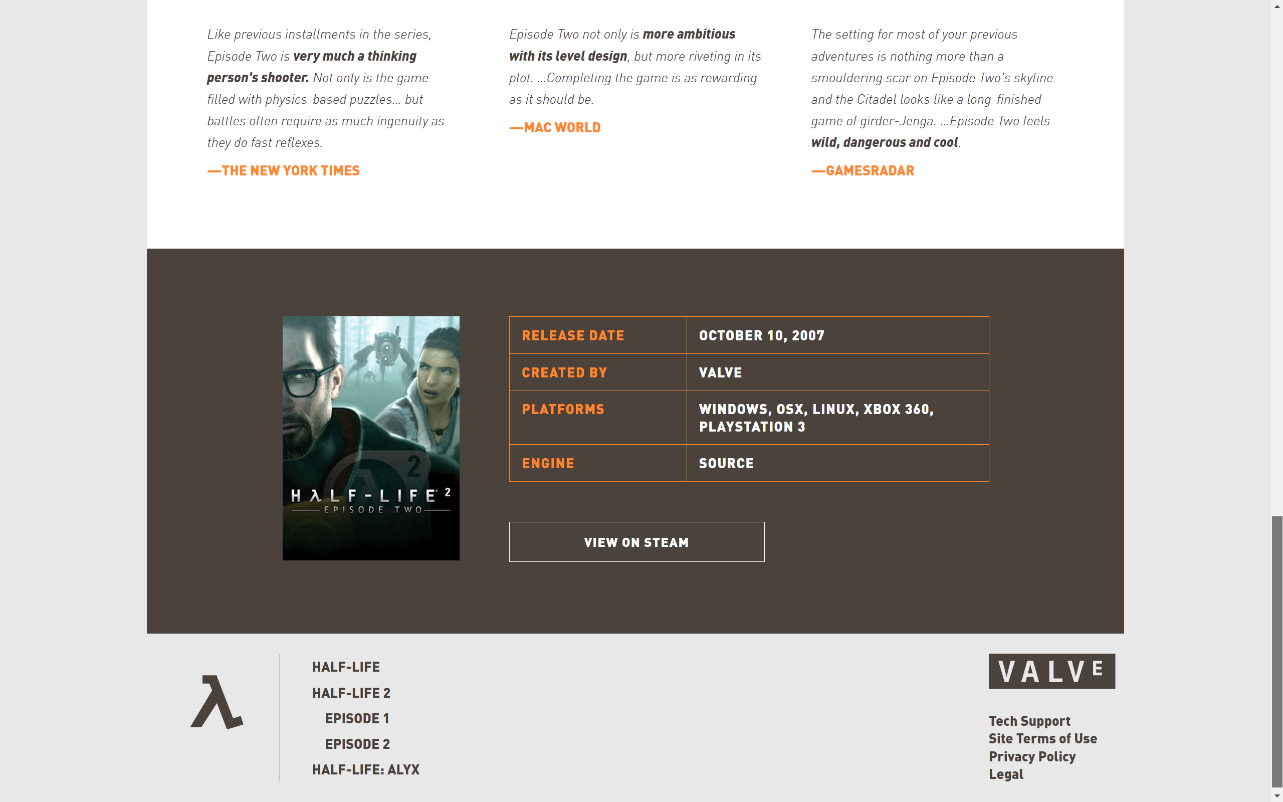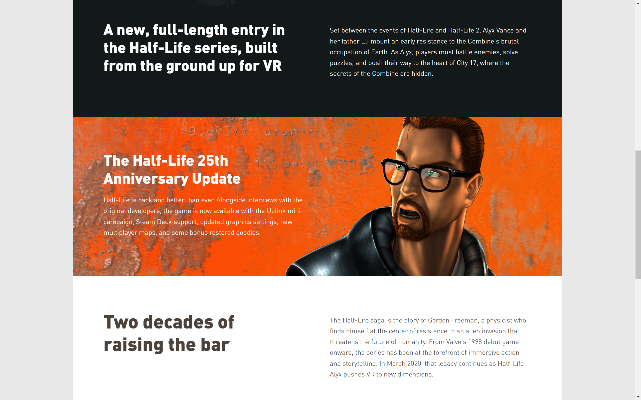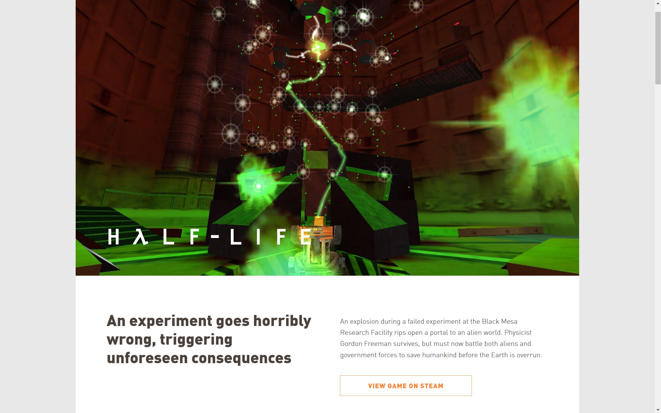 The Half-Life series was given its official website around late 2019 in preparation for Half-Life Alyx. The website uses a minimalistic style using orange as the key color, and that orange is core to the Half-Life brand. It uses FF DIN Black for big text, paired with Bold and Light for smaller text.