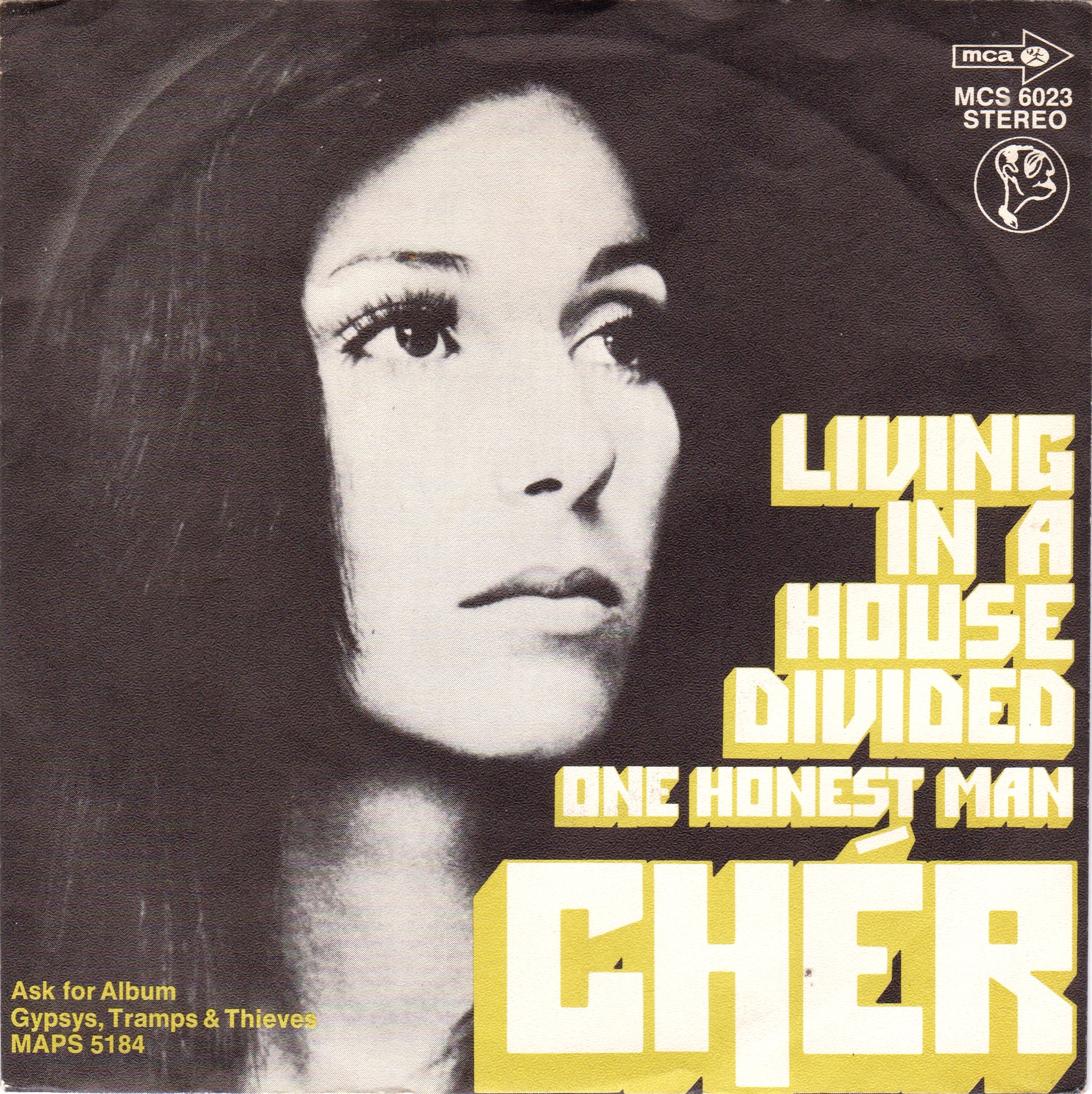 “Living in a House Divided” was released in February 1972, ahead of Cher’s eighth album Foxy Lady. The German single sleeve still advertises the previous album: originally released as Chér in September 1971, it was retitled to Gypsys, Tramps & Thieves. From Wikipedia: