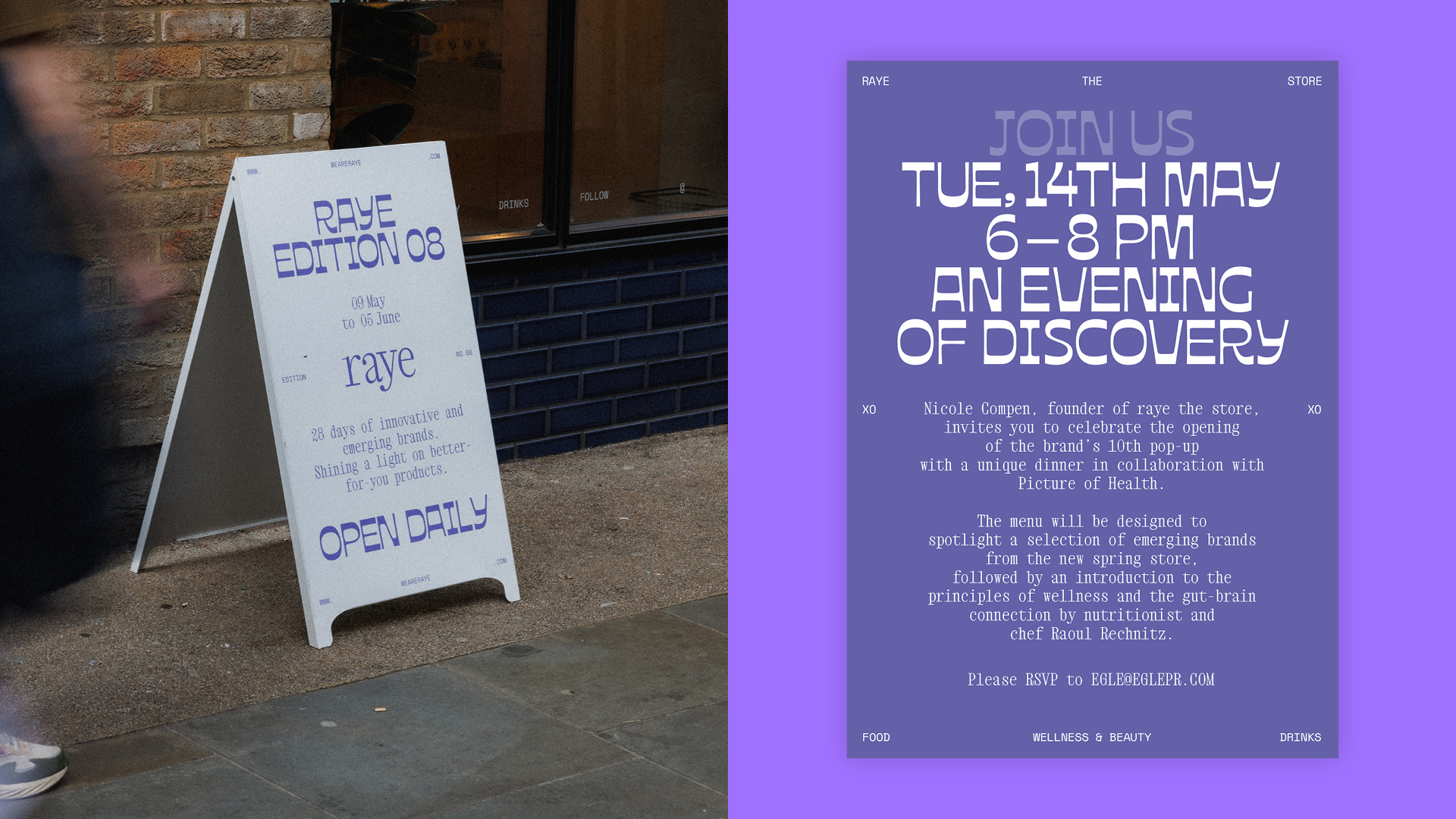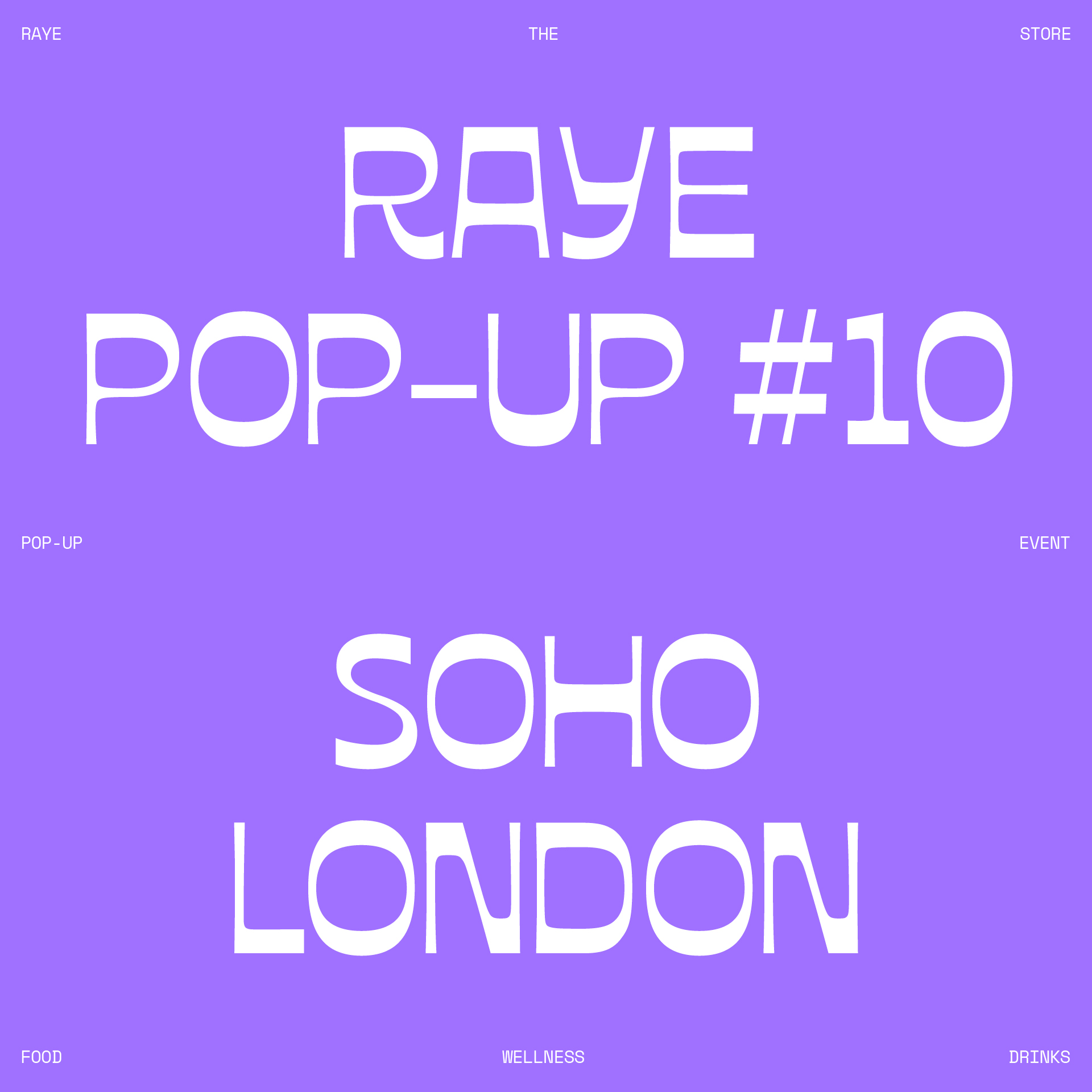 Raye the Store is a traveling pop-up shop showcasing a vast array of products from the most innovative and exciting food, drink, and wellness brands. Each edition features a unique color and font, ensuring a consistent brand identity while highlighting the latest product offerings.
