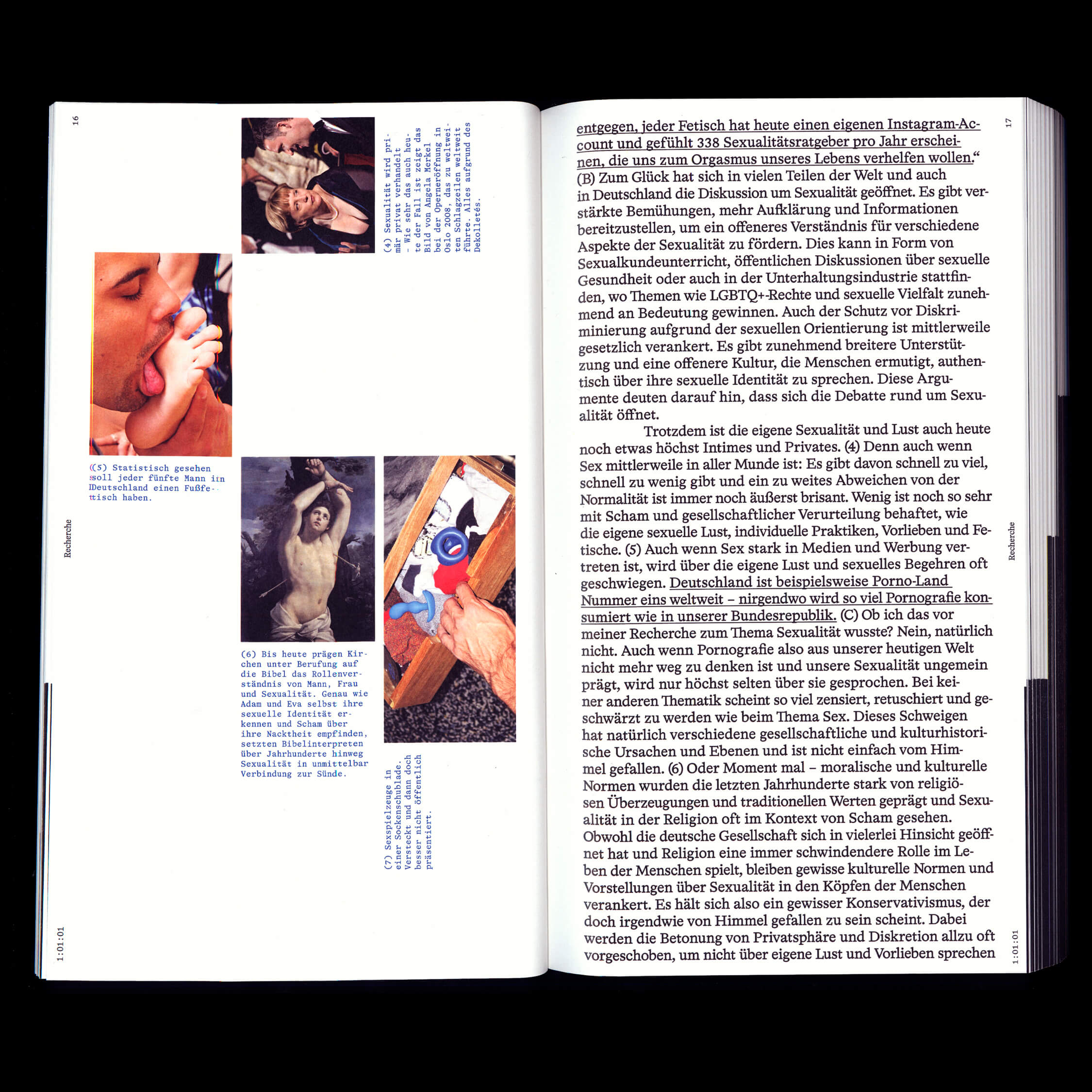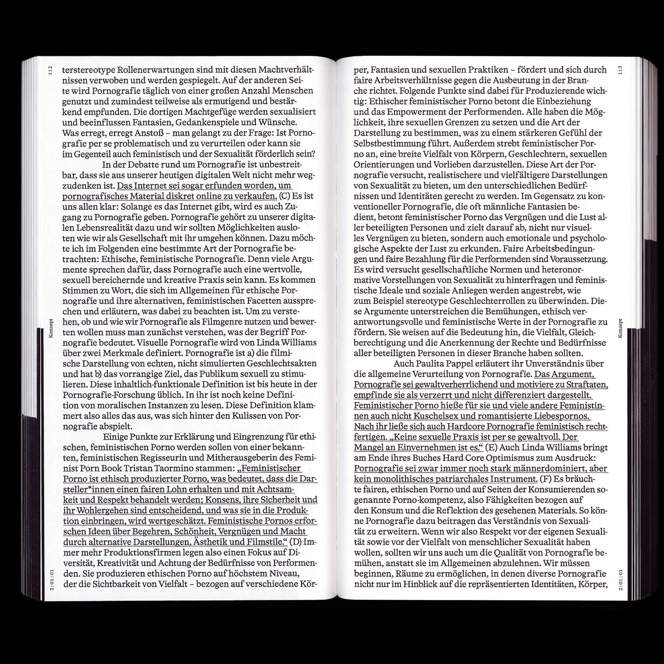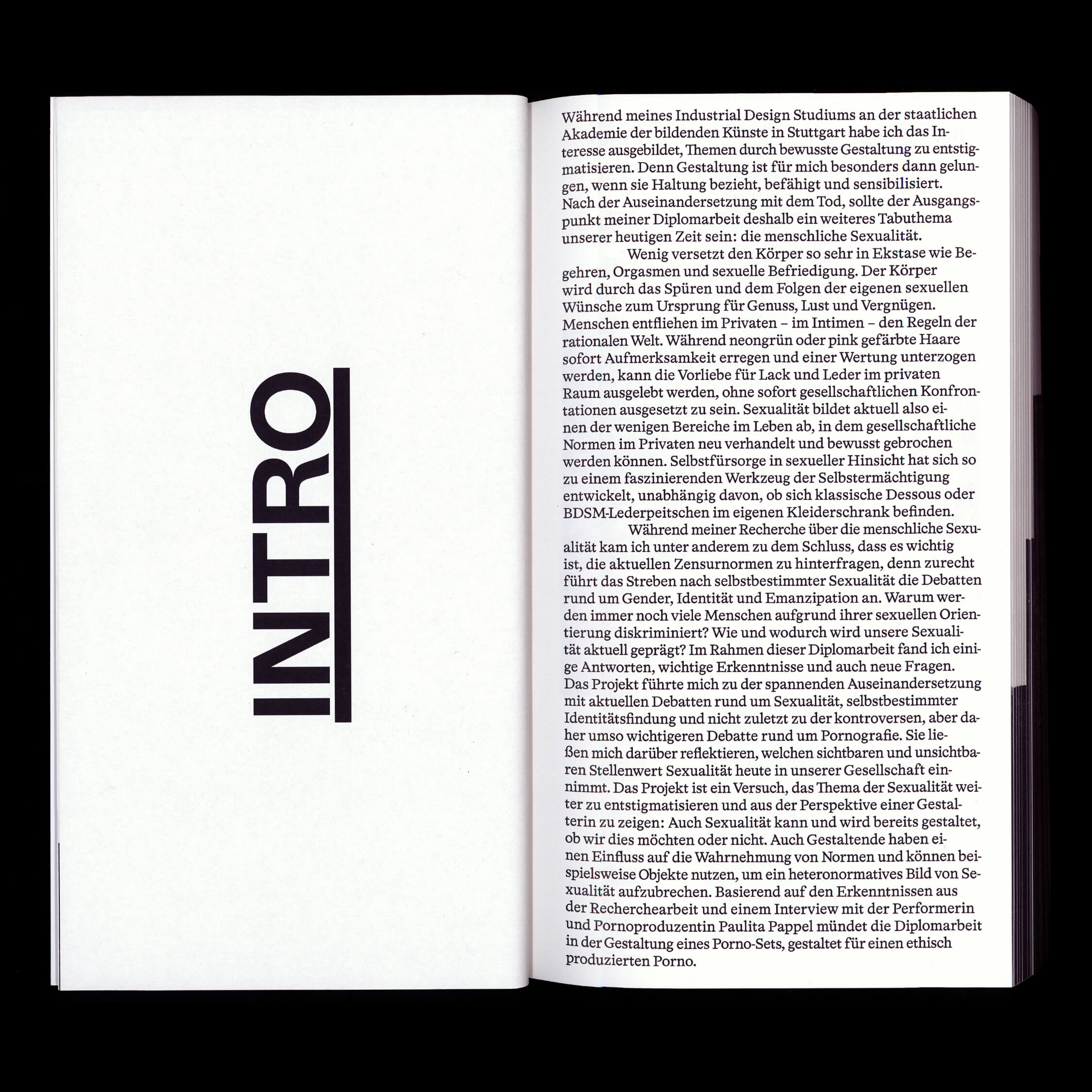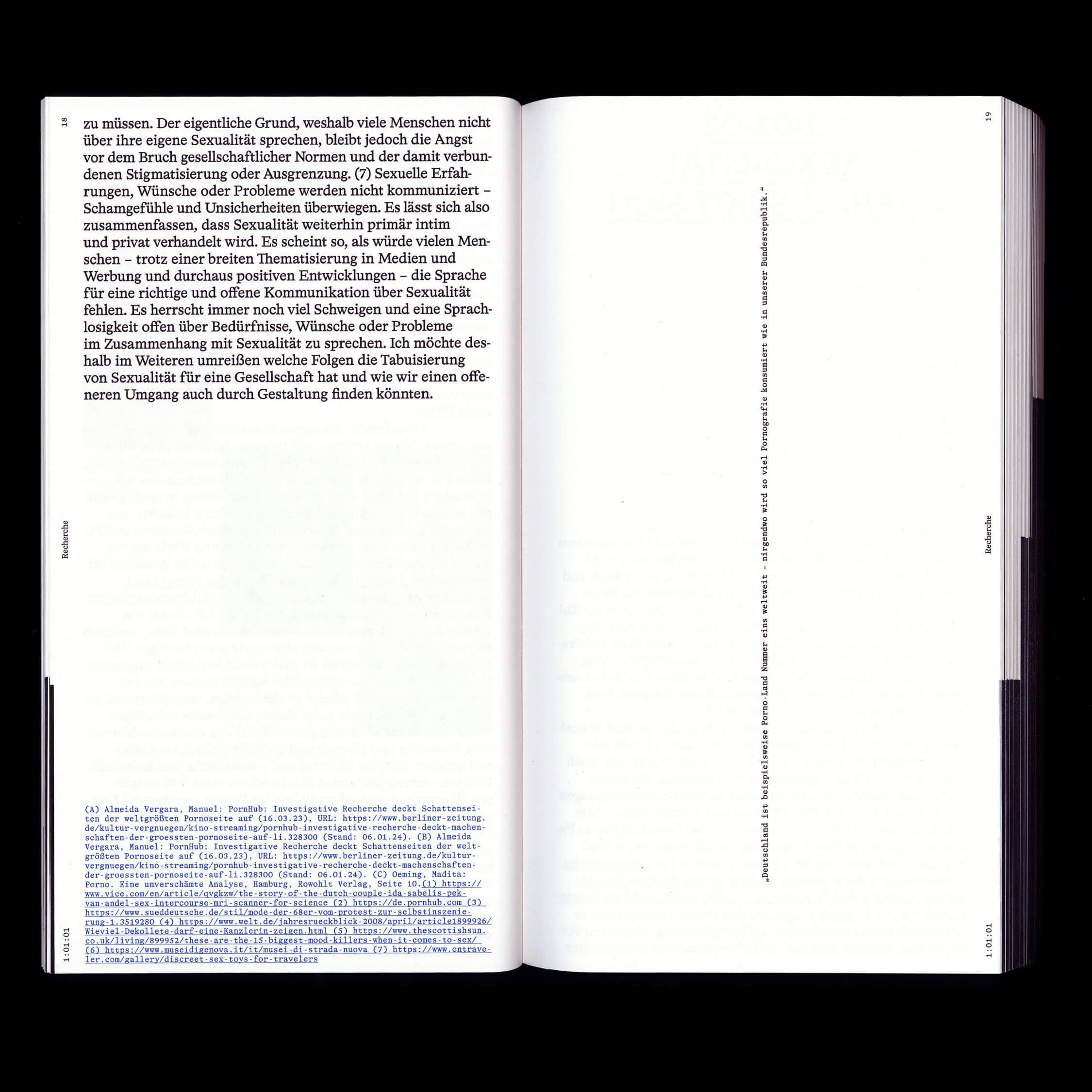 Emma Dreiucker and Jonathan Körner, both visual communication students in the class of Patrick Thomas at the State Academy of Art & Design Stuttgart, designed the diploma documentation of Luisa Antonia Beyer, titled Post Porn, which aims to question the taboos that surround the topic of human sexuality in today’s society (also featuring photography by Vanessa Ruckh). The 320-page book’s format is listed as 16:9/HD. The texts are set in Format Grotesk by Dominik Bissem and HAL Timezone (with Mono, published by HAL Typefaces.