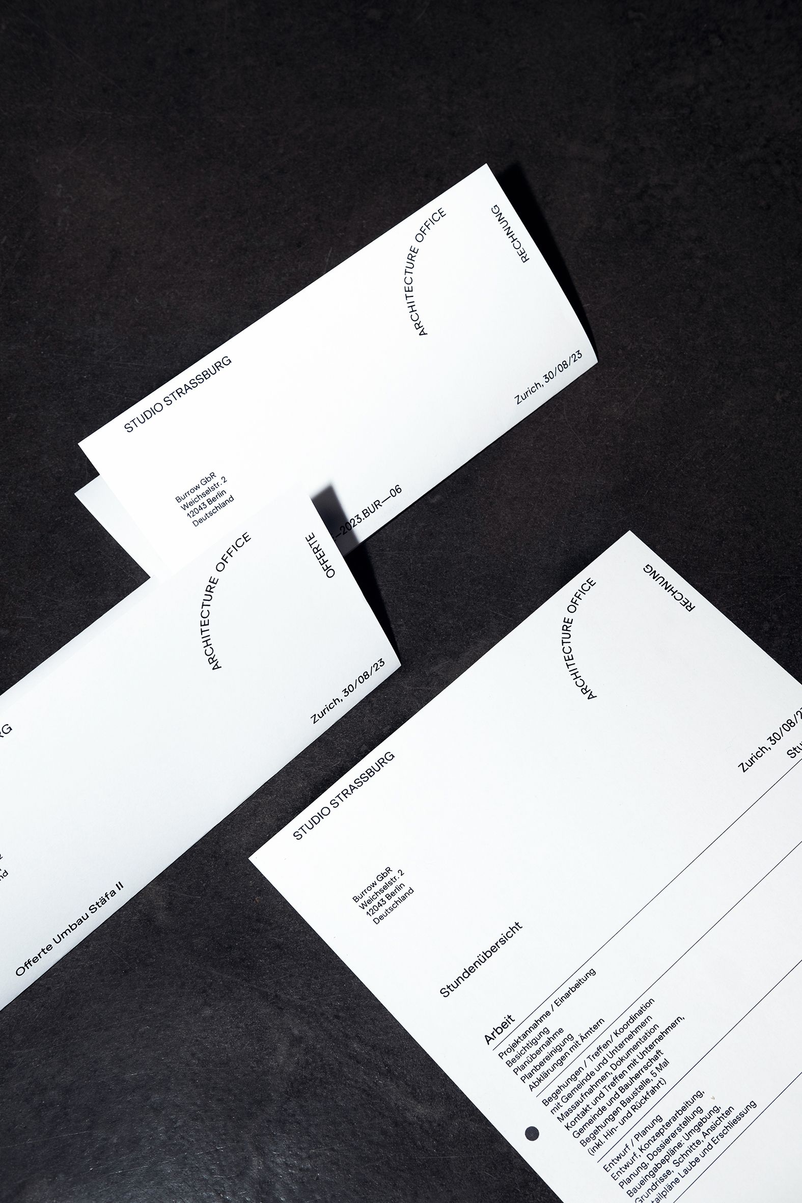 In addition to the website, Burrow developed a distinctive visual identity for Studio Strassburg. This branding project reflects the architecture studio’s focus on materiality, sustainability, and aesthetics. As part of this visual identity, Burrow produced a series of business cards printed in their screen-printing studio using Extraset’s elegant ES Klarheit Grotesk typeface.