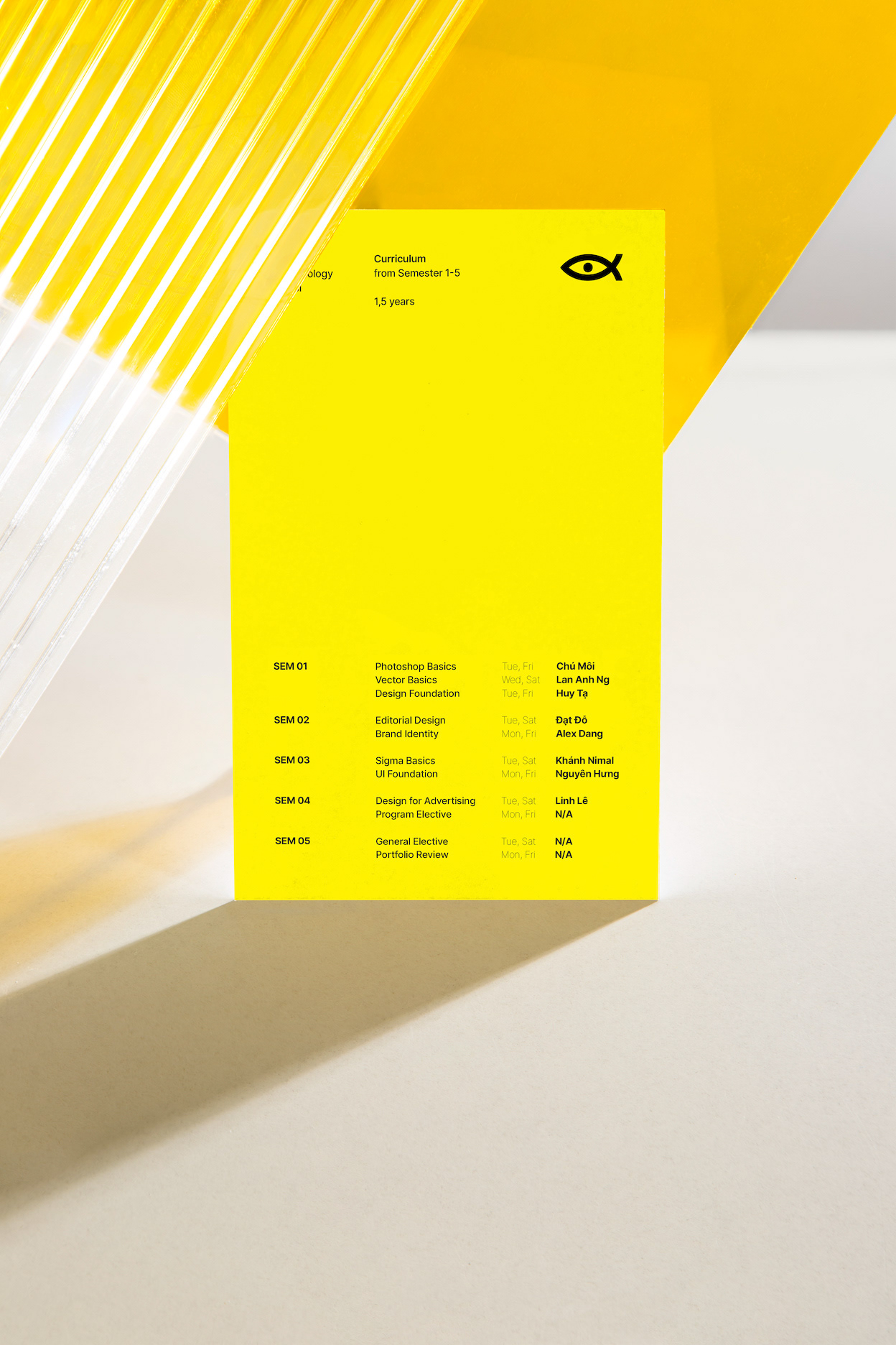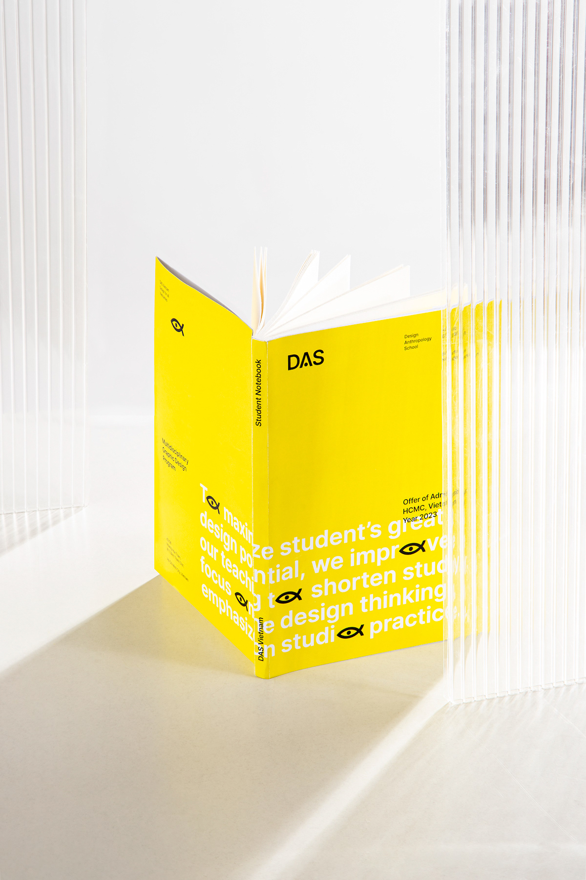 DAS nurtures students, symbolized as small fishes, providing the skills and confidence needed to navigate the design industry. In a flexible and creative learning environment, DAS guides students toward successful careers. The branding design, inspired by the school’s lenticular glass walls, reflects the ever-evolving nature of the industry. This visual metaphor highlights the need for adaptability and openness to change in the dynamic design landscape.