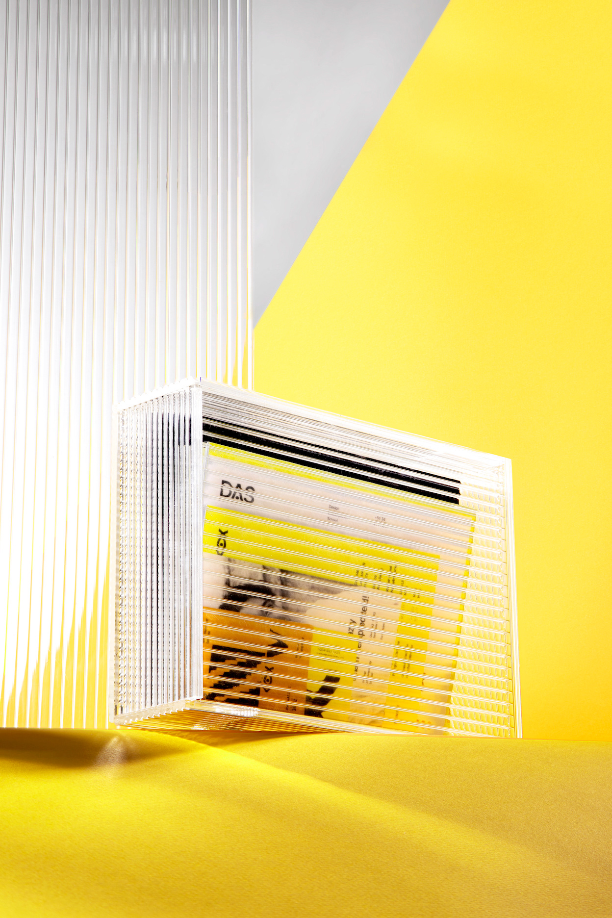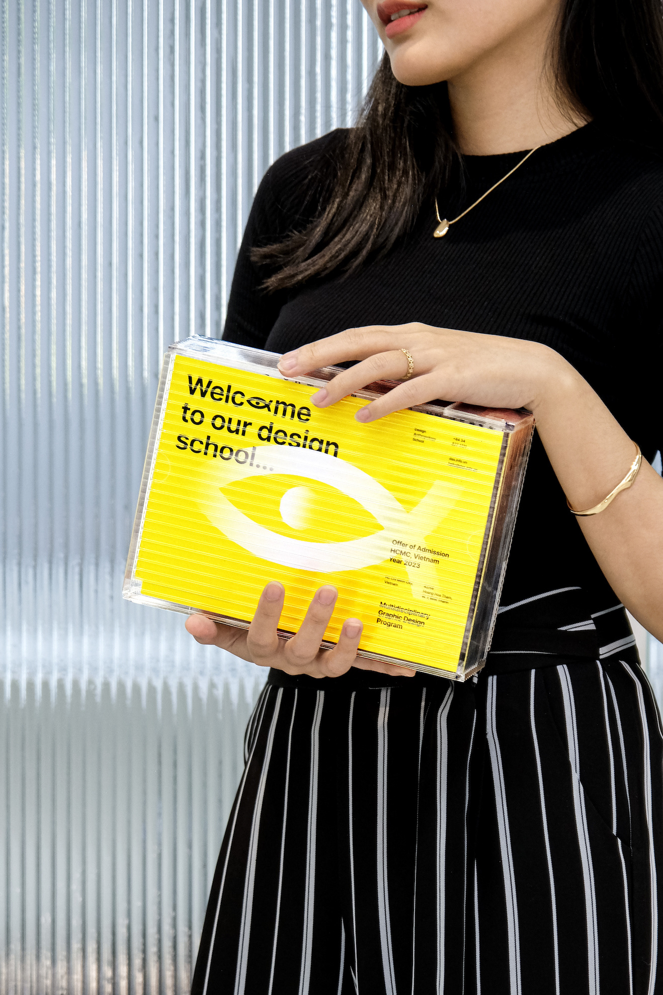 The lenticular glass sheet is a versatile material applied to various brand items such as gift boxes, coasters, and certificates. These designs further amplify the concept of transforming light and underscore the school’s dedication to producing visually dynamic and innovative designs.