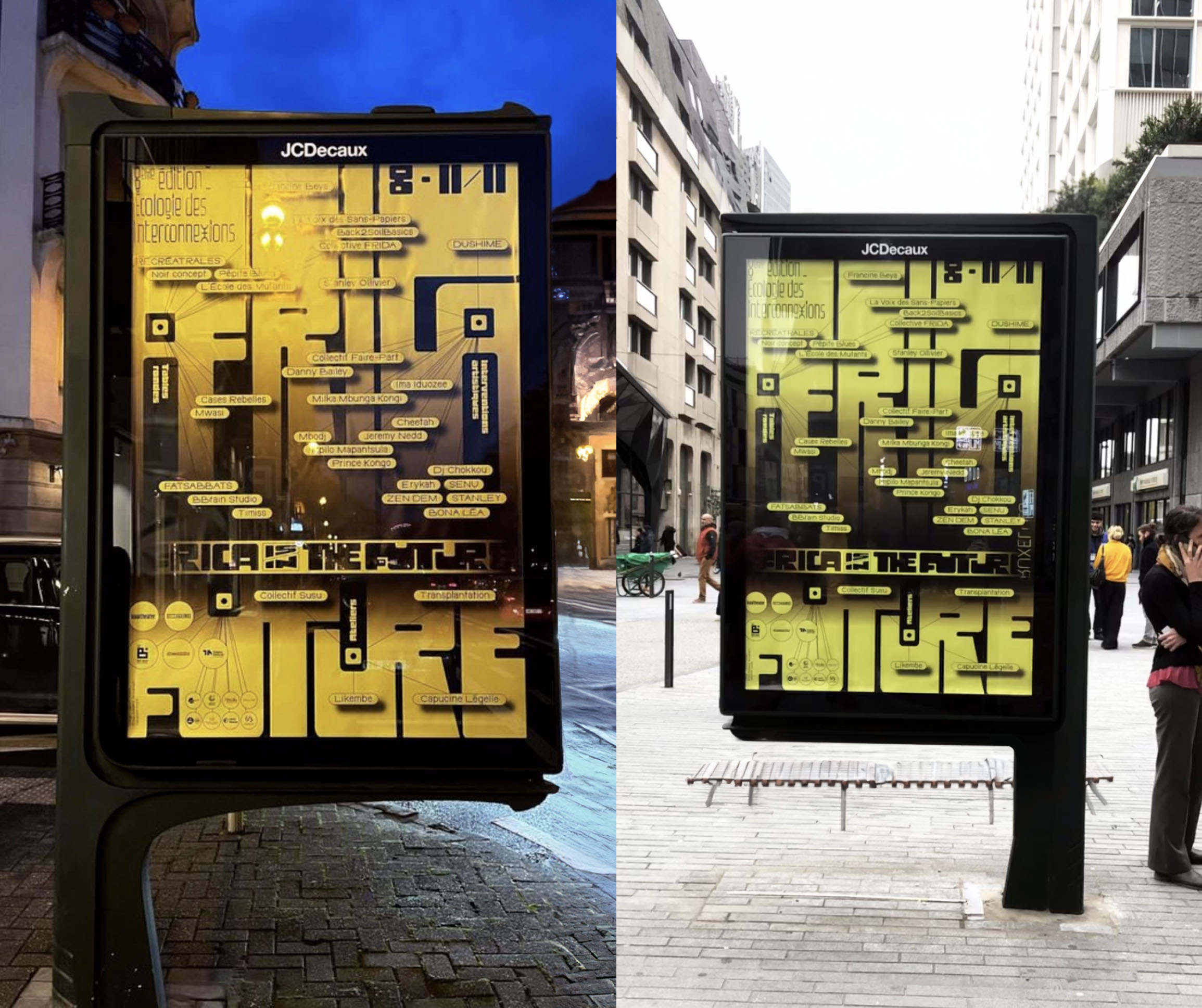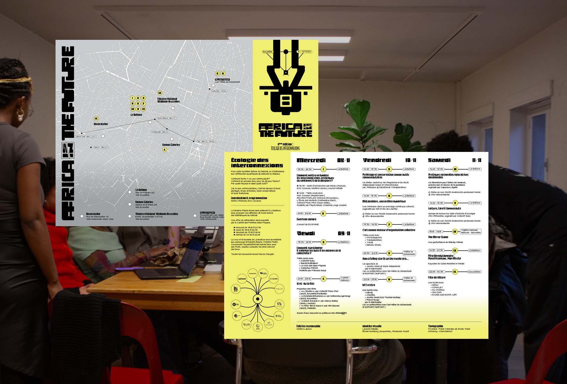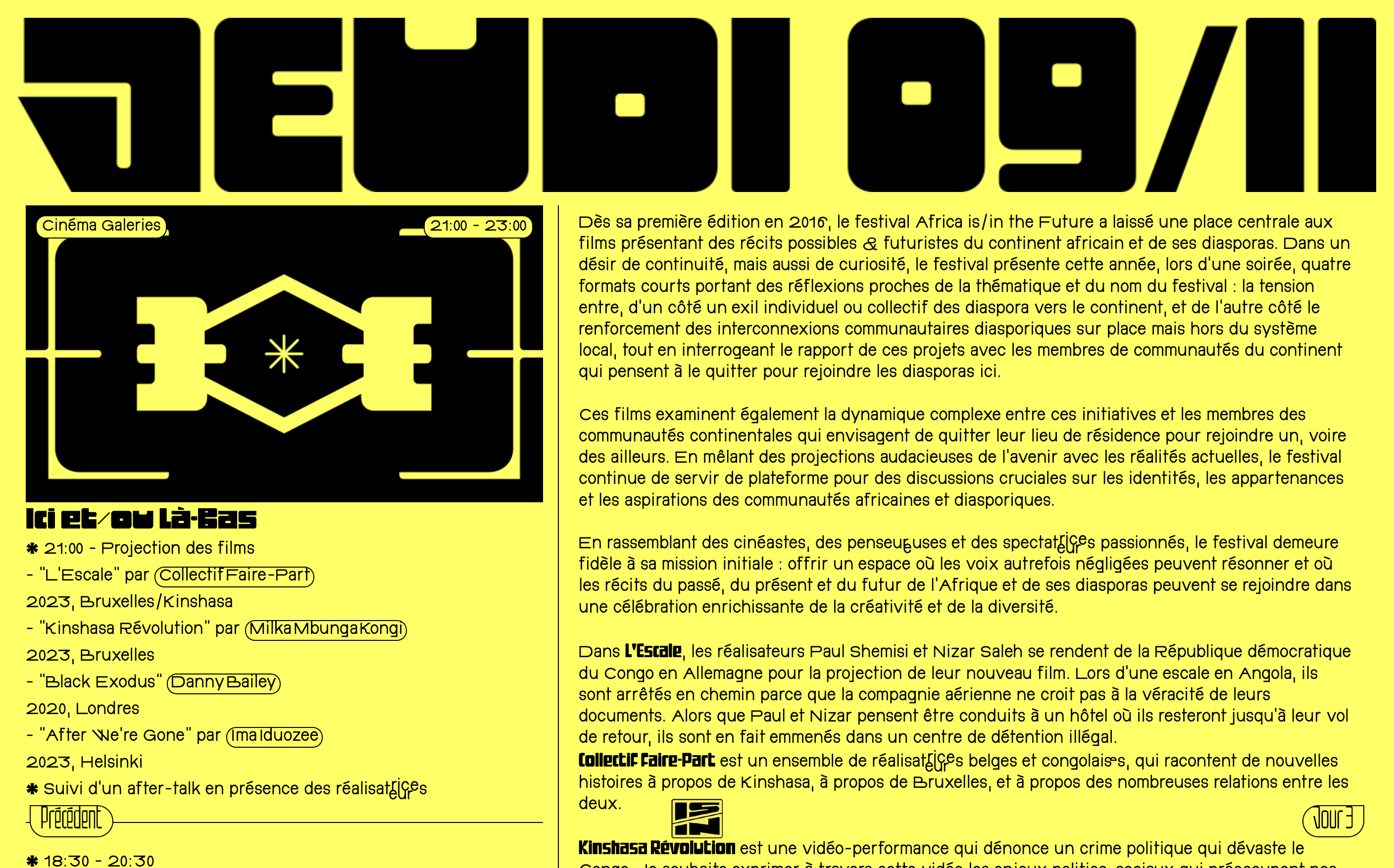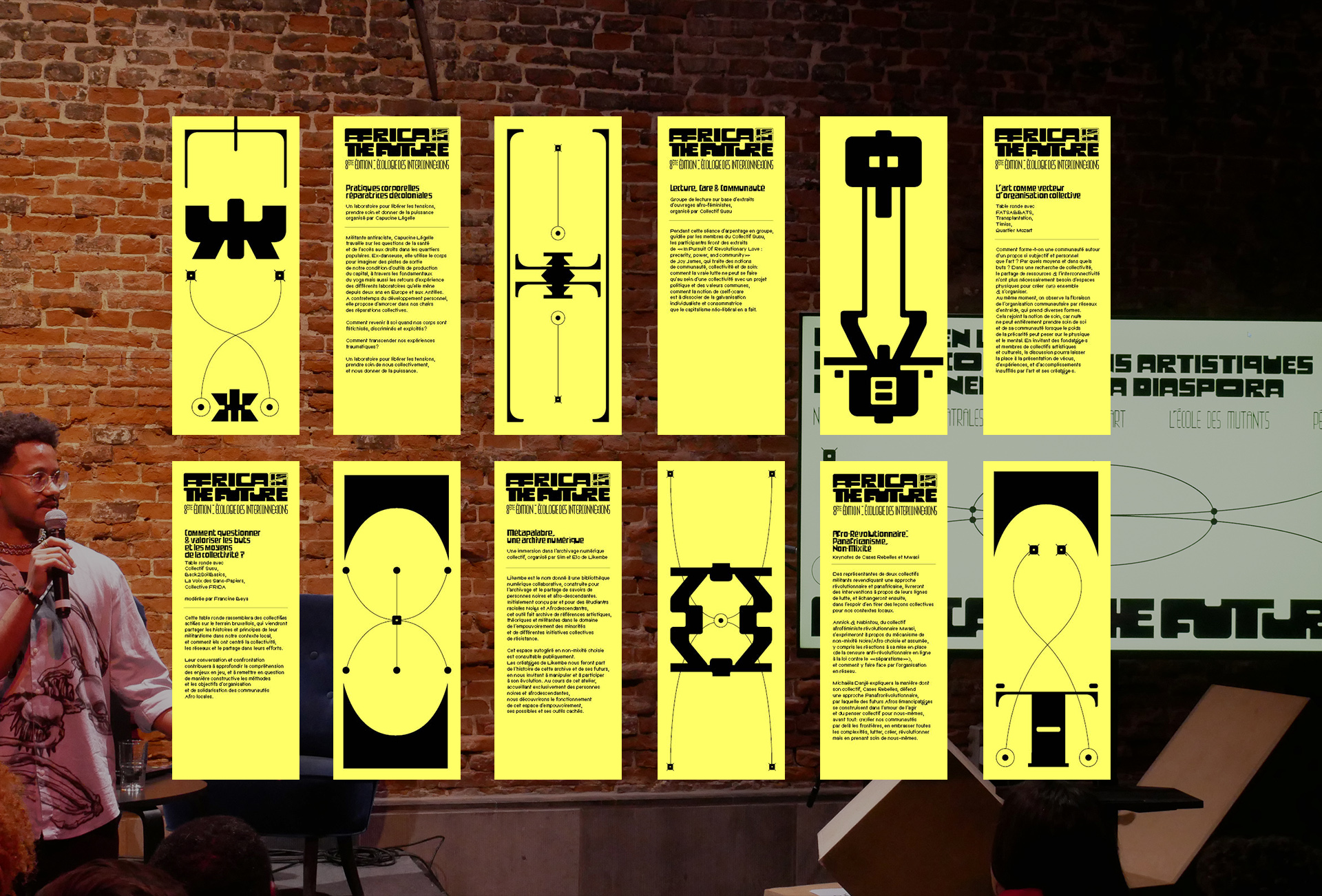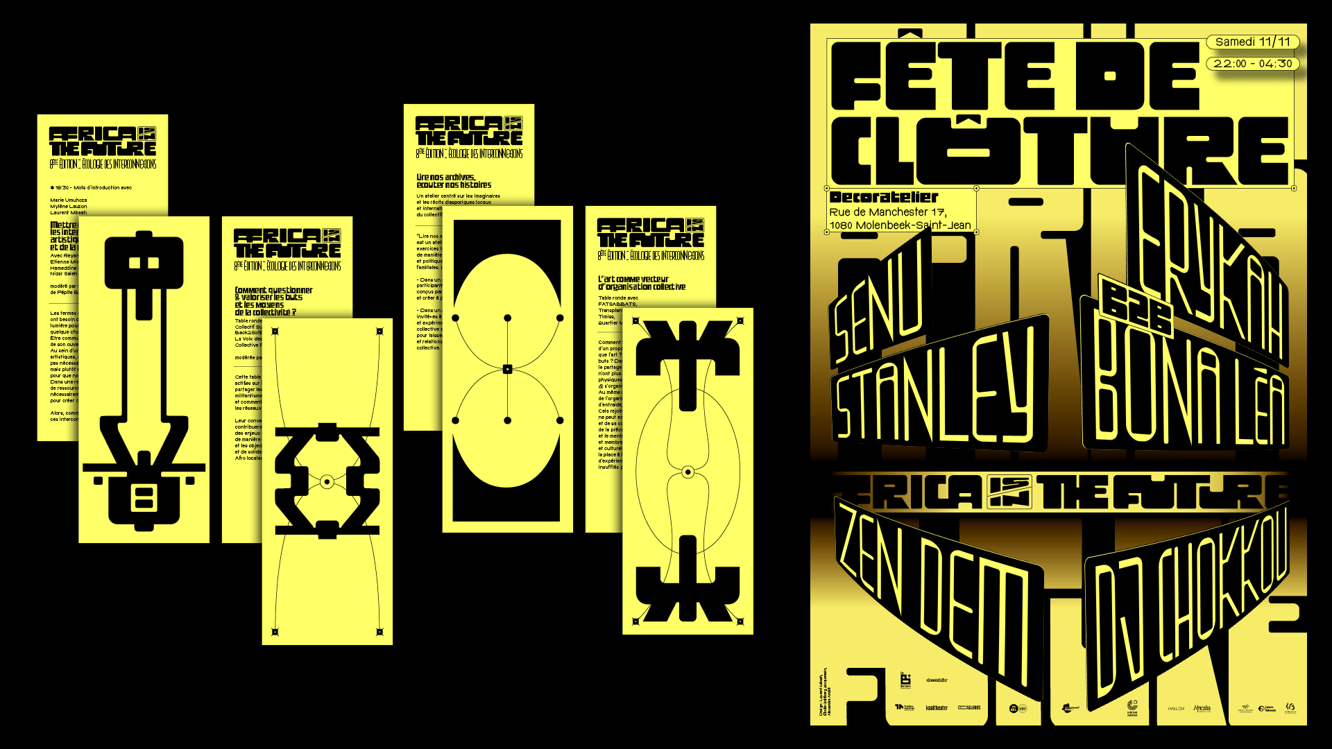 Africa is/in the Future is a festival that takes place in Brussels since 2016. It’s dedicated to showcasing multidisciplinary productions from African and Afro-descendants artists and creators. For the 2023 edition, the festival invited Laurent Mbaah (a.k.a. Simio, a.k.a. Chimères) to create their communication. He partnered with Elodie Goldberg Jacquemain and Alexandre André to create an identity based on a strong yellow/black/white triad.