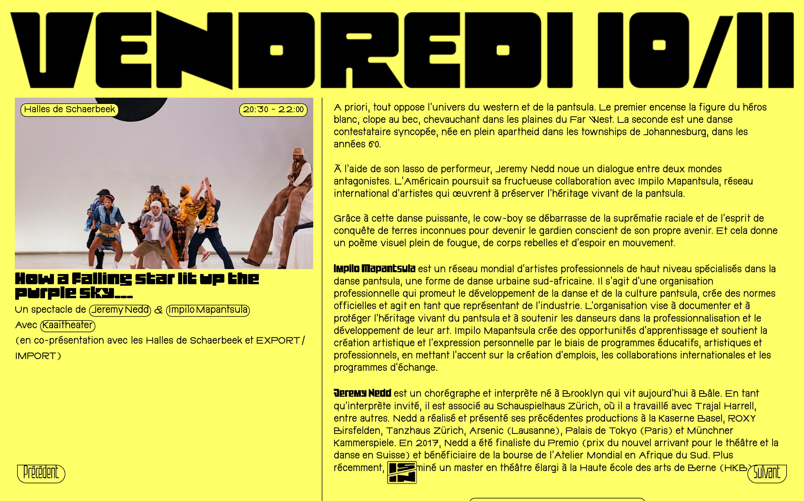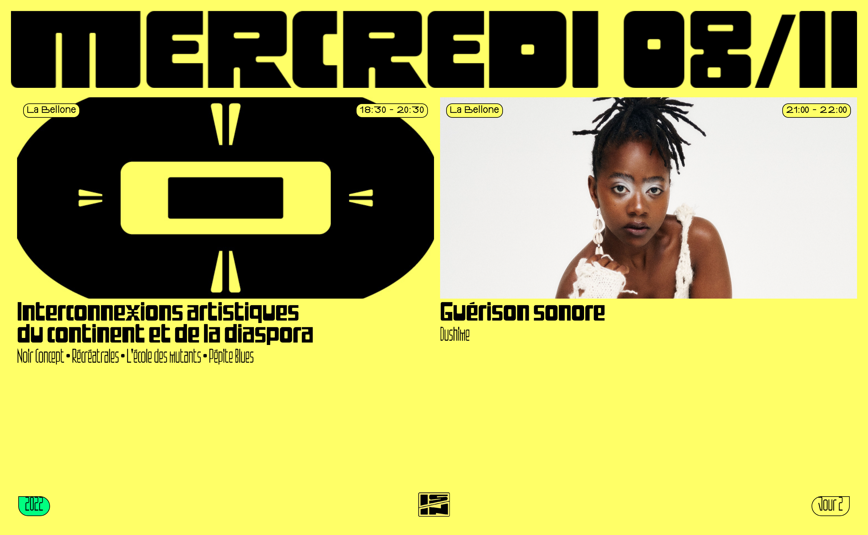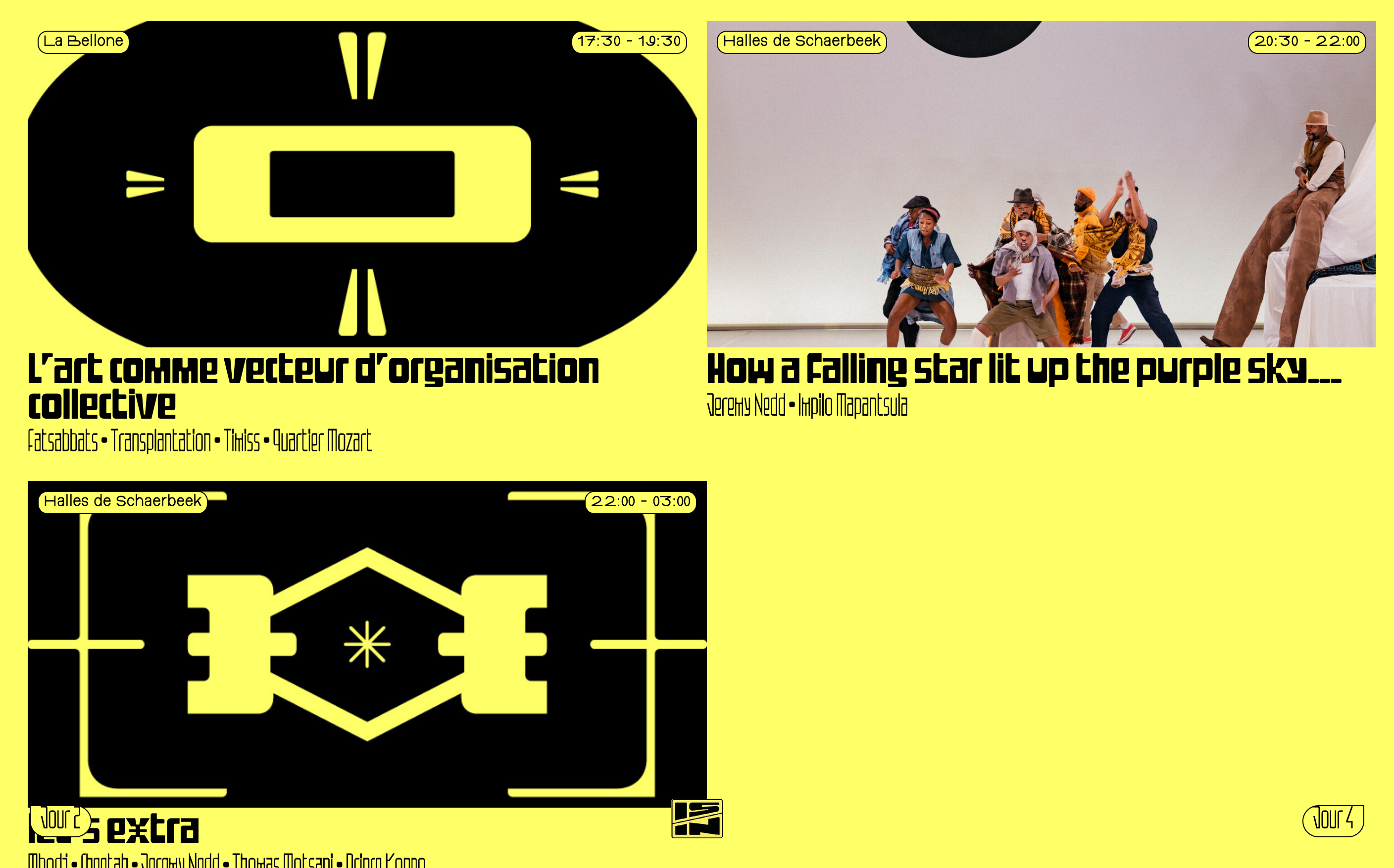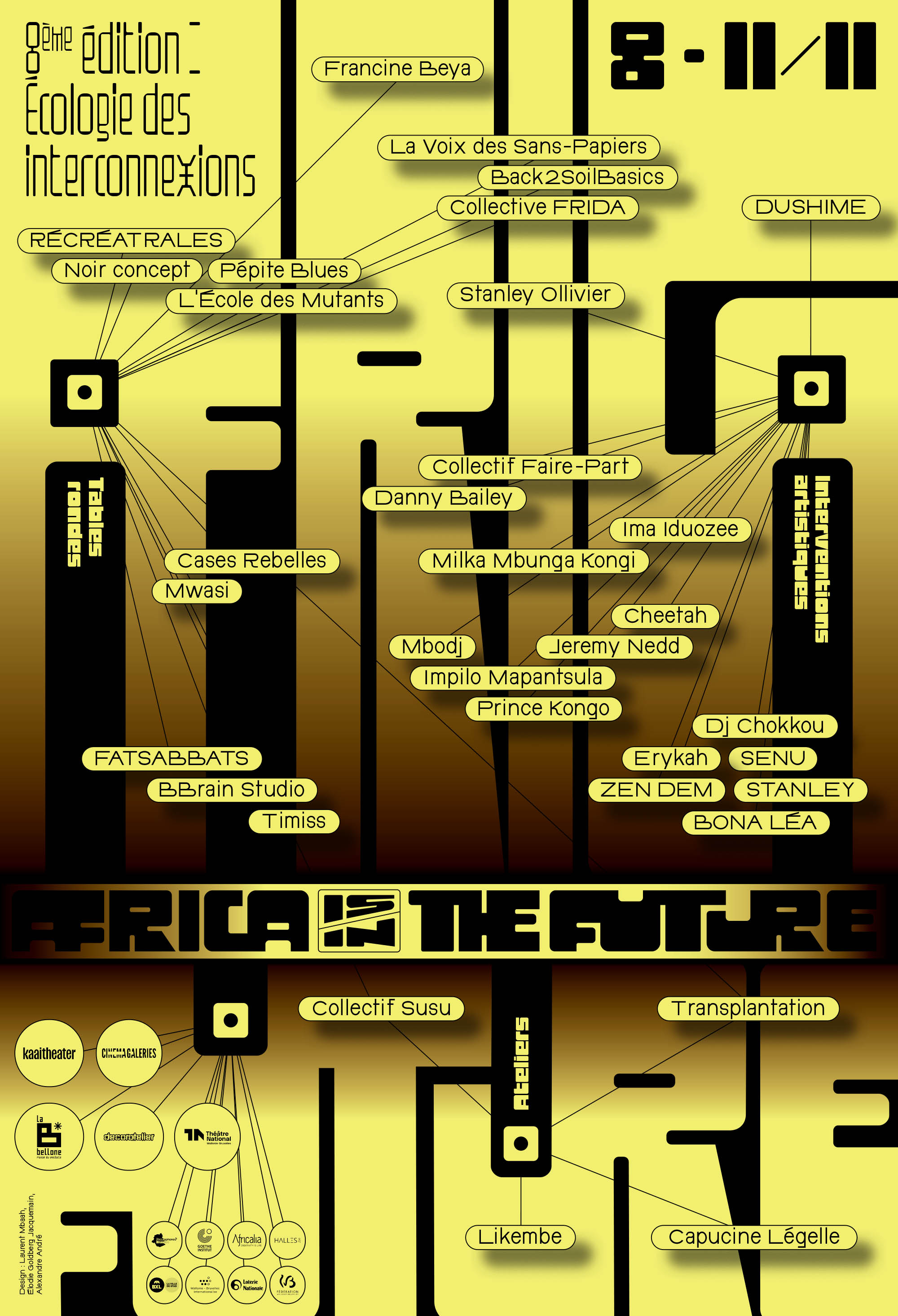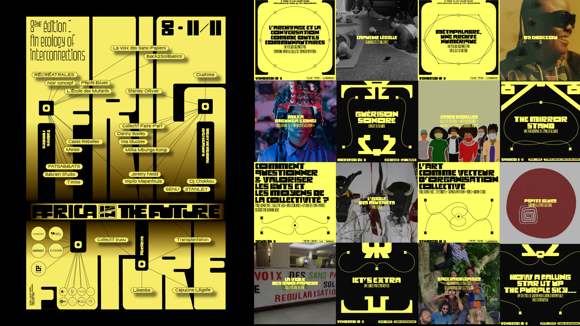 Africa is/in the Future is a festival that takes place in Brussels since 2016. It’s dedicated to showcasing multidisciplinary productions from African and Afro-descendants artists and creators. For the 2023 edition, the festival invited Laurent Mbaah (a.k.a. Simio, a.k.a. Chimères) to create their communication. He partnered with Elodie Goldberg Jacquemain and Alexandre André to create an identity based on a strong yellow/black/white triad.