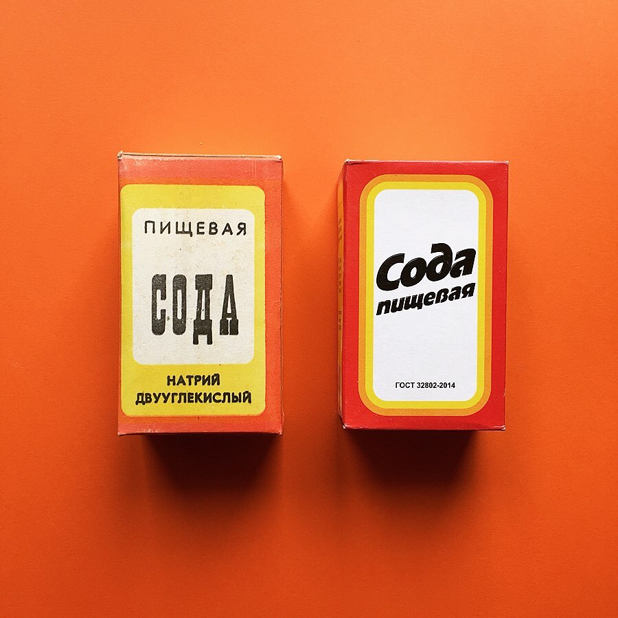 This pack of baking soda as sold in Russia and previously in the USSR has a recognizable design and is considered just as iconic as the packaging designs for salt, sugar and Indian tea. The manufacturer is the Bashkir Soda Company, located in the city of Sterlitamak in the Republic of Bashkortostan, Russian Federation. Today T-shirts and various other items not related to the food industry are being produced with a similar design. The product is still being sold with minor changes to the packaging design.