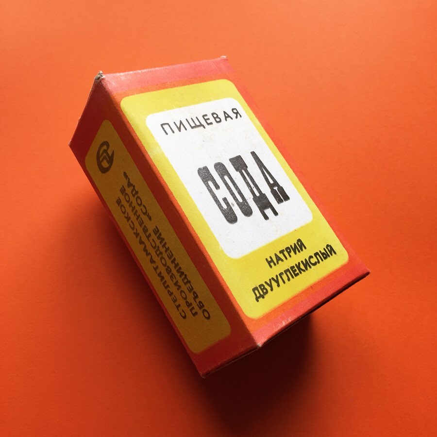 There are three main types of design: the one used during Soviet times, a Russian one, and a more recent redesign. In the USSR design, the product name “СОДА” is in a Cyrillic version of a French Clarendon. Italiennes Étroites comes close in terms of proportions and the low bar in A. It’s unclear if this is lettering or a typeface. The text “натрий двууглекислый” (“sodium bicarbonate”) is written in the typeface Zhurnalnaya Roublennaya, which is a Cyrillic extension of Erbar-Grotesk.