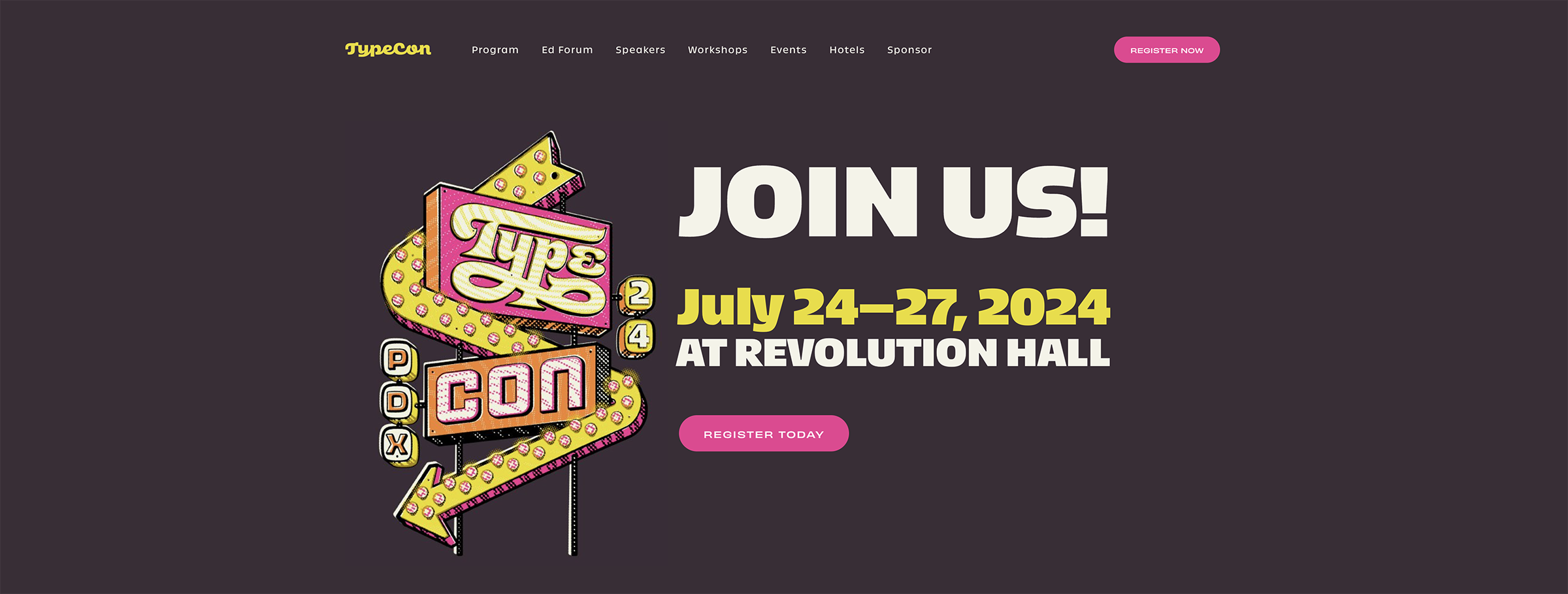 Finally, the 2024 TypeCon website also uses Obviously (OH no Type Co) for “call to action” text on buttons, and Yumex Script in the header.