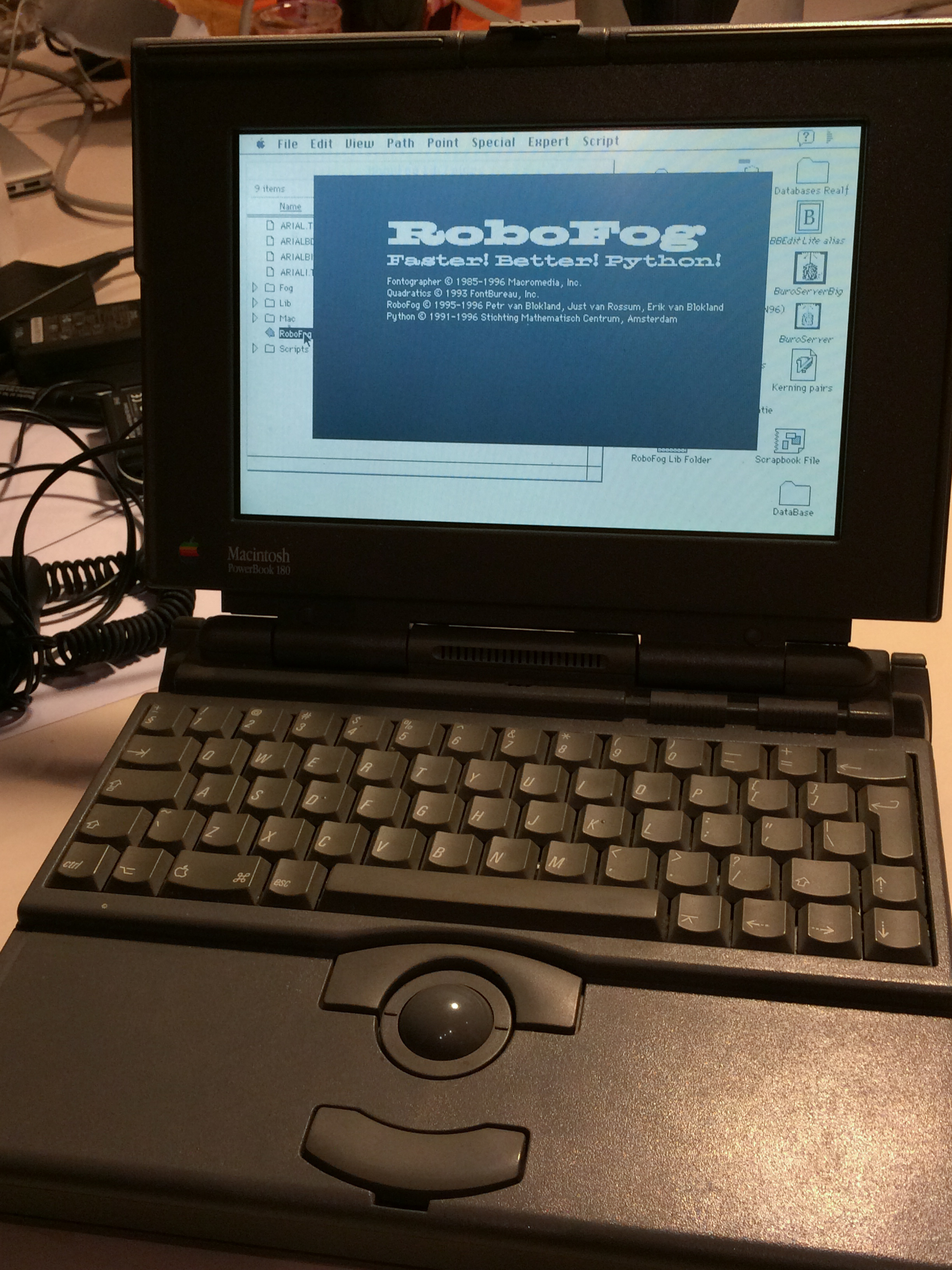 RoboFog on a PowerBook 180 Contributed by Frank Grießhammer on Mar 20th, 2014. Artwork published in 1995. Photo: Frank Grießhammer. License: All Rights Reserved. From a memorable night at one of Petr van Blokland’s classes, at his studio in Delft. Chicago (UI) Zapata (Splash Screen) Apple Garamond (Badge) Univers Condensed Light Oblique (Keyboard) Typefaces More about ChicagoMore about LTR Slab ExtendedGet LTR Slab ExtendedMore about Apple GaramondMore about UniversGet Univers Formats Object/Product (1142) Software/Apps (365) Topics Technology (1481) Designers/Agencies Erik van Blokland (4) Susan Kare (4) Tagged withRoboFog (1)user interfaces (UI design) (296)Apple (42)Macintosh (1)laptop computer (1)computer (1)Powerbook (1)splash screens (2)font editor (1)apps (232)uses by the typeface’s designer (1271)black and white (2020) Artwork location Netherlands (1089) Delft (5) In Sets Post a comment Name Email – will not be published Website Your response Submit Comment More Chicago in use Apoptygma Berzerk – “Kathy’s Song (Come Lie Next to Me)” single covers2000Union DesignEGZHalvor BodinContributed by D JonesStockmarket(Sample unavailable) Macintosh Graphics in Modula-2 by Russell L. Schnapp1986Russell L. SchnappContributed by D Jones Rolling Stone, The Rise and Fall of Apple Inc.1996Fred WoodwardLee BearsonContributed by Stephen Coles Sponsor More in Technology Hexac. 2017VincrossContributed by JAF V.H. Belvadi website (2023)2023V.H. BelvadiContributed by V.H. Belvadi Medialab Katowice Report2013Paulina UrbańskaZofia OslisloContributed by TypeTogether Rip Cord arcade flyer1979unknownContributed by Patrick Concannon More in Object/Product Mille Bornes Card Game (1960 Edition Spécial)1960Pierre PraquinContributed by Stephen Coles Staff Pick FIBER FONTS A–Z (H–M)2024Jocelyn LauContributed by Jocelyn Lau “L’amour Toujours” scarf by Azuliq Type2023Markus AbtsContributed by Markus Abts Electronic Skeet Shoot game by Tiger Electronics1987unknownContributed by Bryson Stohr More Fonts In Use Disneyland Space Mountain promotional poster, flyer, bumper sticker1977unknownContributed by Patrick Concannon Staff Pick MNGLT – Pure album art2022Atelier AAAAAContributed by Jérémy Landes (Studio Triple) Staff Pick The Social Network2010Neil KellerhouseContributed by Stephen Coles Blog Bell Laboratories Directory July 1973c. 1973unknownContributed by Jason Timmons Staff Pick