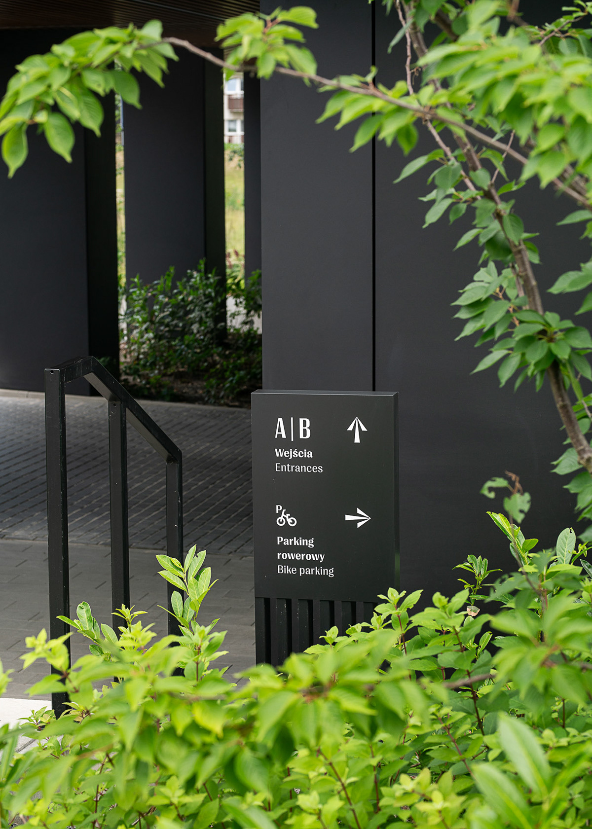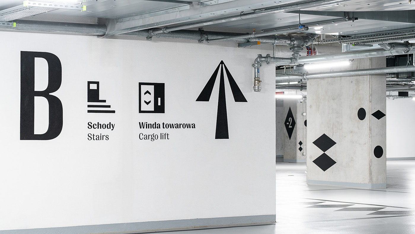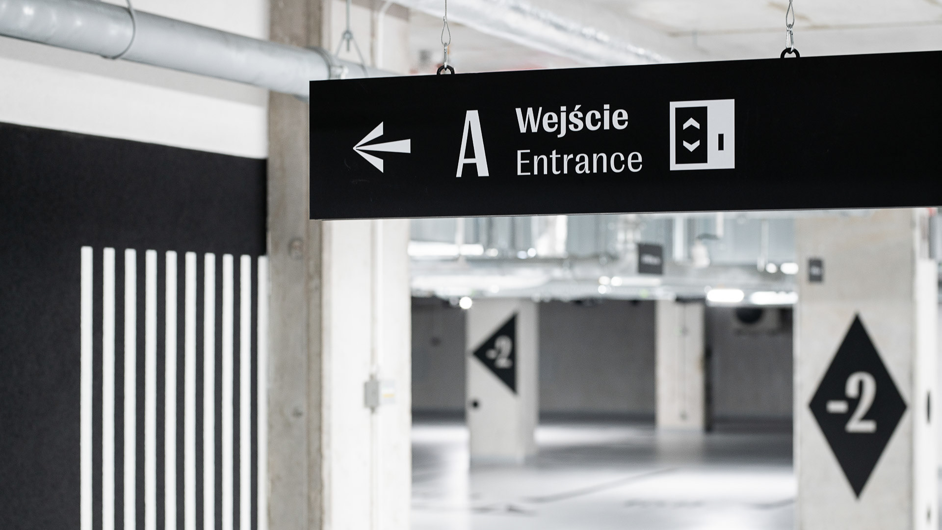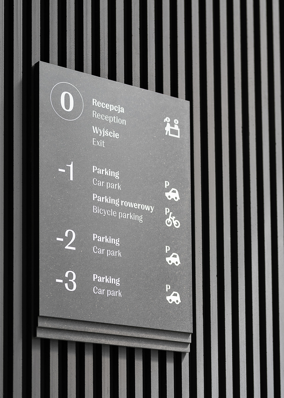 Lakeside is a complex of office buildings within the Mokotow district in Warsaw, Poland. It has already received BREEAM pre-certification at the “Outstanding” and WELL pre-certification at the “Gold” level at the design stage. WELL certification is the world’s first certification system in which buildings are evaluated for their impact on the health and well-being of the people who use them. It focuses on the use of a range of solutions that have a positive impact on the well-being, overall health, satisfaction and productivity of employees. Our wayfinding has become its complement. Graphics in common spaces build a welcoming atmosphere and make it easy for users to navigate the complex facility.