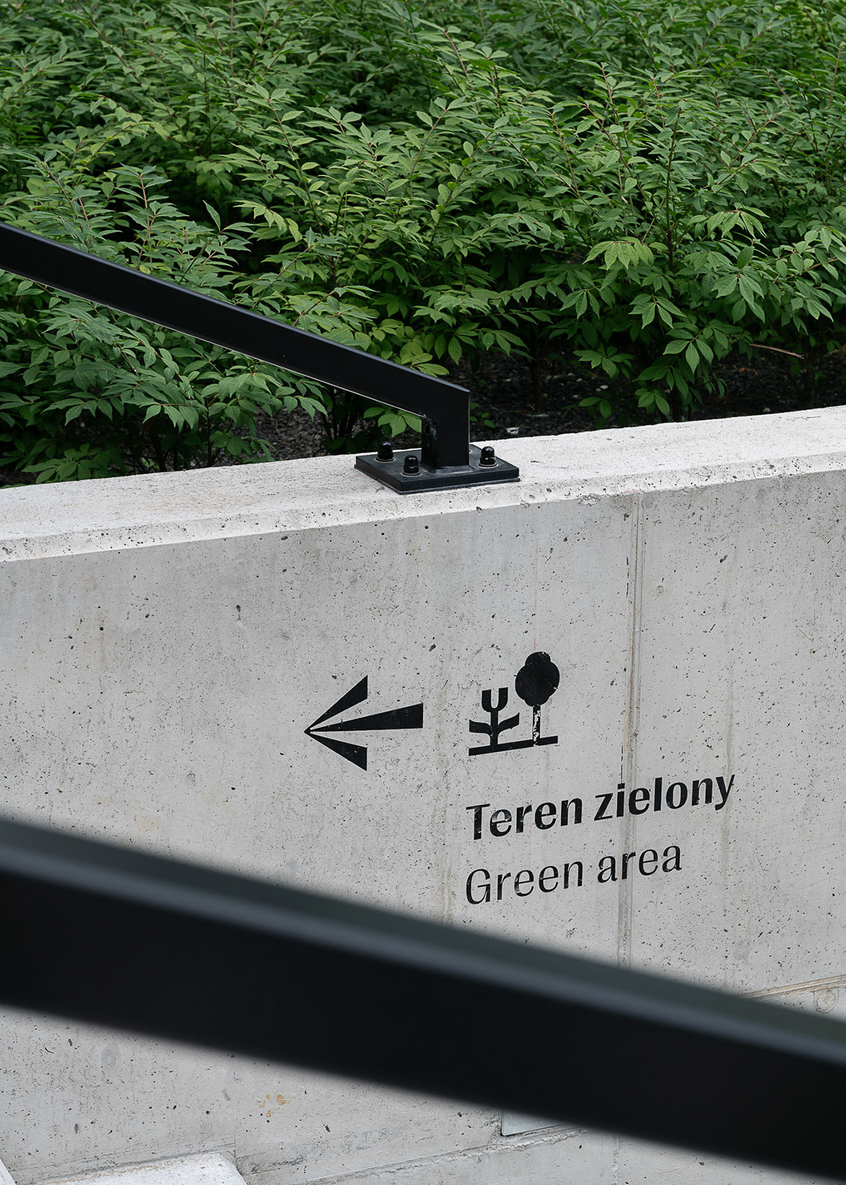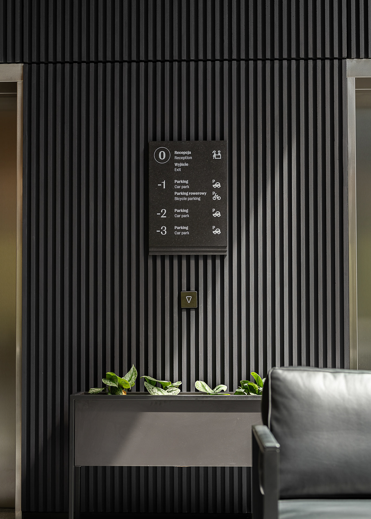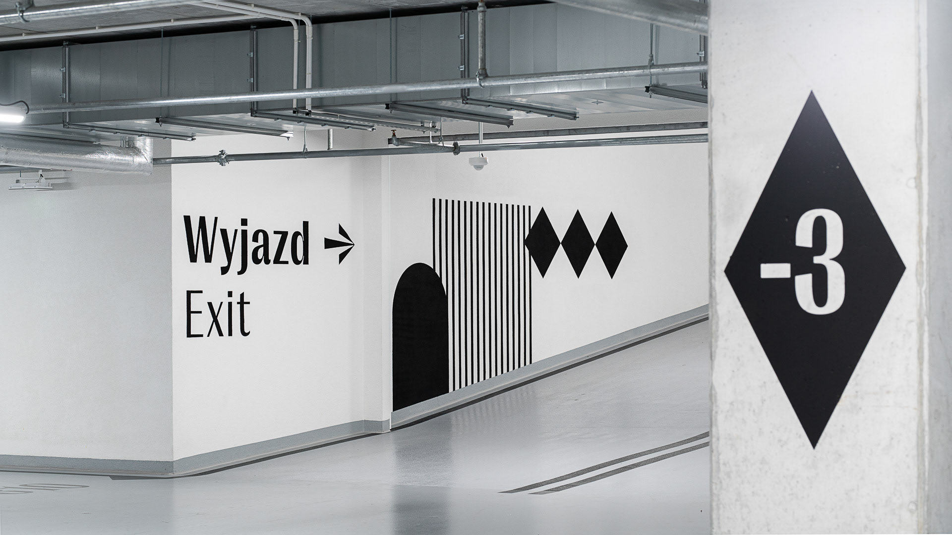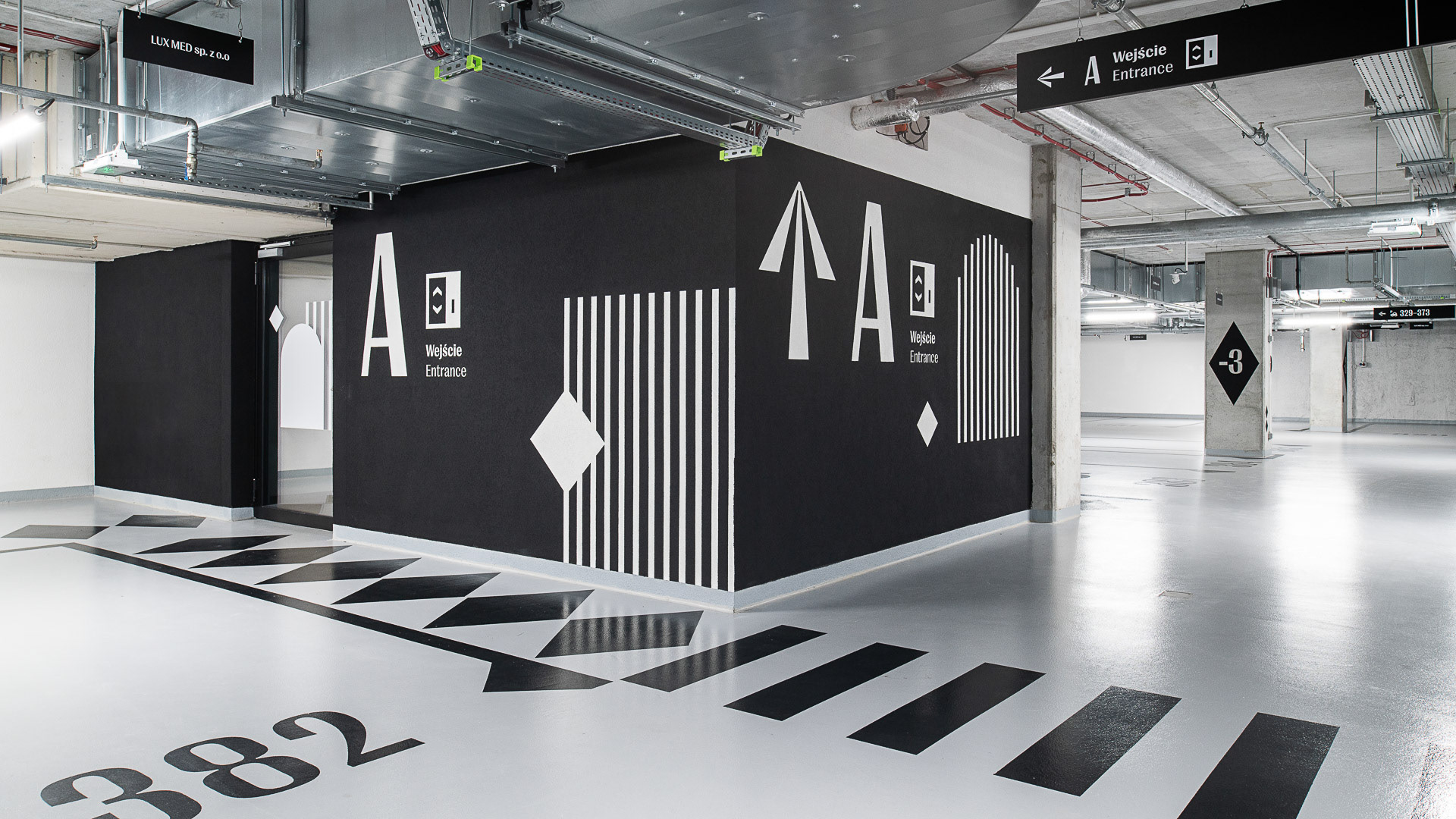 Lakeside is a complex of office buildings within the Mokotow district in Warsaw, Poland. It has already received BREEAM pre-certification at the “Outstanding” and WELL pre-certification at the “Gold” level at the design stage. WELL certification is the world’s first certification system in which buildings are evaluated for their impact on the health and well-being of the people who use them. It focuses on the use of a range of solutions that have a positive impact on the well-being, overall health, satisfaction and productivity of employees. Our wayfinding has become its complement. Graphics in common spaces build a welcoming atmosphere and make it easy for users to navigate the complex facility.