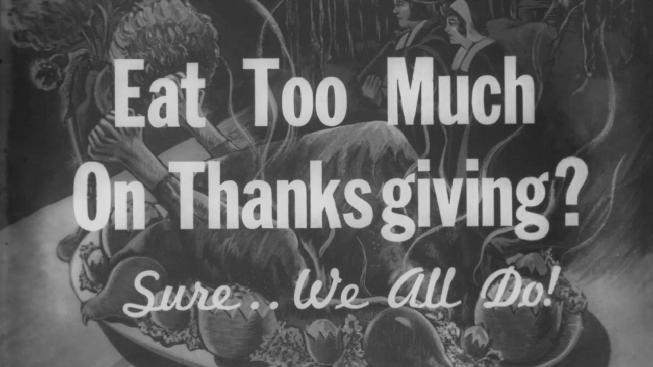 A short announcement used by (a) movie theater(s) to advertise a Thanksgiving show, sometime in the 1950s. Digitized by FT Depot. The typography uses Condensed styles of Franklin Gothic and Memphis, plus Mandate and a yet unidentified sans serif, possibly (lettering based on) Vogue using its straight sided M.