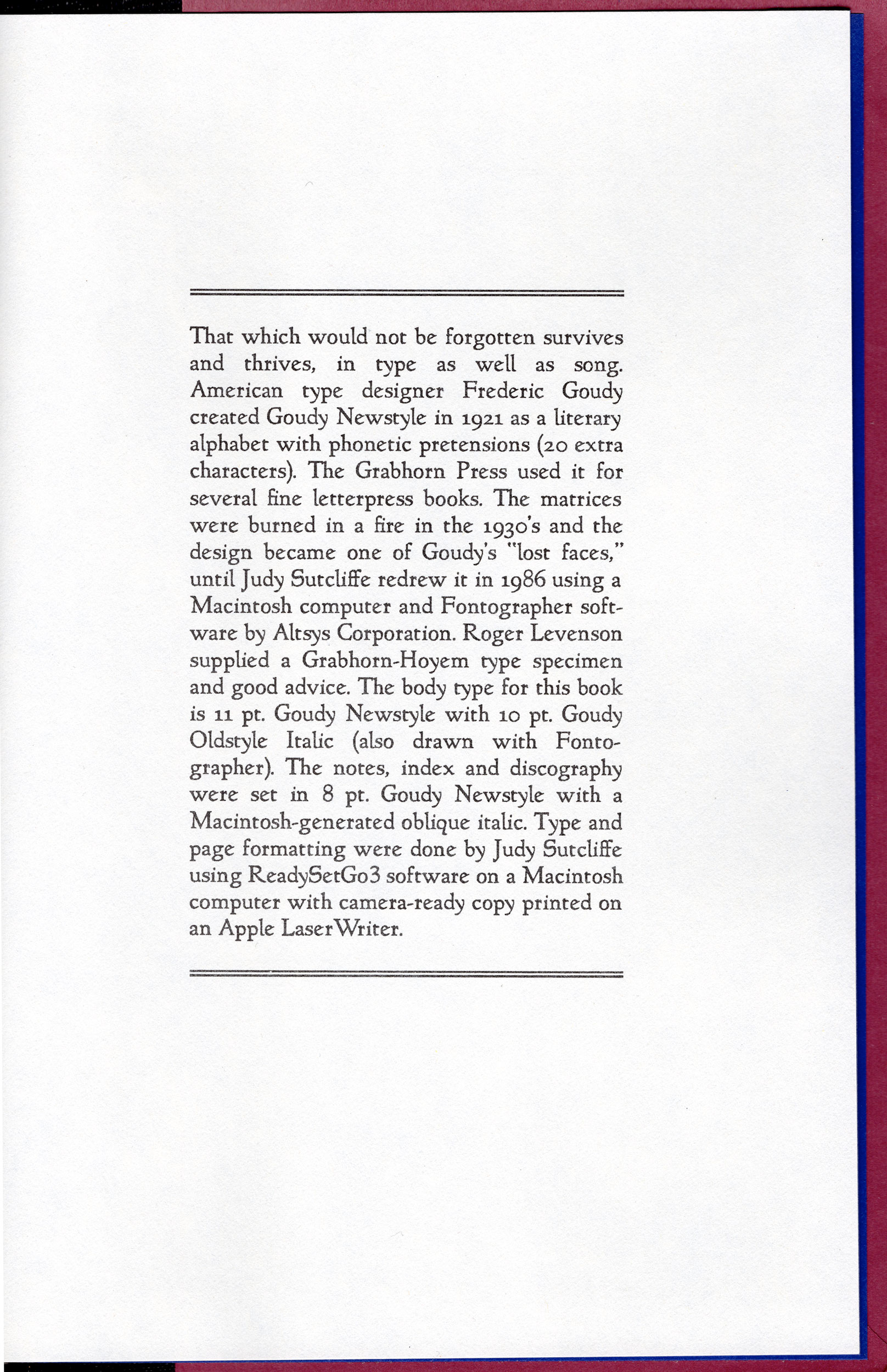 With Goudy Newstyle, Judith Sutcliffe not only created the first postscript revival of Goudy’s “lost types” in 1986. Se also designed and typeset this 300 page book for Capra Press in the earliest days of Macintosh desktop publishing. The book contains a page about the types used for the book typography, including technical info on Suthcliffe’s revival.