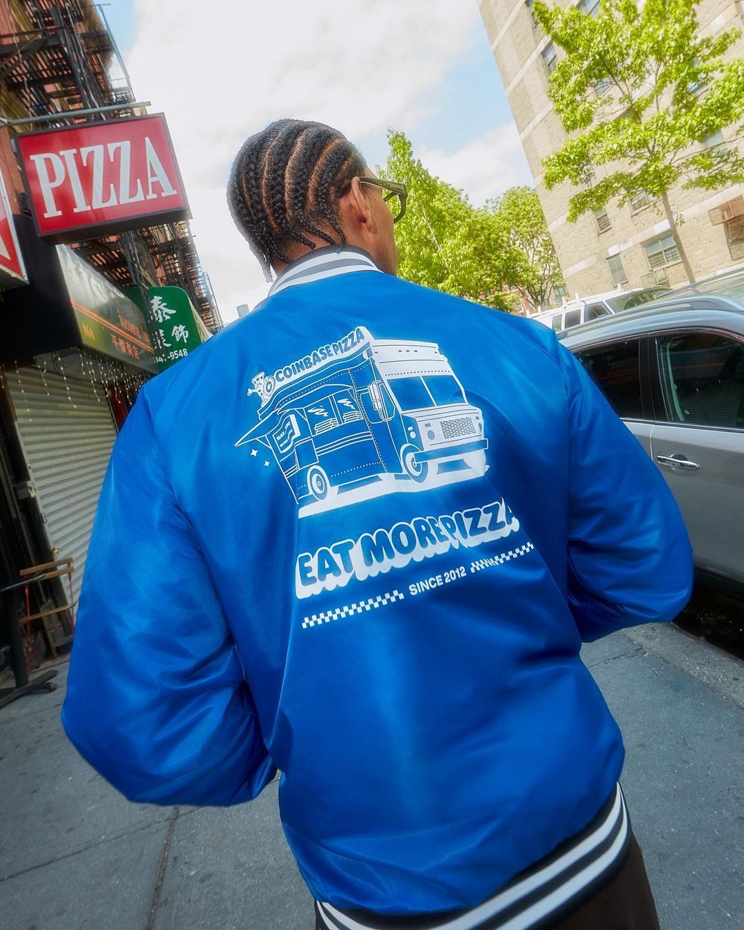 The campaign makes heavy use of the Black and Black Italic weights of Central Type's Rodger. Set in all caps with an occasional outline and drop shadow effect, Rodger appears on pizza trucks, signage, pizza boxes, and a surprisingly wide range of merchandise.