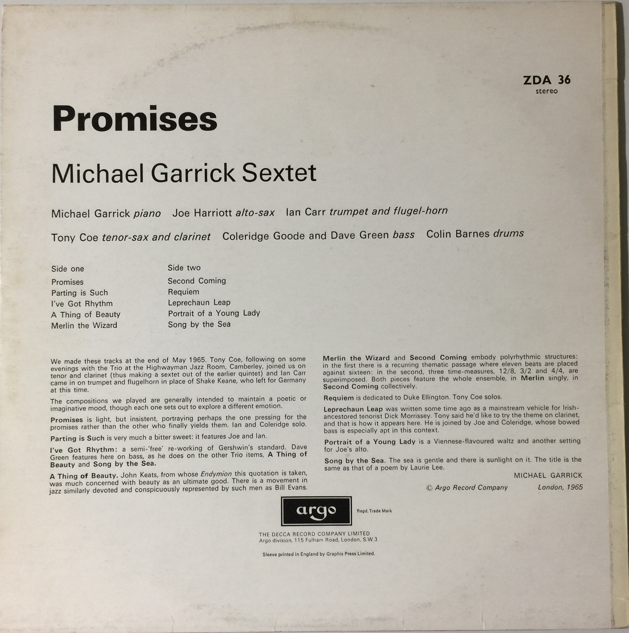 Promises is the debut album of the Garrick Sextet led by British jazz pianist, band leader and composer Michael Garrick (1933–2011). The record was released in 1965 by Argo Records, a label absorbed by Decca Records in 1957.