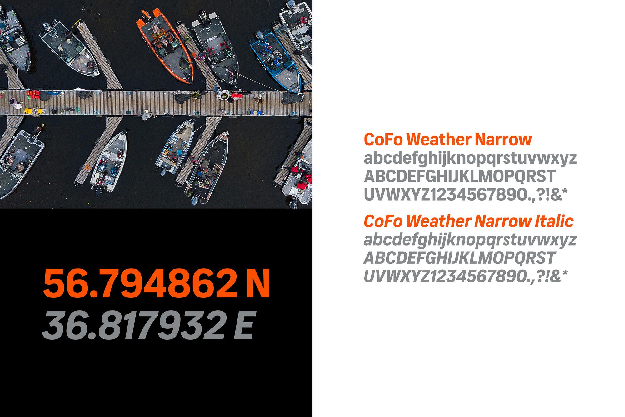 MFBoats is a fishing boats repair and customization service for amateur anglers and professional sportsmen. Their visual identity was designed by Konstantin Eremenko using a pre-release version ofCoFo WeatherNarrow. The brand logo is based on CoFo Weather’s wide style, and was refined by Maria Doreuli.