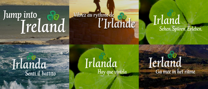 Tourism Ireland uses a variety of typefaces in its visual identity. The most prominent is* Trinité Italic — more precisely, the Medium Italic №2 with extenders of medium length. The distinguished design by Bram de Does graces the tagline “Jump into Ireland”, the central element of the global campaign launched by Publicis in 2012.