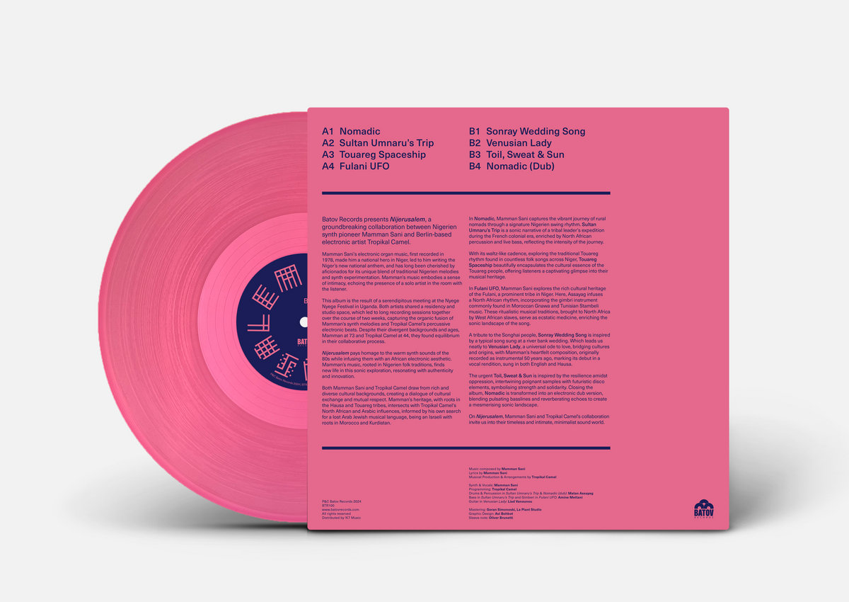Nijerusalem is a collaboration between Nigerien synth pioneer Mamman Sani and Berlin-based electronic artist Tropikal Camel, released on vinyl and in digital format by Batov Records, London. From the Bandcamp page: