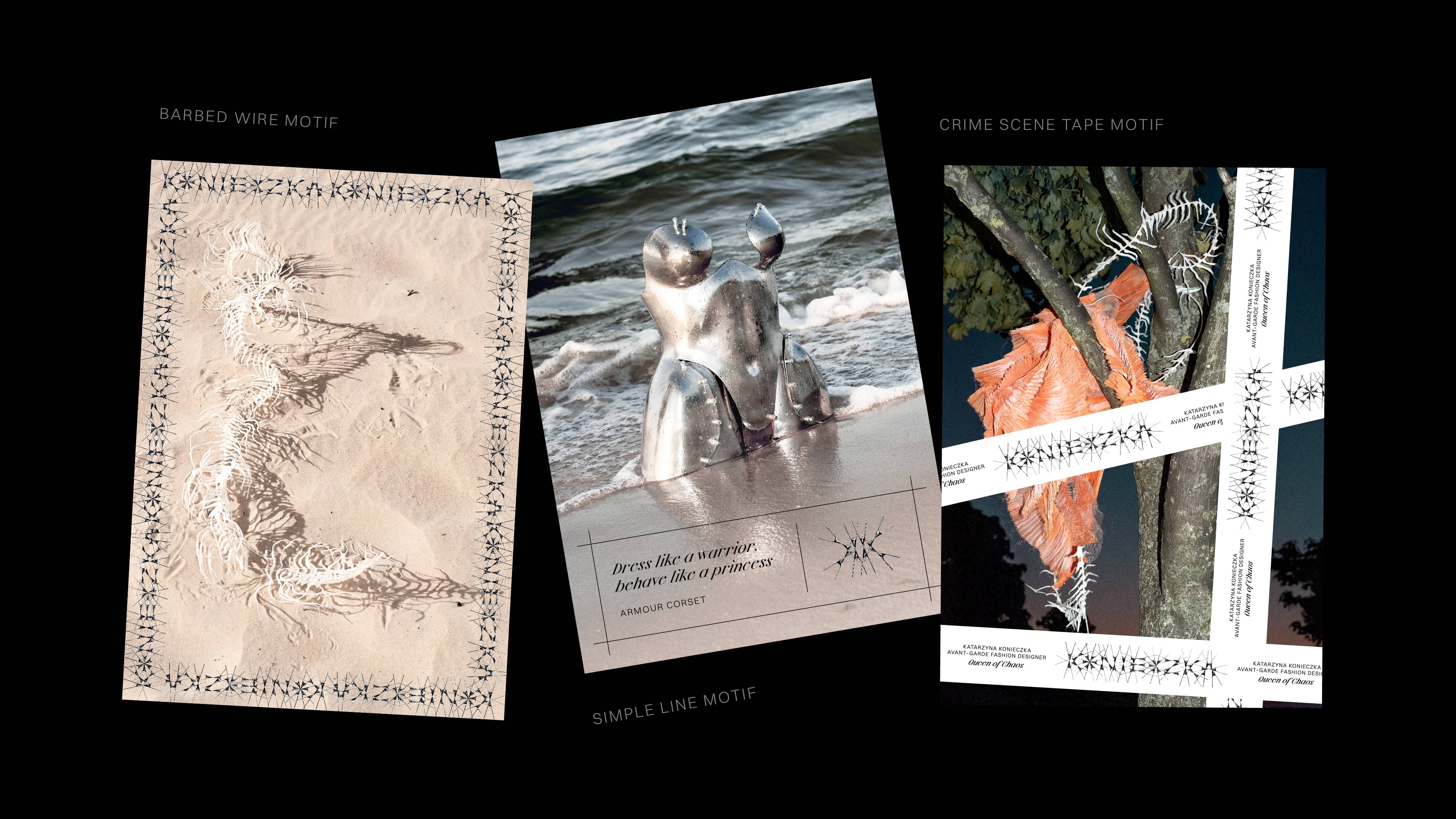 Katarzyna Konieczka is a renowned Polish costume and avant-garde fashion designer. She has created outfits for many world-famous stars such as Madonna, Lady Gaga, Bella Hadid, and Jennifer Lopez to name a few. Her works, often prepared for photoshoots, have frequently appeared in prestigious fashion magazines. They have also been used in numerous music videos and directly on film sets. CNN has recognized her as one of the ten most promising fashion designers of the future. Our task was to create a comprehensive identity for the KONIECZKA brand.