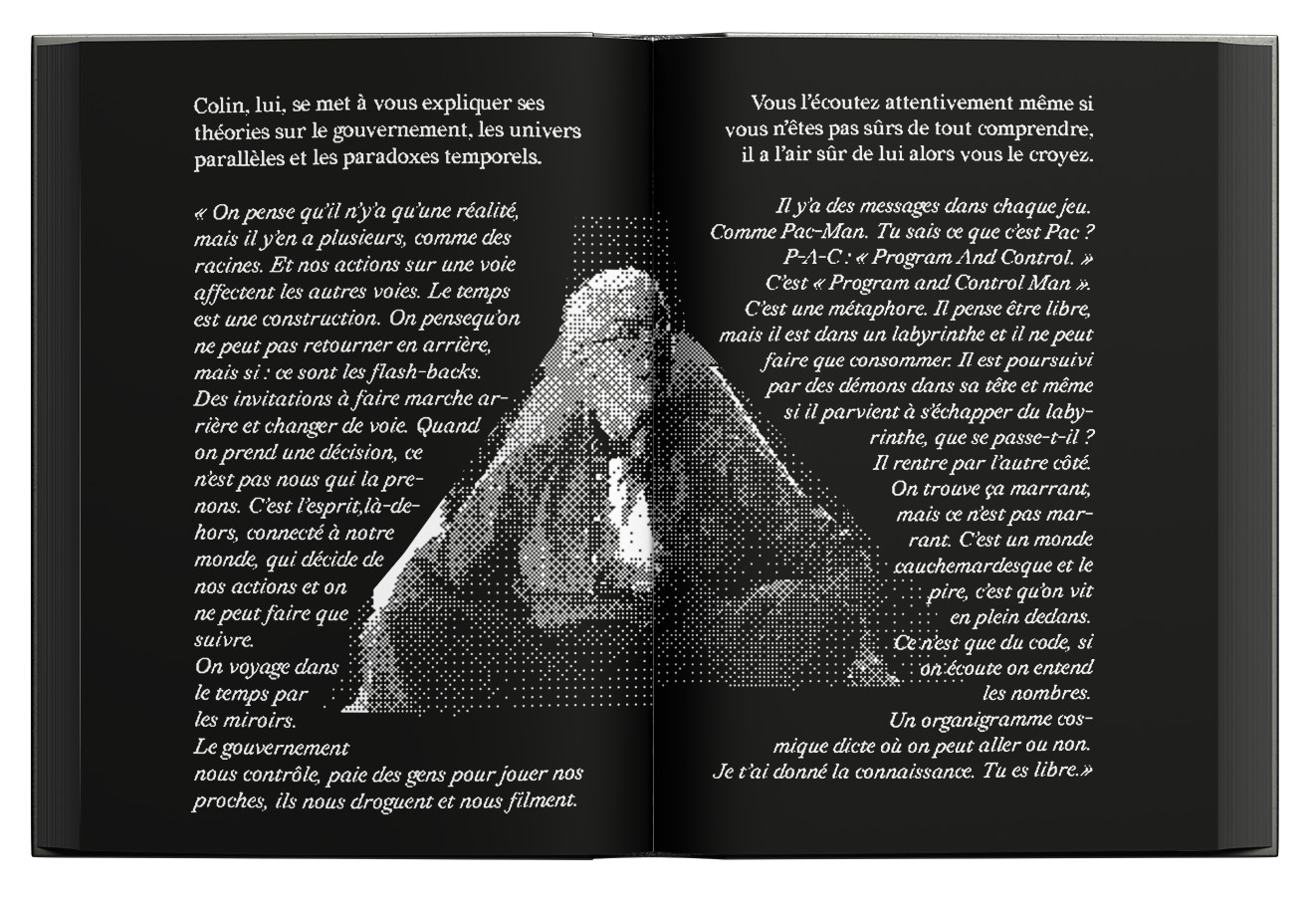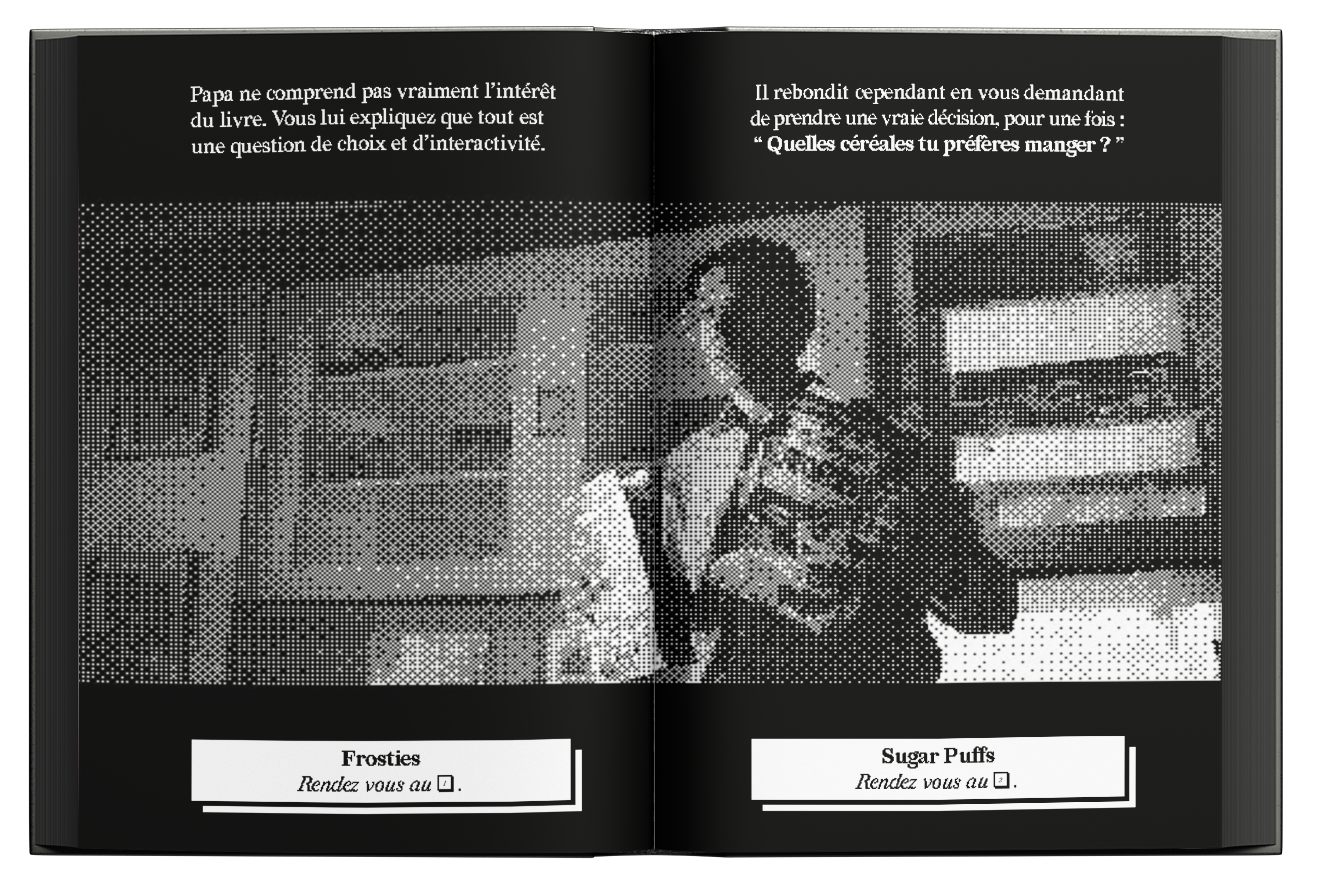 To create this book, I focused on gathering all the possible endings from the episode. The inside of the book consists of halftone screenshots and dialogues rewritten in a tone reminiscent of a “choose your own adventure” book.