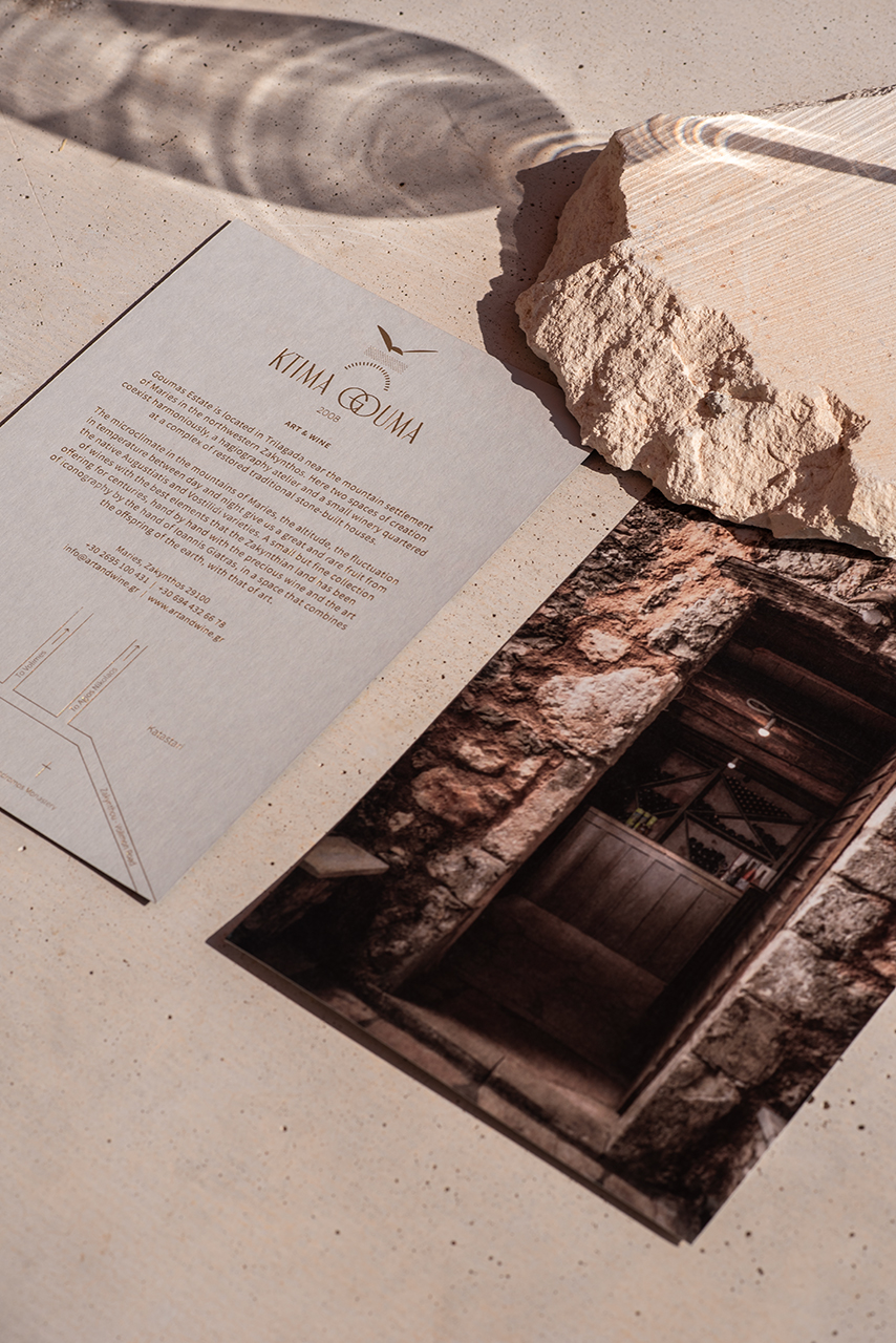 For the rebranding, I drew inspiration from the location’s geomorphology, the restored centuries-old premises’ look and feel, and the winemaker’s other passion, religious iconography. The new logotype consists of three symbols arranged vertically. At the top are the three dales (lagadia), after which the winery’s location takes its name (Tri-lagada). The middle symbol represents the Goumas vineyards. Right below, are the estate’s arched gates. The symbols’ vertical arrangement references the Byzantine script used in Orthodox iconography, a nod to the owner’s artistic work. Underneath, the winery’s brand name is set in an elegant typeface (Musetta Regular by Atipo) with long and narrow elements that aesthetically match that vertical set-up. Finally, the brand colors were inspired by construction elements found across the estate: stone, wood, soil, and the conspicuous pink stucco adorning the winery’s walls, which is made with crimson iconography paint.