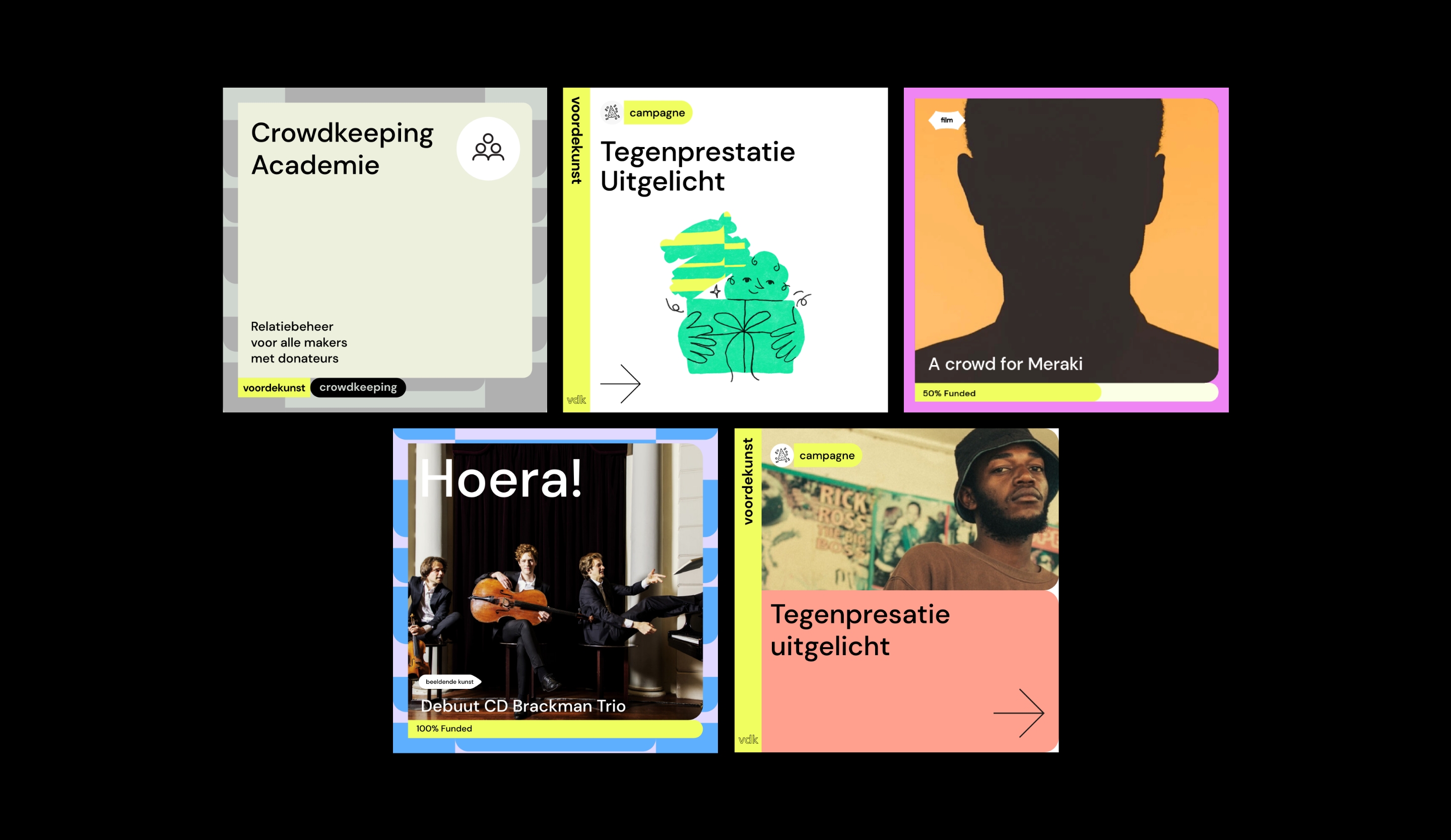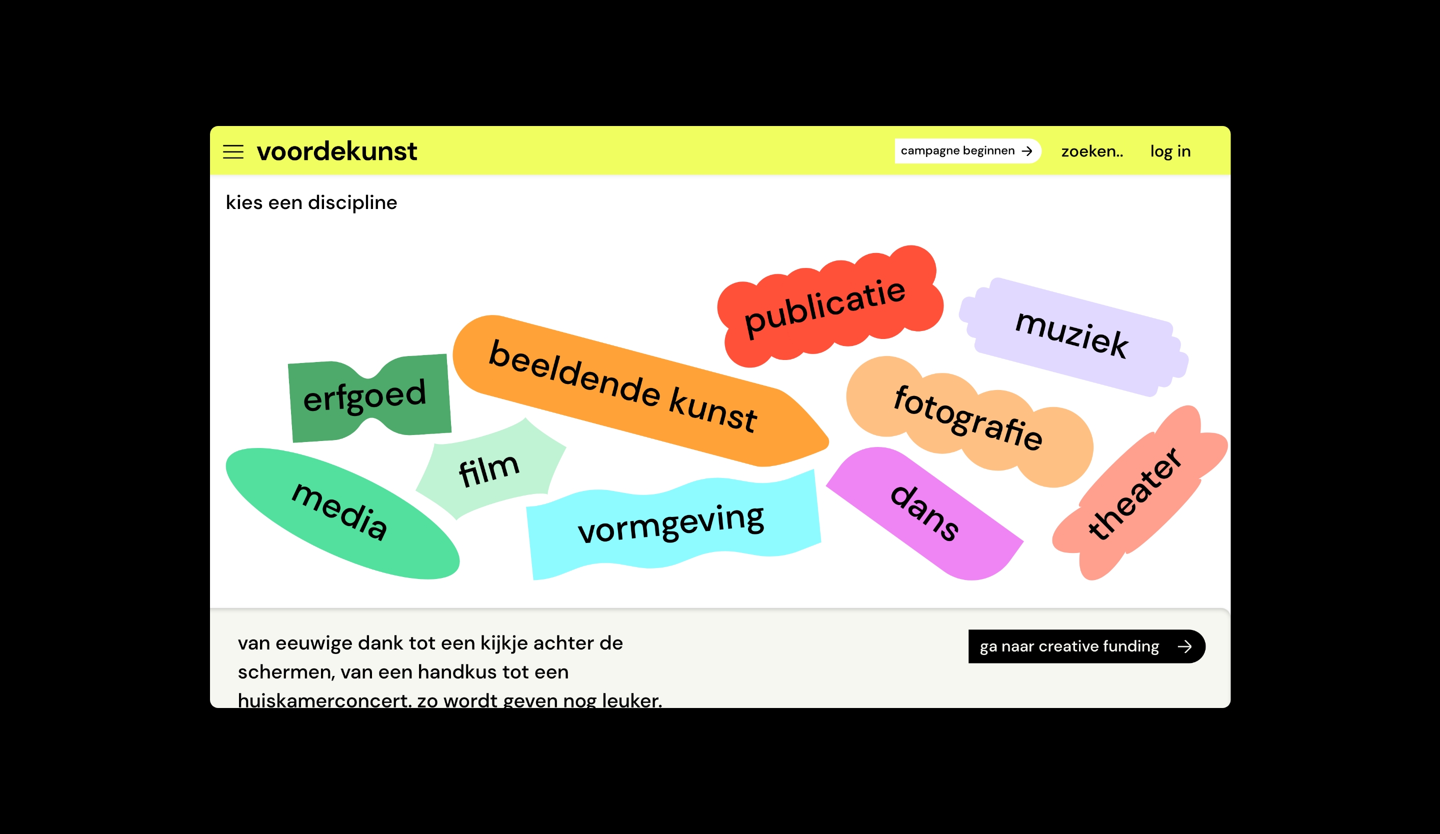 Voordekunst (“For the arts”) is the leading crowdfunding platform for creatives in the Netherlands. Over the years, voordekunst has grown into a national institute and asked Rotterdam-based studio The Phoney Club to develop a fresh face to replace their visual identity by Verve that could keep up with its future ambitions.