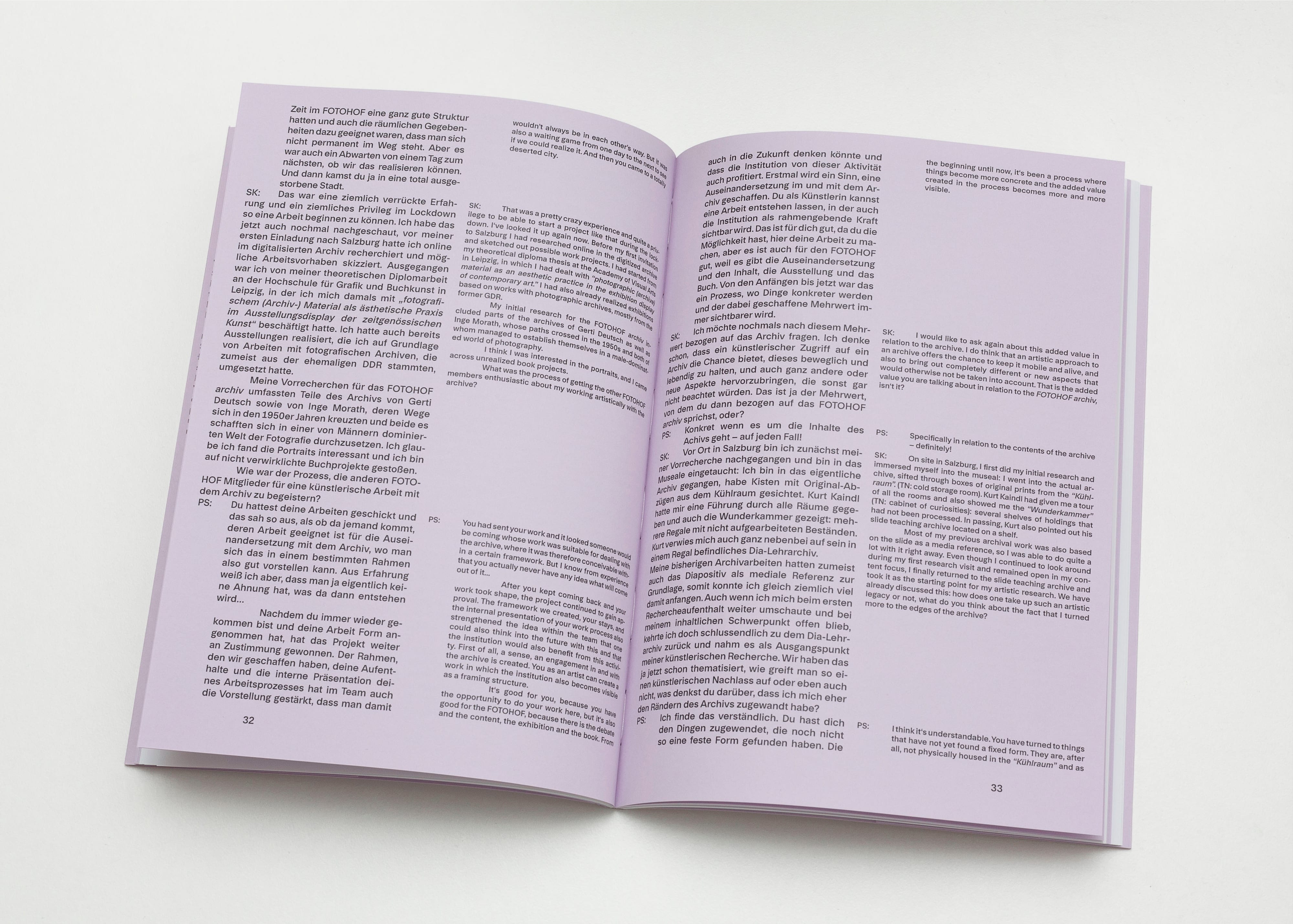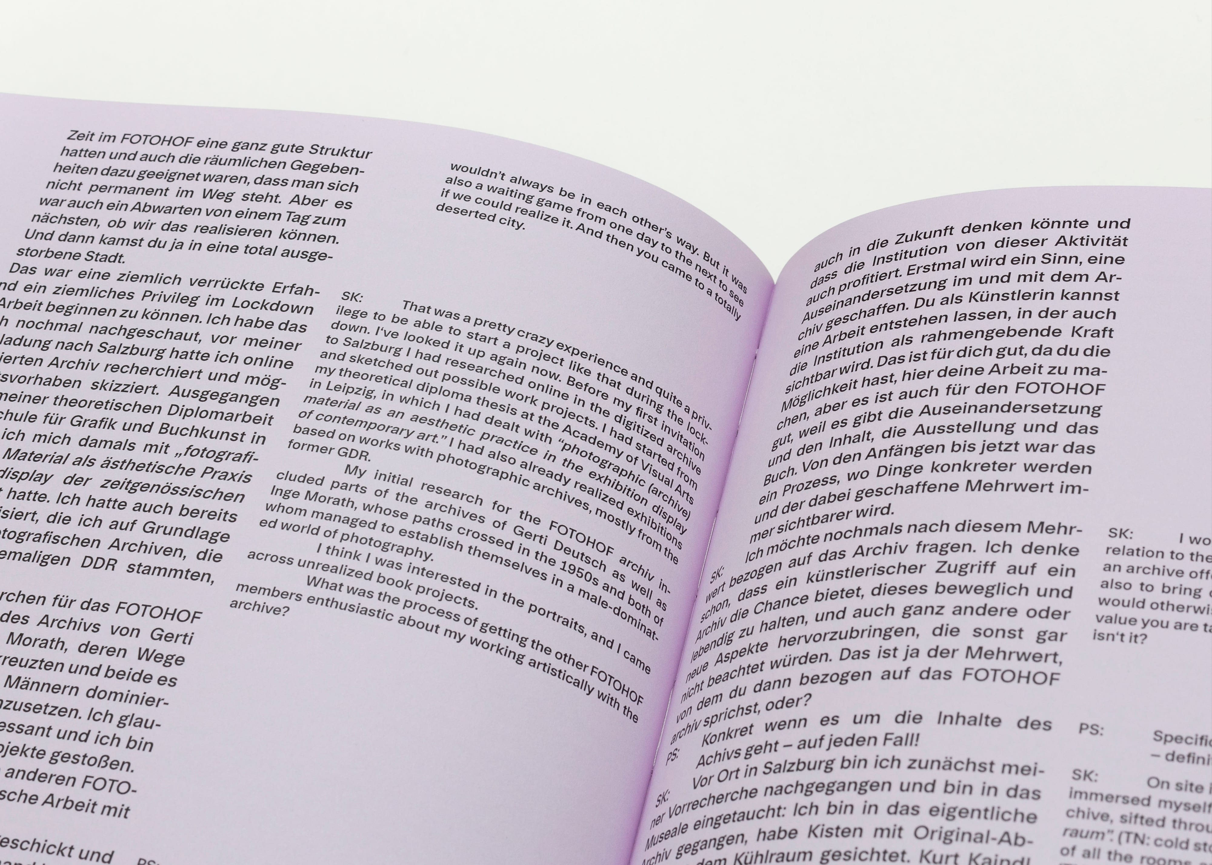 The catalog […] can be viewed as an independent work rather than just a publication accompanying the exhibition. […] The lavender-colored fine paper cover focuses on simplicity. A simple bilingual typographical system is established in the flaps, which manages with only two font sizes. The strictly gridded sans-serif interviews on thin, uncoated, colored paper contrast the lively picture spreads and move around the edges (of the collection) through the deliberately narrow margins.