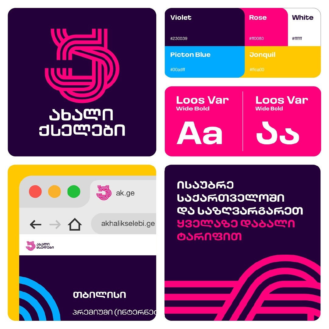Akhali Kselebi (ახალი ქსელები; Georgian for The New Network) is an Internet service provider covering the entire Georgia, both big cities and small mountain villages. Tbilisi-based studio Holy Motors updated the provider’s visual identity and came up with their new logo this year. Any text in Georgian and English on Akhali Kselebi’s social media pages, website, or even modems is now set in Loos Wide by CSTM Fonts.