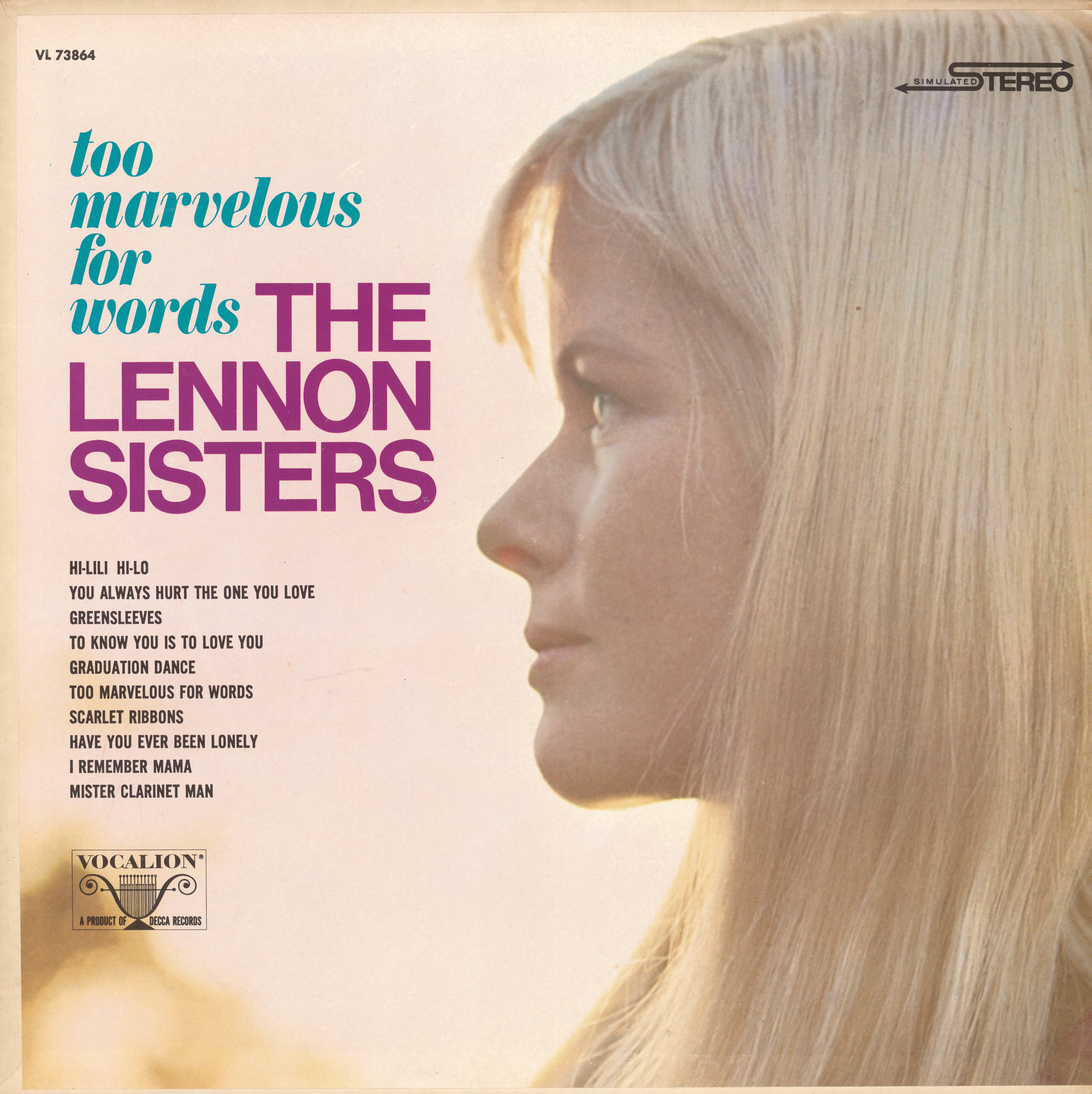 Too Marvelous for Words is a compilation album by The Lennon Sisters, with songs selected for re-release from their Decca catalog. It was issued by Vocalion Records in 1969, the year the four sisters were struck by tragedy: on August 12 their father and long-time manager, William Lennon, was shot and killed by a delusional stalker who believed he was married to Peggy, the second-oldest of the sisters.