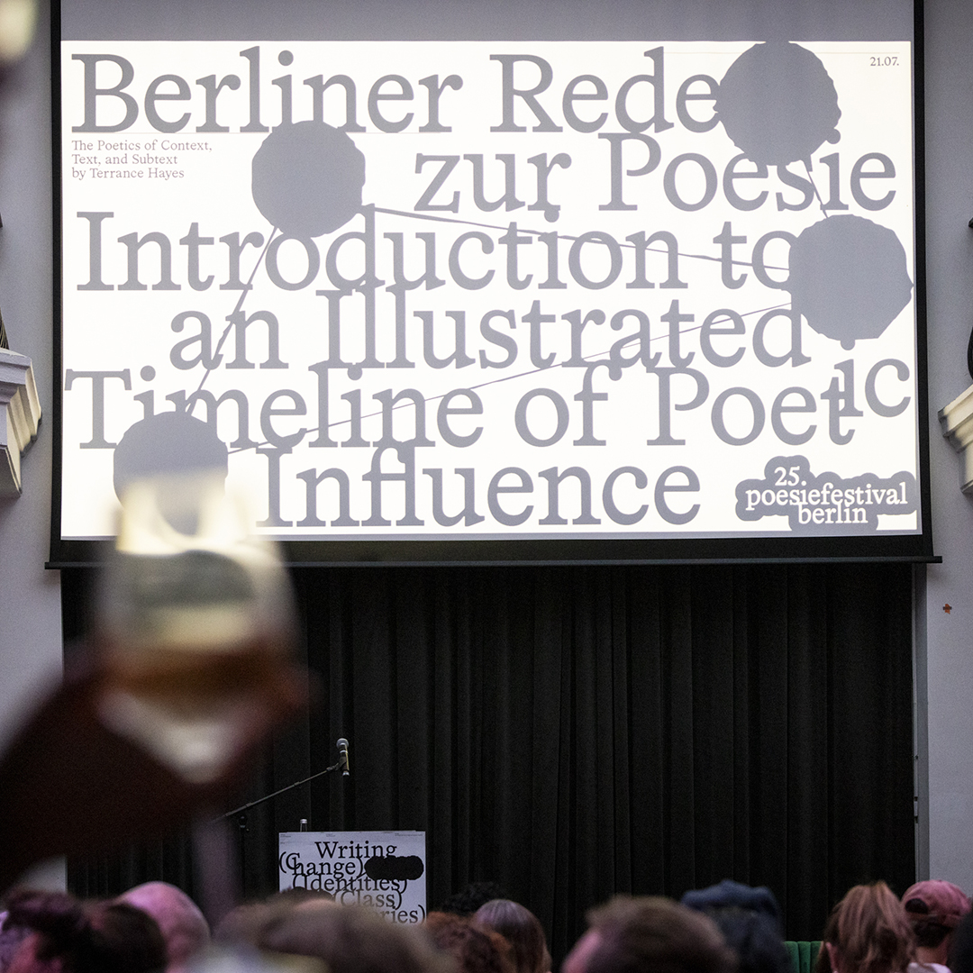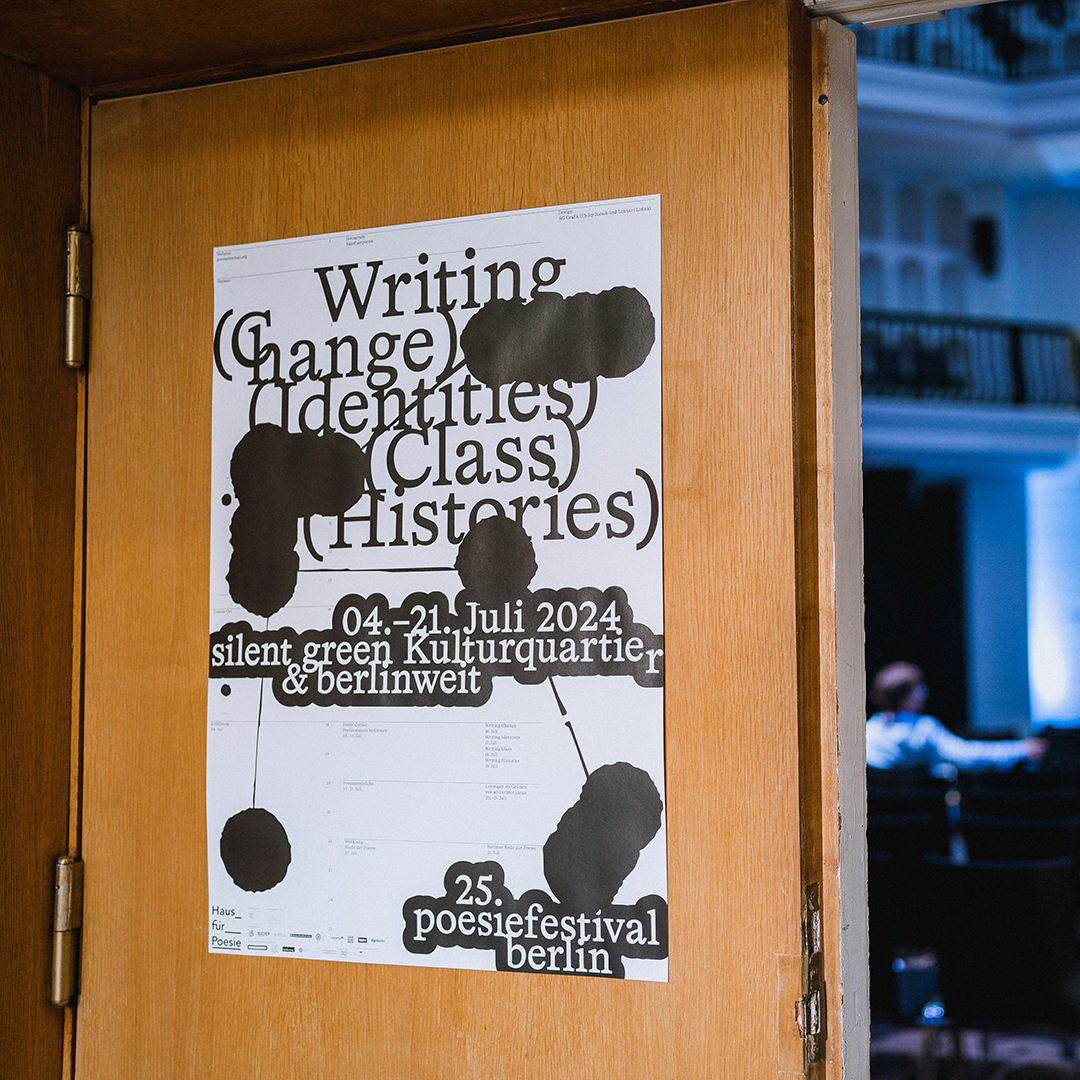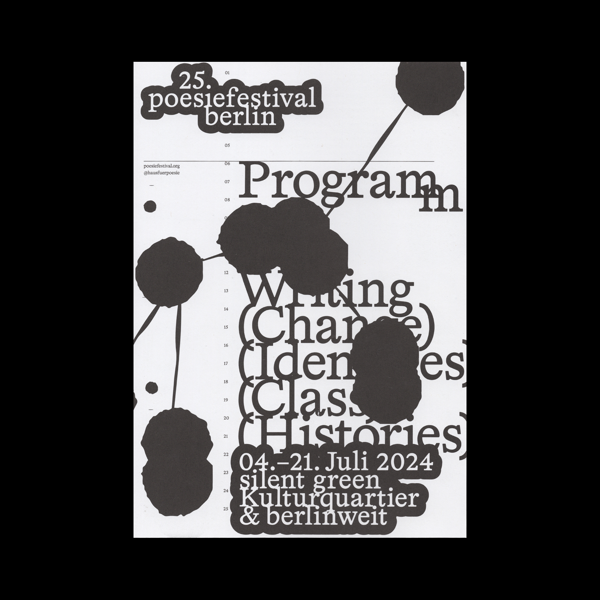 In the design of the 25th anniversary edition of the poesiefestival berlin, the AG Grafik focused on the essentials: A classic Antiqua font combined with hand-drawn lines, punched dots and typesetting errors are reminiscent of the manual process of writing. The color space is as reduced as possible: black text on a white background stands for the relevance of the written word. The visual concept is irritating, not always legible and explores the possibilities of presenting poetry through design.