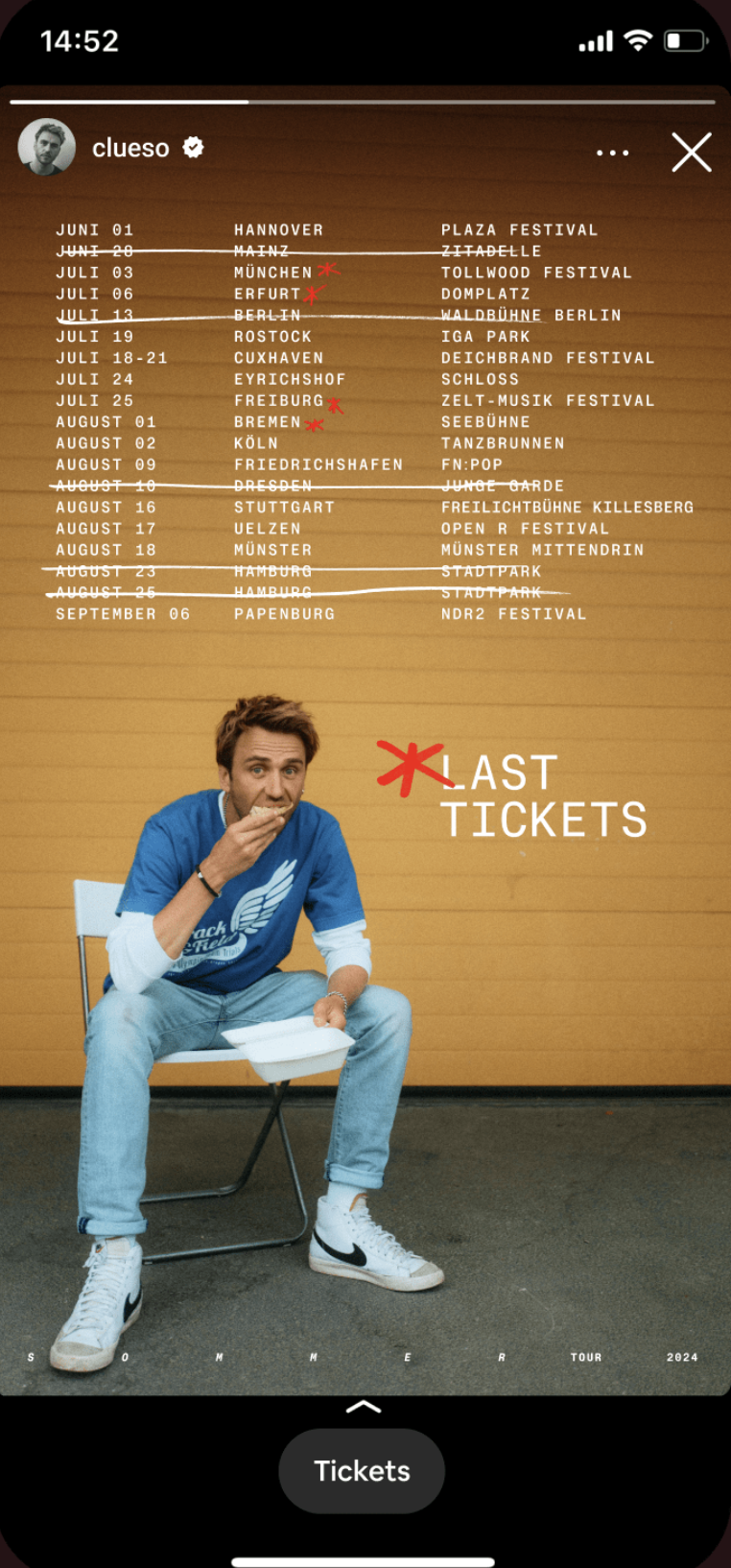 +49 unknown number. First clear your throat for the call center. All the more surprising when Clueso suddenly greets you from the smartphone. The Clueso. A fixture in the German music world. One who has remained true to himself by reinventing himself once again. For his summer tour, we teamed up with his team of groovy professionals and took on the creative concept and art direction. Posters, social media content and merch – everything that should excite fans’ eyes, once played through. So, always answer when the phone rings. You can only win.