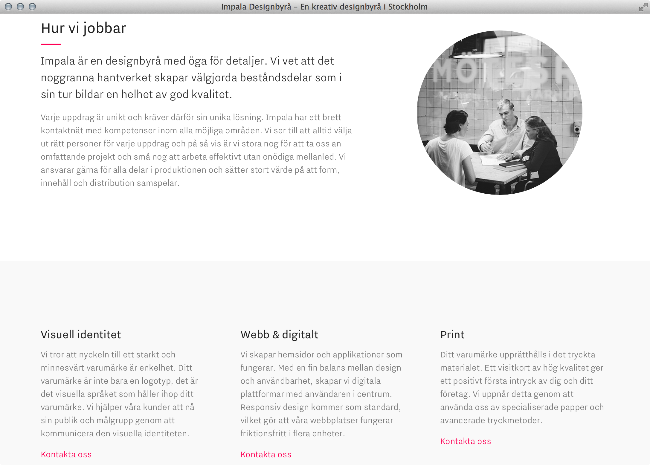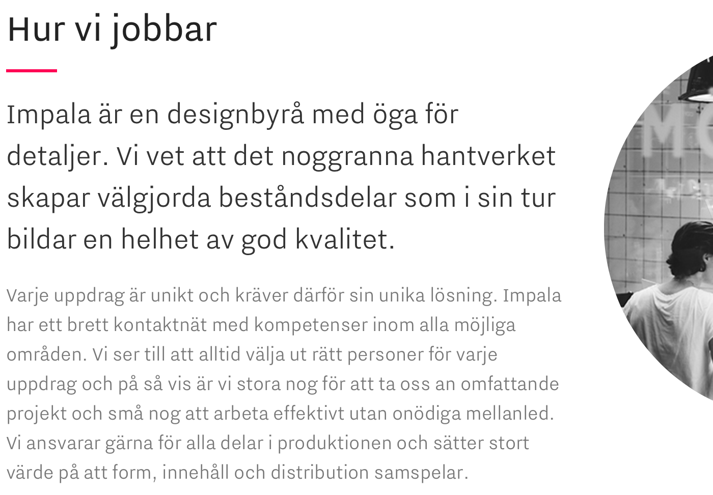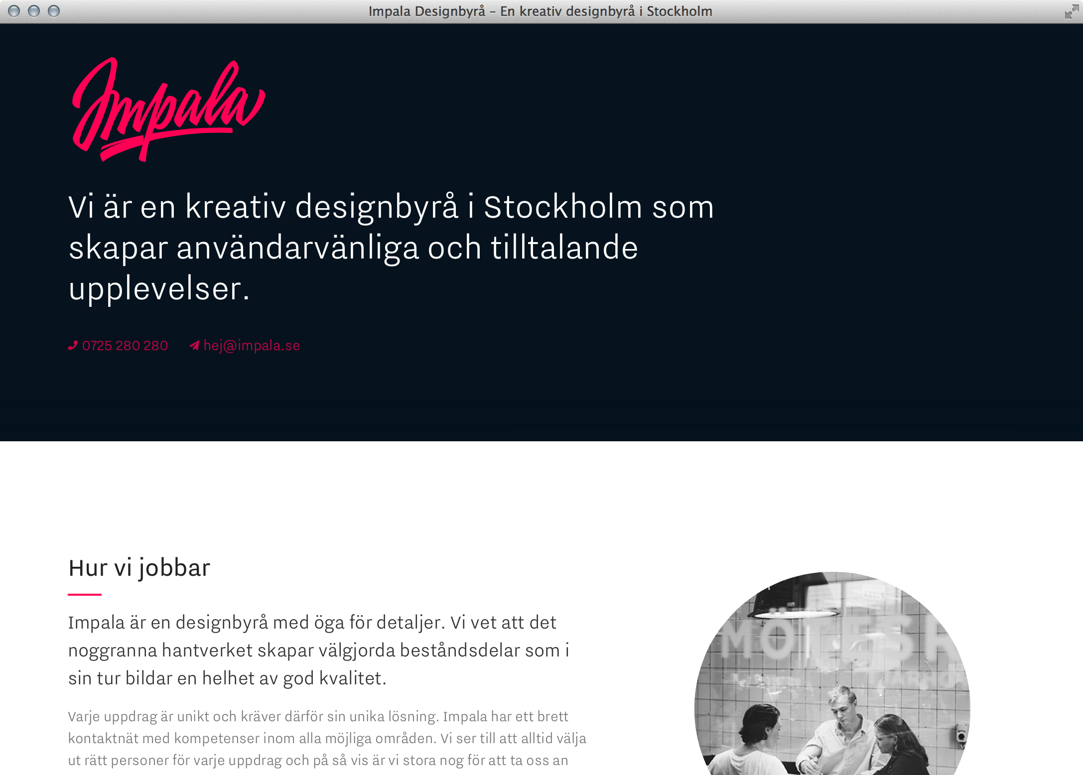 Impala Designbyrå website Contributed by Webtype on Apr 2nd, 2014. Artwork published in February 2014. Source: www.impala.se License: All Rights Reserved. Website of Swedish design studio Impala using Nitti Grotesk and some subtle scrolling effects. A straightforward, fully responsive design made interesting by the sophisticated type choice. Source: www.impala.se License: All Rights Reserved. Source: www.impala.se License: All Rights Reserved. Source: www.impala.se License: All Rights Reserved. Typefaces More about Nitti GroteskGet Nitti Grotesk Formats Web (5523) Topics Services (1529) Graphic Design (2963) Designers/Agencies Impala (1) Tagged withwebsites (3477)webfonts (449)Webtype (73)design studios/agencies (486)black (70)red (815)Swedish (language) (162) Artwork location Sweden (435) Stockholm (215) In SetsWebtype (Webtype) (241) Post a comment Name Email – will not be published Website Your response Submit Comment More Nitti Grotesk in use Katarina Medić websitec. 2014Katarina MedićContributed by Webtype Nuovo Devoto-Oli2018LeftloftContributed by CAST Staff Pick Lettermatch2016Oliver RothenhäuslerContributed by Oliver Rothenhäusler Sponsor More in Graphic Design Good Design Is for Everyone2022JD&Co. CreativeJong Woo SiAage VetterContributed by Jong Woo Creative History – 25th January 20042013Andy KellyContributed by Andy Kelly HKS Colourmatch 182012CLMNZClemens HartmannContributed by Gareth Hague Type Club poster2015Max PhillipsSignal Type FoundryContributed by Max Phillips More in Web Mifood Miraisin2024unknownContributed by Ethan Nakache The Audacious School of Astonishing Pursuitsc. 2024ED.Contributed by Nguyen Gobber Undone website and identityc. 2015unknownContributed by Stephen Coles Staff Pick Åzone Futures Market – Guggenheim Museum2015Studio FolderMarco FerrariElisa PasqualContributed by Wei Huang More Fonts In Use Schauspielhaus Zürich, 2006–092006RaffinerieContributed by Stephen Coles Blog Schauspiel im ZDF (1978–83)c. 1978Christof GassnerContributed by Stephen Coles Staff Pick Royal West of England Academyc. 2016SpyContributed by Swiss Typefaces Staff Pick Fuhrgeschäft Arno Heinrich invoice, 1939c. 1935Contributed by Florian Hardwig Staff Pick