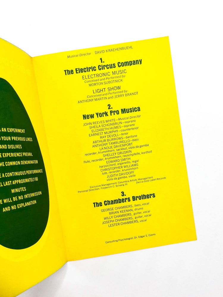 Performing at the 1968 Electric Easter concert were electronic music pioneer, Morton Subotnick; a light show by Anthony Martin and Jerry Brandt; Medieval and Renaissance ensemble, New York Pro Musica; and psychedelic soul band, The Chambers Brothers.