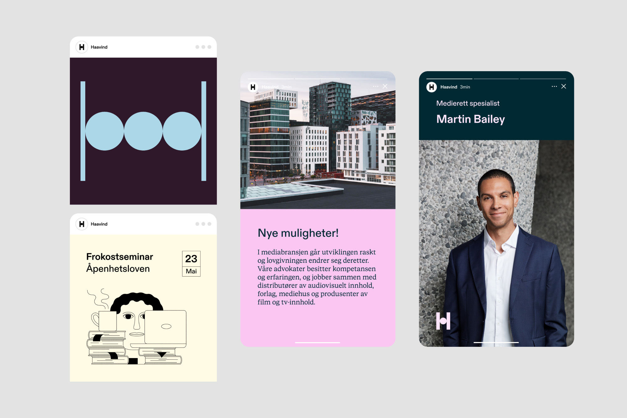 Identity and website for law firm Haavind, designed by Neue Design Studio. Images captured by Sara Angelica Spilling. Illustrations by Dominic Kesterton.