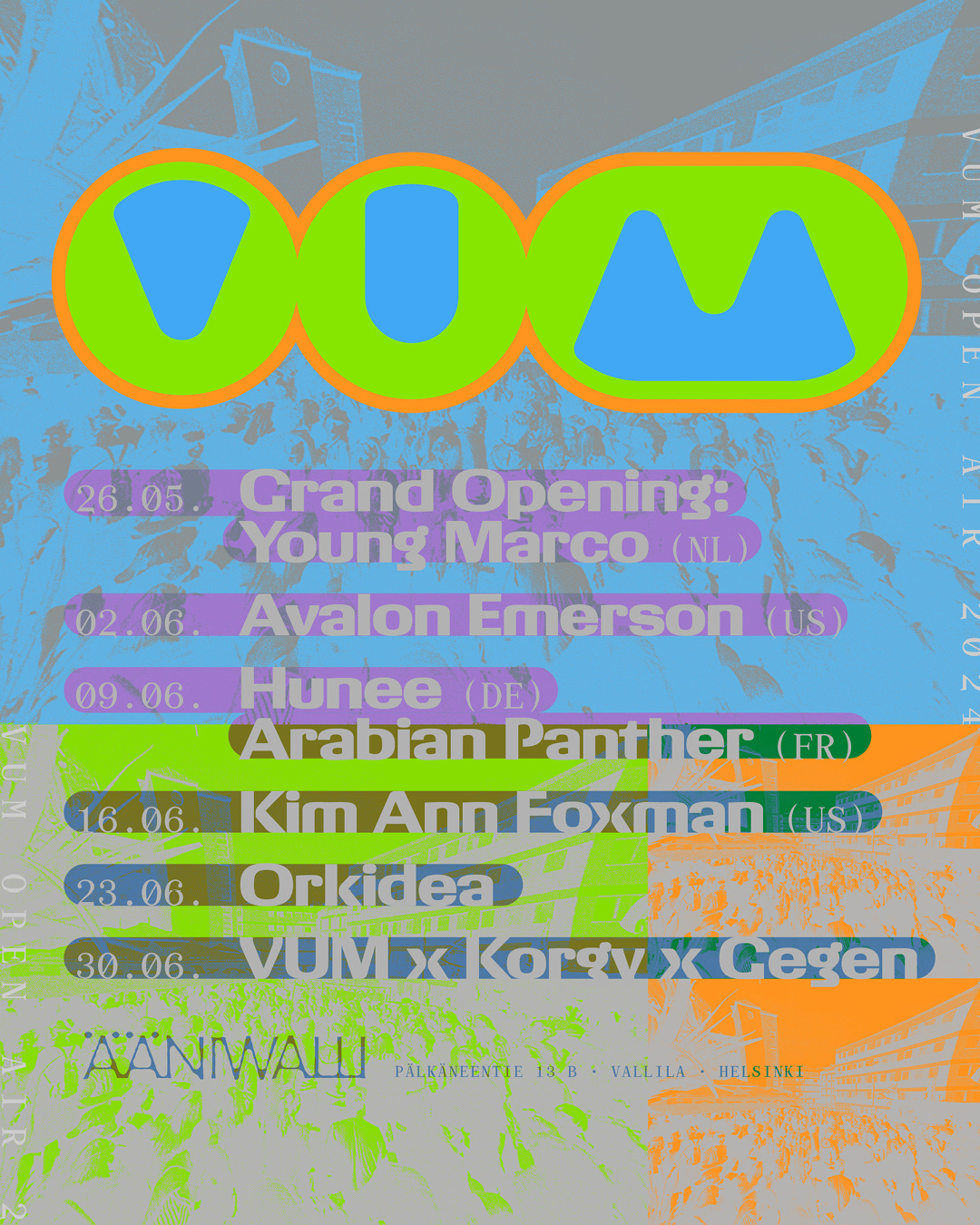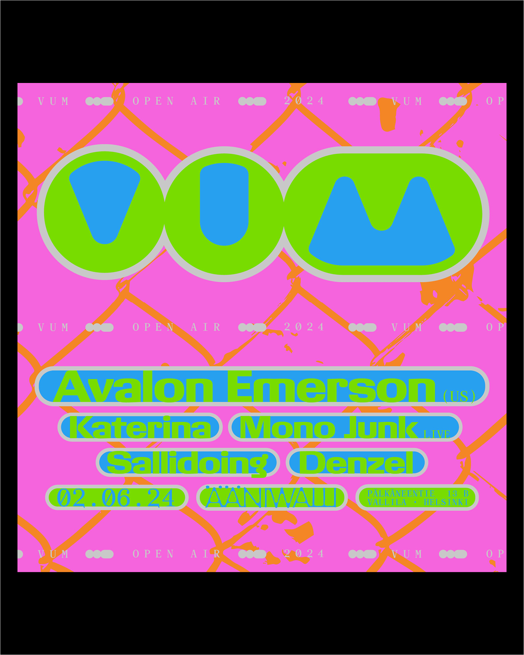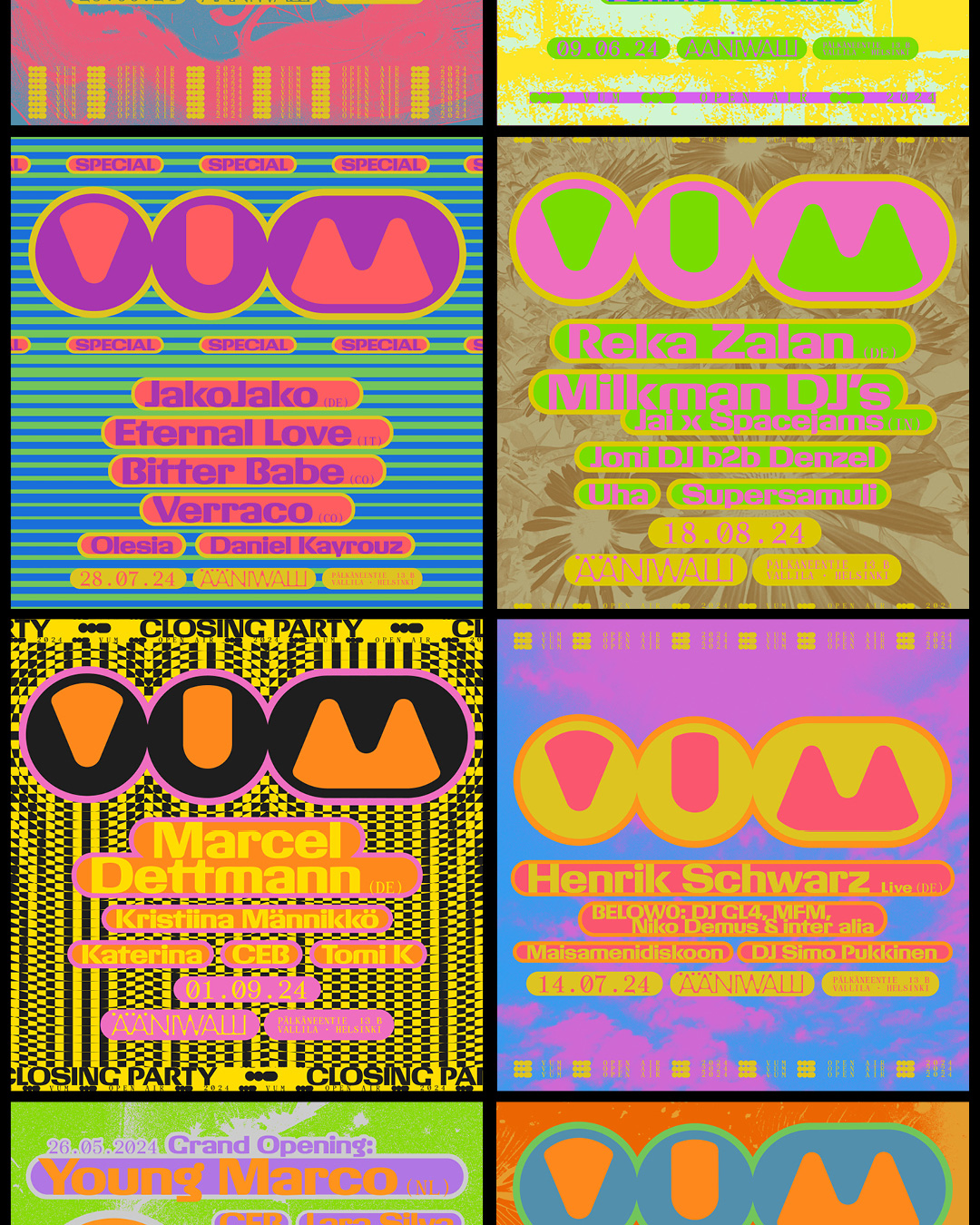 For the digital campaign of VUM Open Air 2024 at Ääniwalli, Helsinki, graphic designer Antti Uotila (Tsto) chose vibrant colors. The design of Giigamax Black (Altiplano) harmoniously interacts with the Monospace style of Archive (Colophon). The VUM and Ääniwalli logos are custom.
