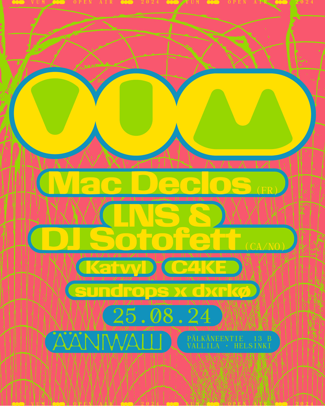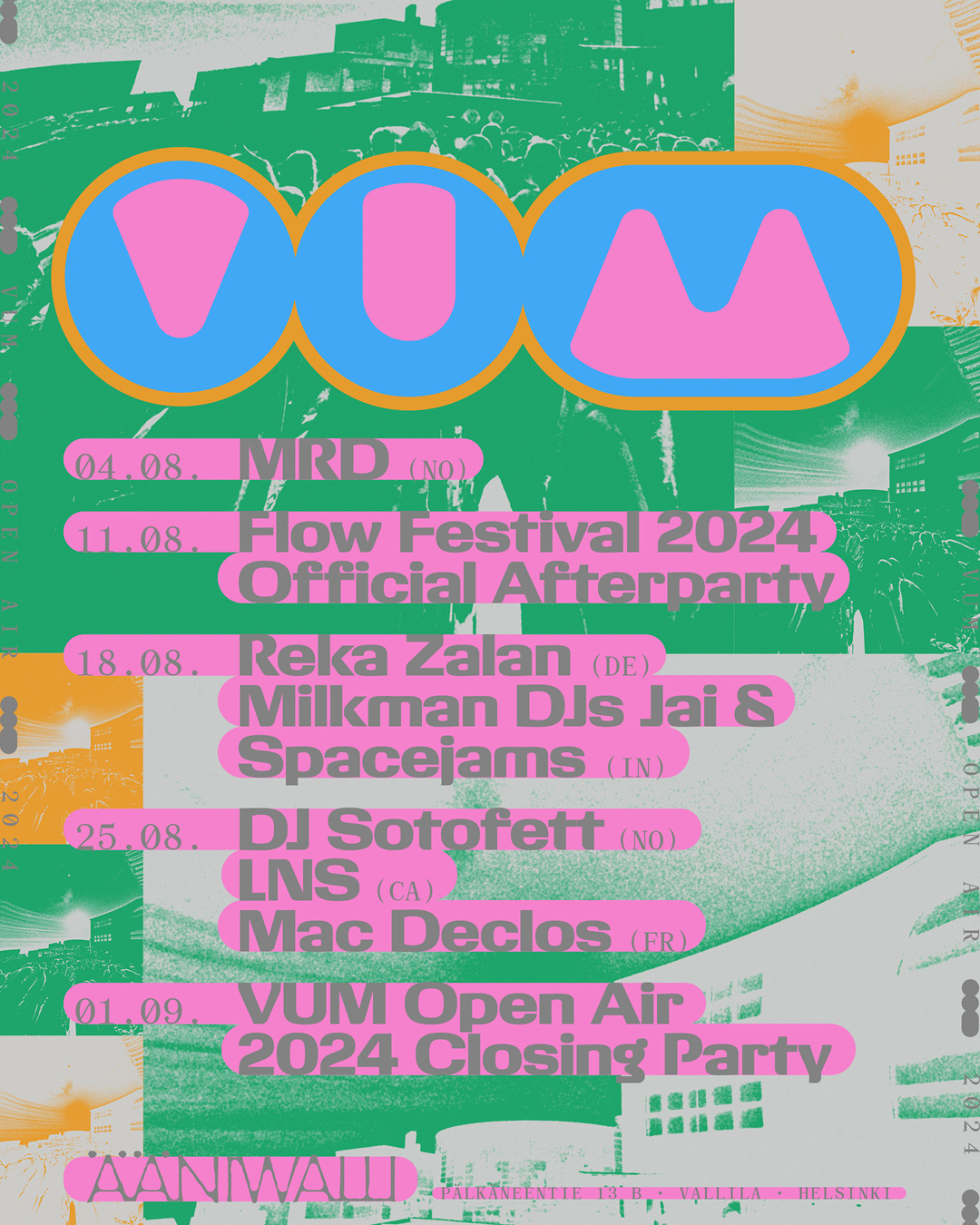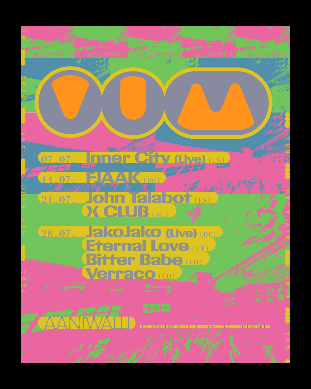 For the digital campaign of VUM Open Air 2024 at Ääniwalli, Helsinki, graphic designer Antti Uotila (Tsto) chose vibrant colors. The design of Giigamax Black (Altiplano) harmoniously interacts with the Monospace style of Archive (Colophon). The VUM and Ääniwalli logos are custom.