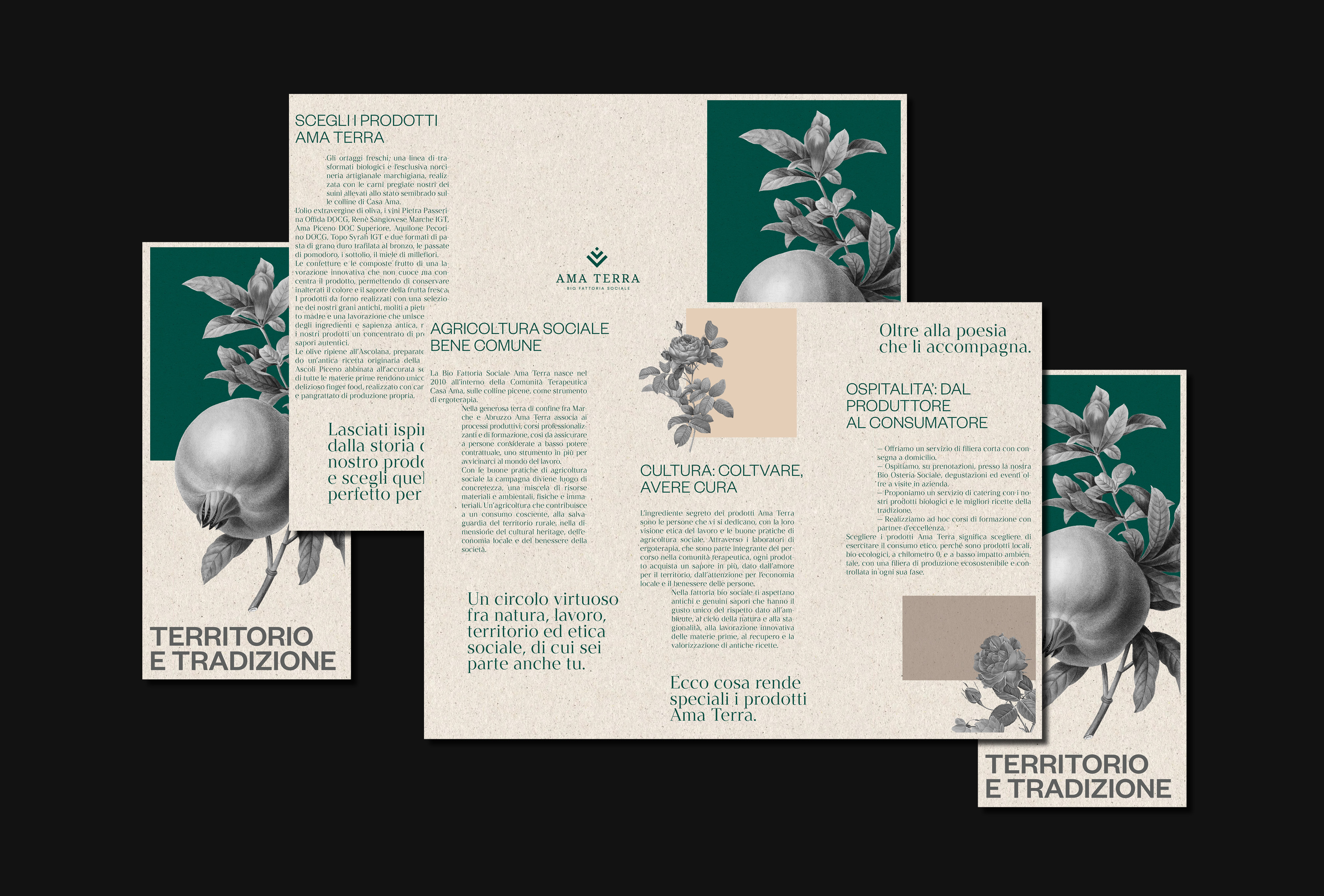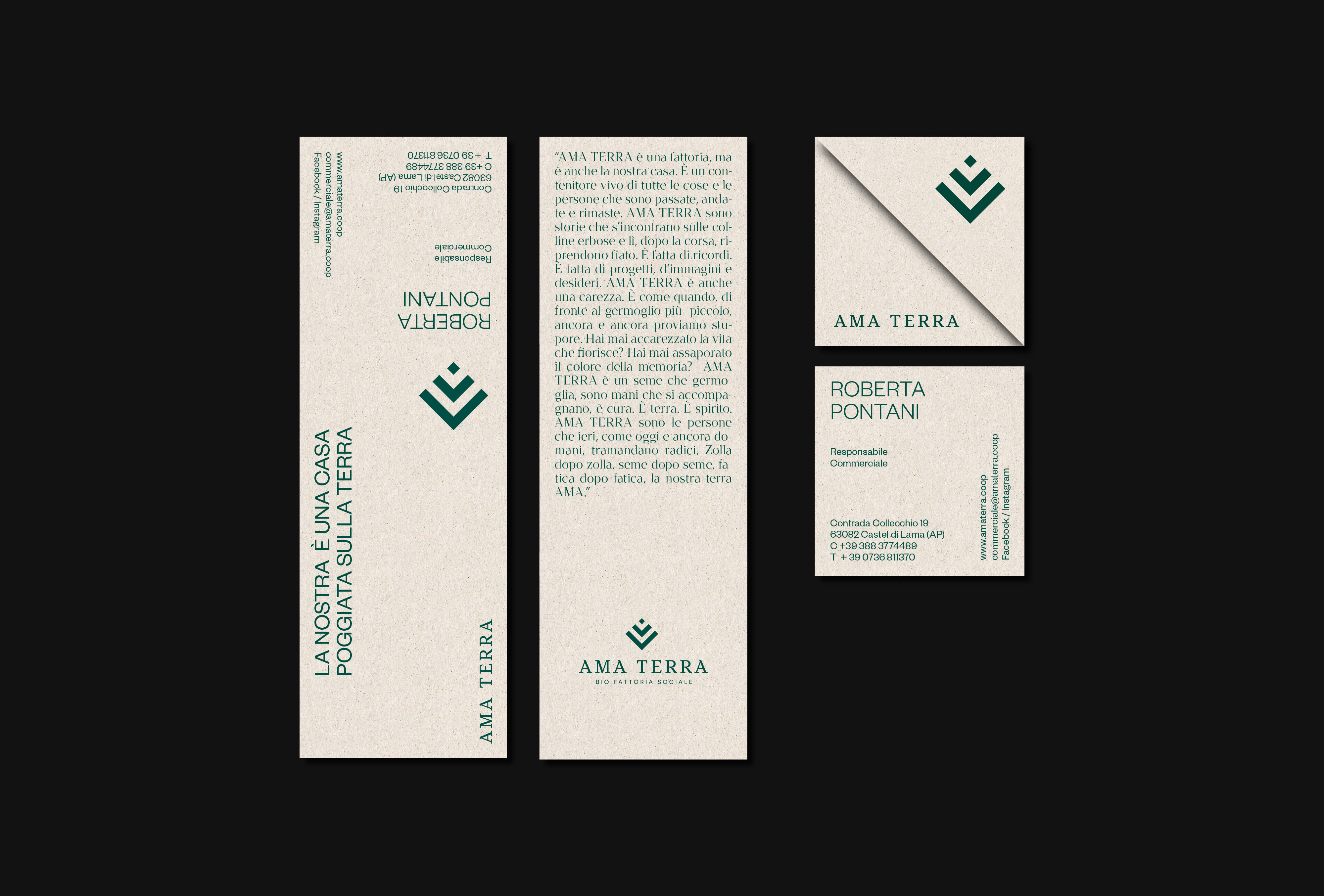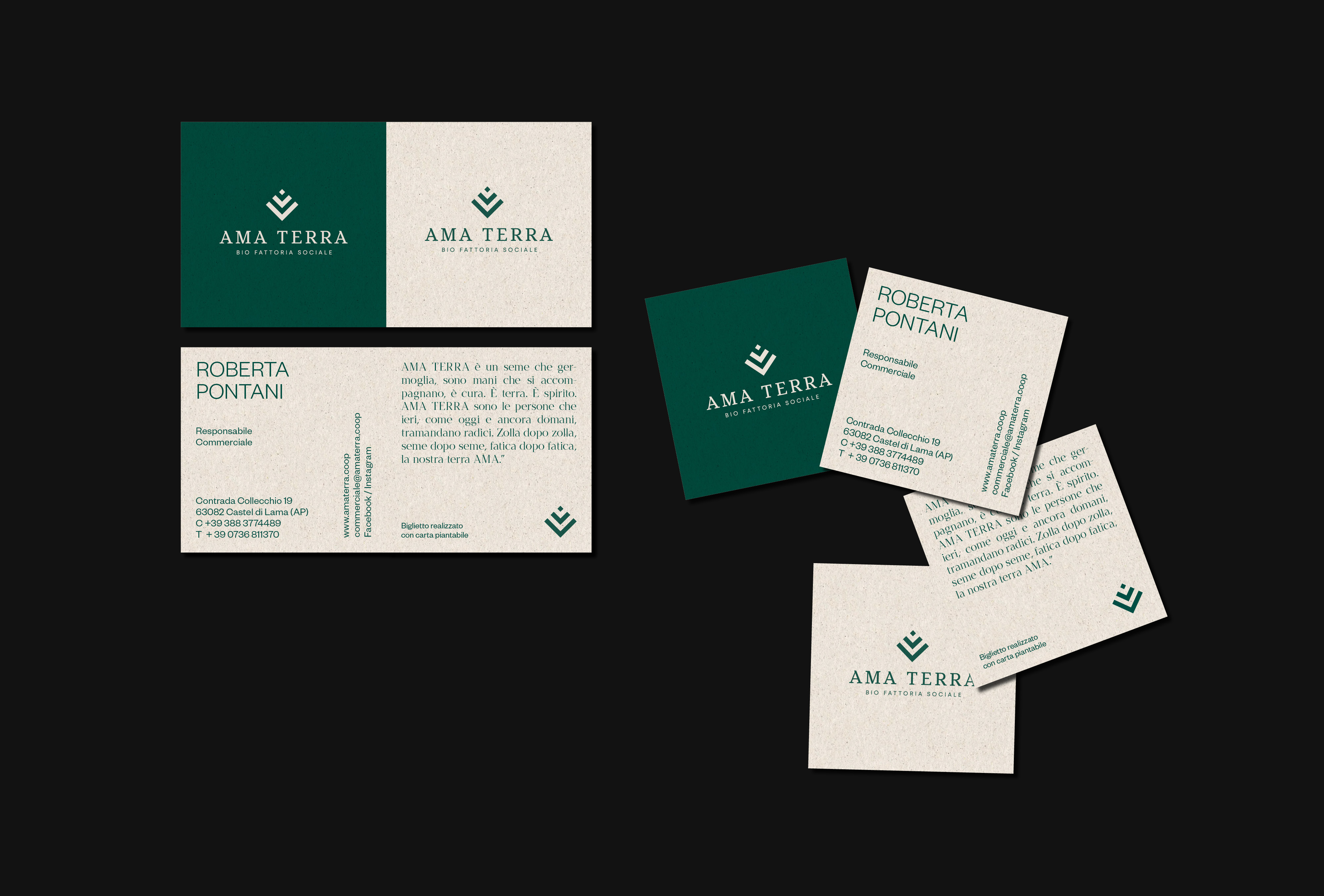 The supports are printed on the Favini’s ecological paper Crush Mais, made from industry processing waste. Part of the business card, printed on plantable paper (containing seeds), can be torn. If planted and watered it can give life to a new shoot. This simple gesture of respect contains the whole philosophy of the cooperation, choosing and practising ethical consumption to preserve nature and its seasonality.