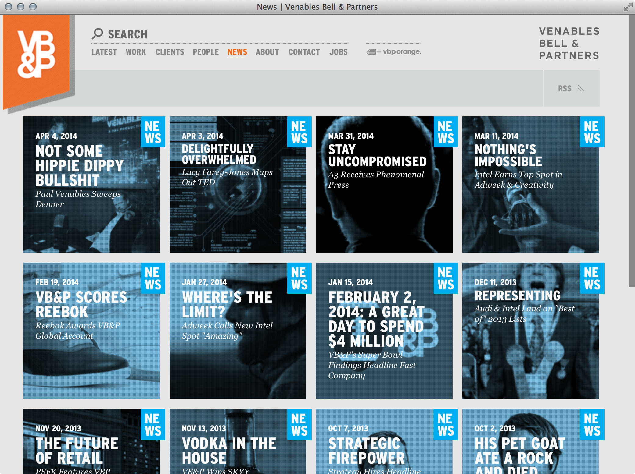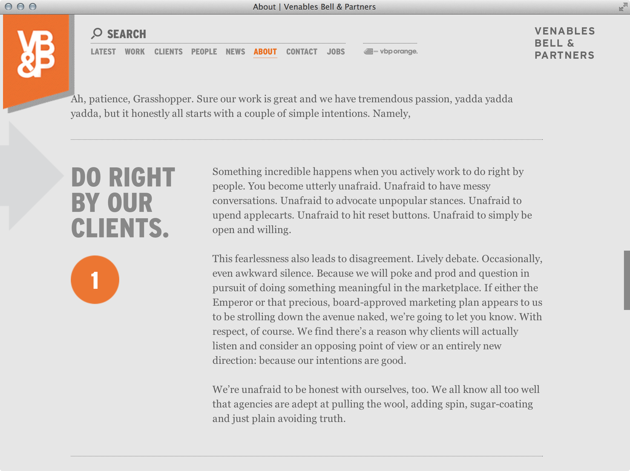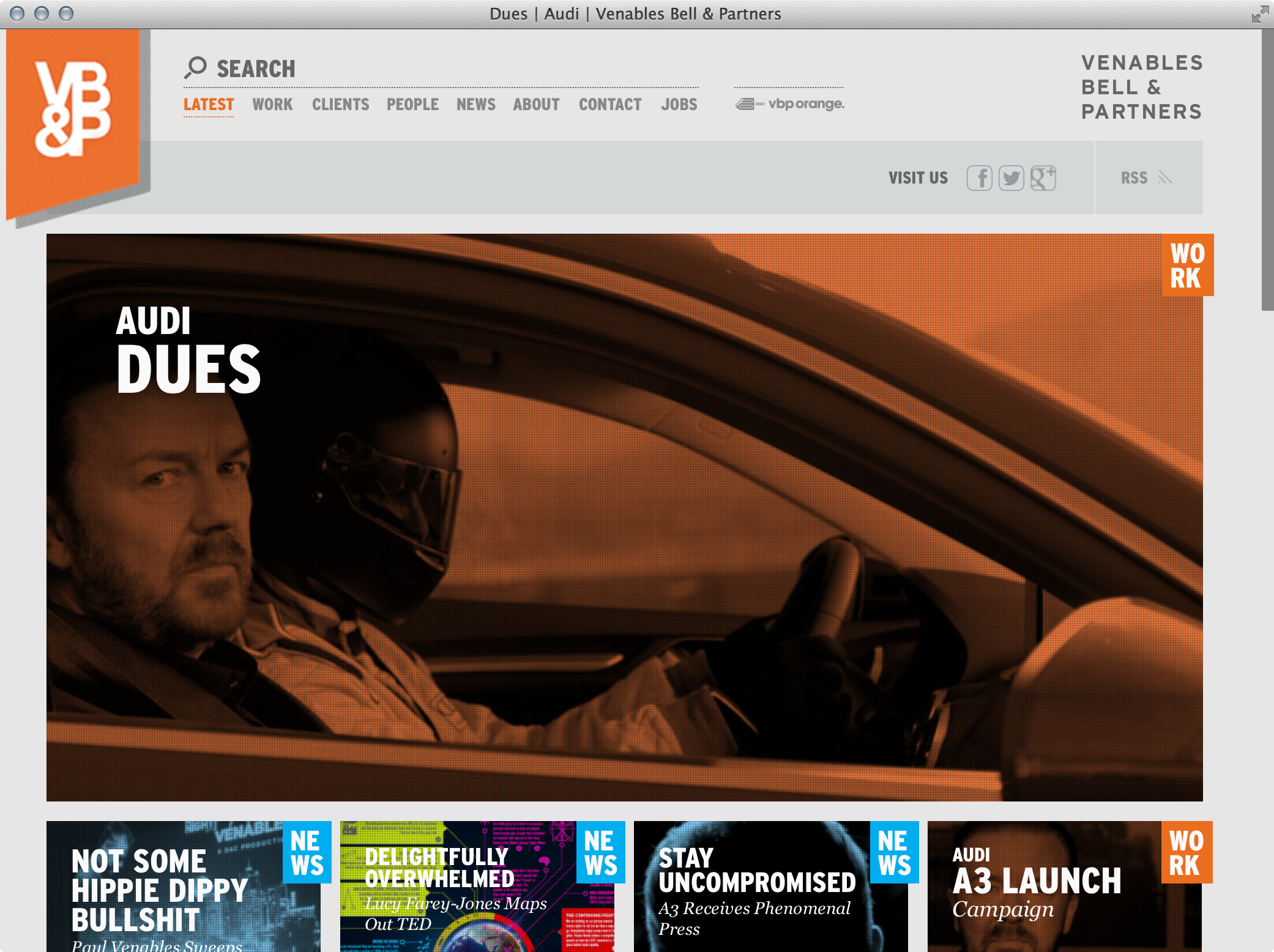 VB&P Venables Bell & Partners is an advertising agency in San Francisco with a very appealing modern website. The design is inspiring but not overloaded. Interstate Bold and Black Condensed is used for headlines and navigation, as well as good old Georgia for small body copy, which looks elegant and appropriate next to the strong caps on the subdued grey backround.