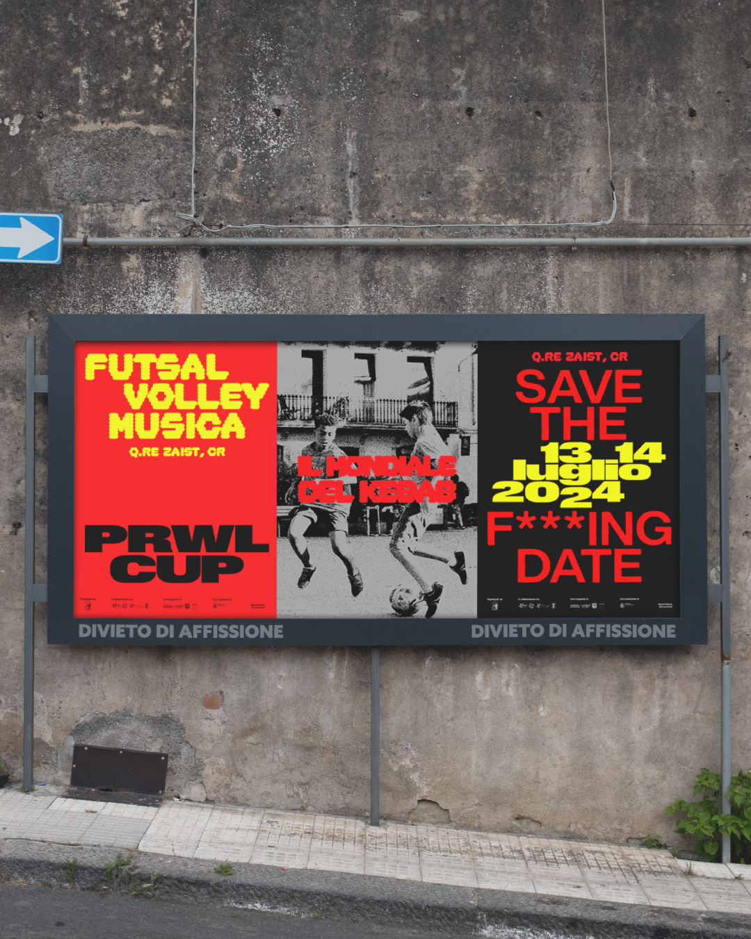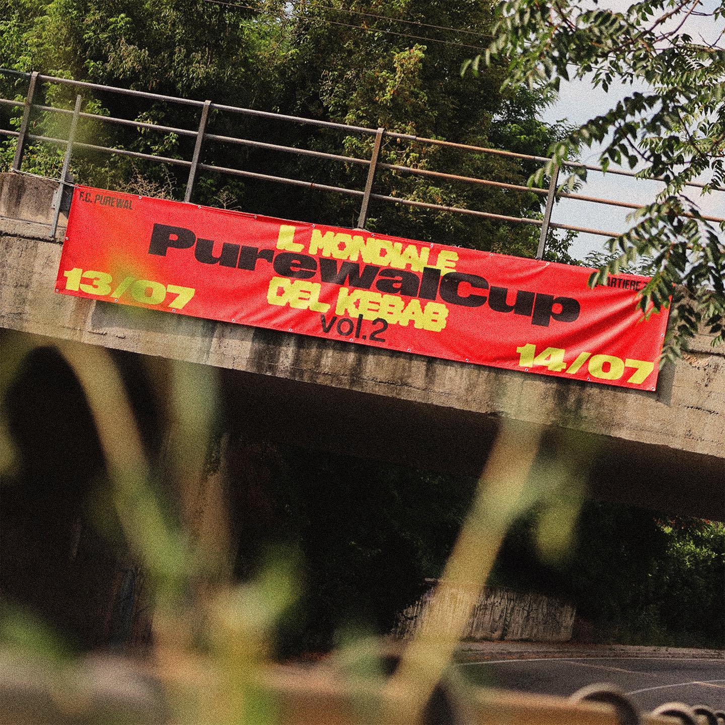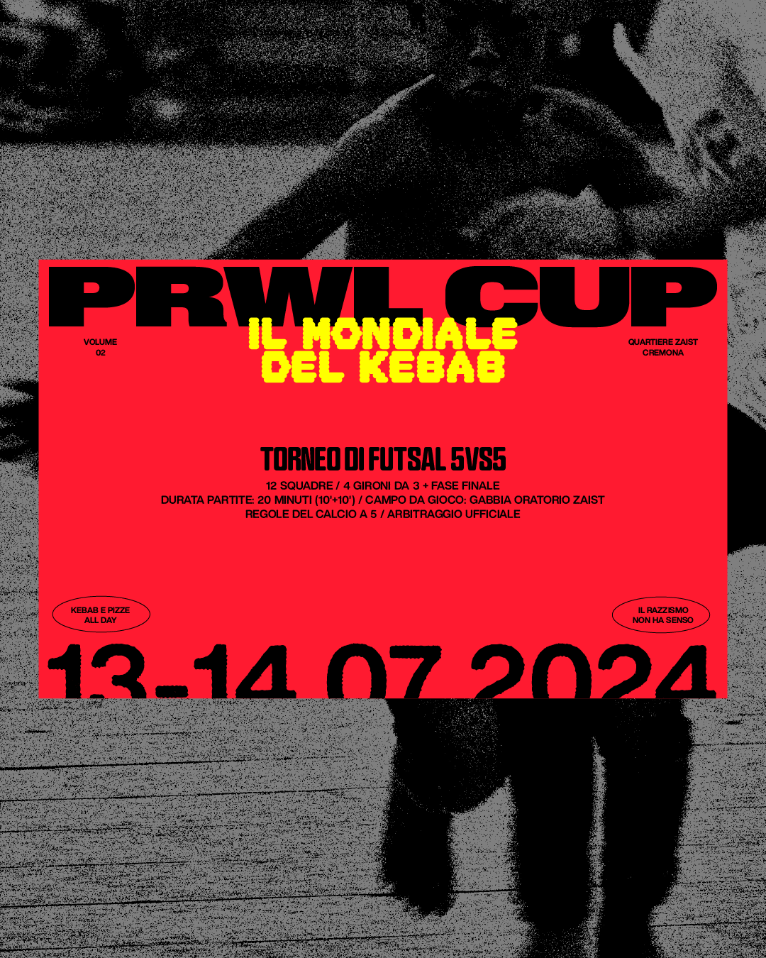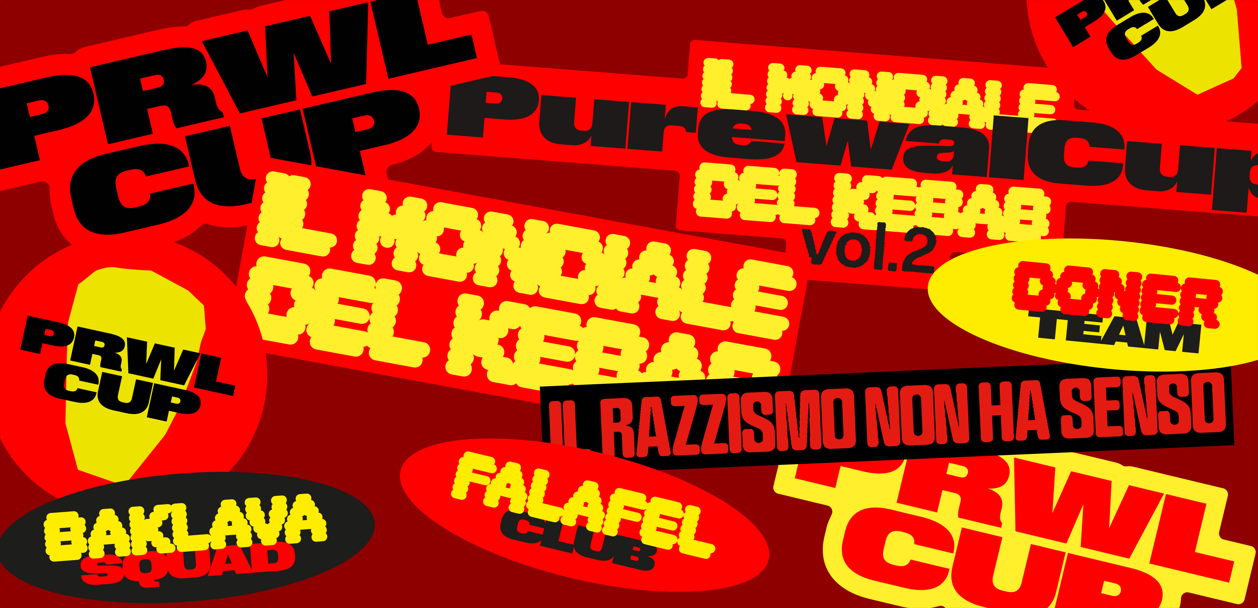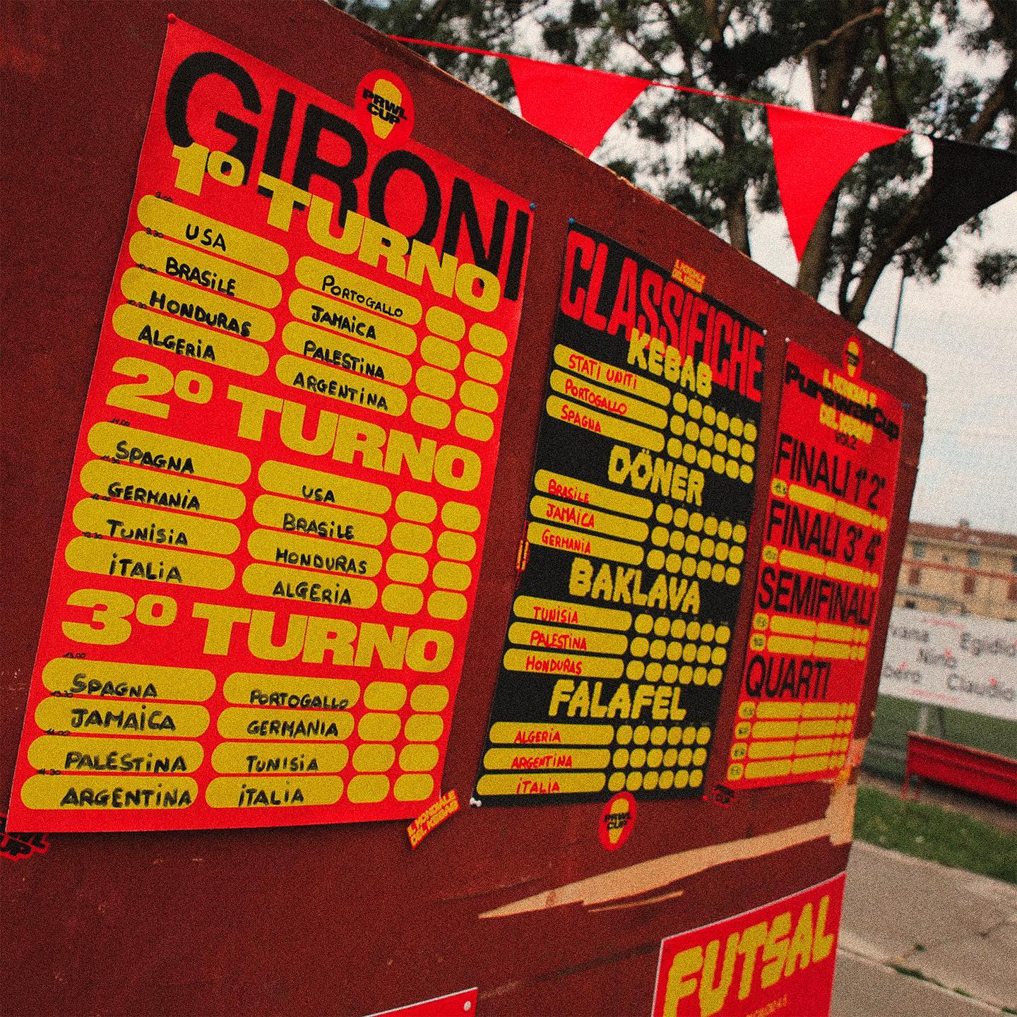 Identity for the second volume of the Purewal Cup football tournament. This is a neighbourhood event where a team of young people organise a two-day party every year. The “Mondiale del Kebab” comprises a 5vs5 football tournament, a beach volleyball tournament, and many other small activities. The intent is to keep the neighbourhood residents united and proud, all against racism.