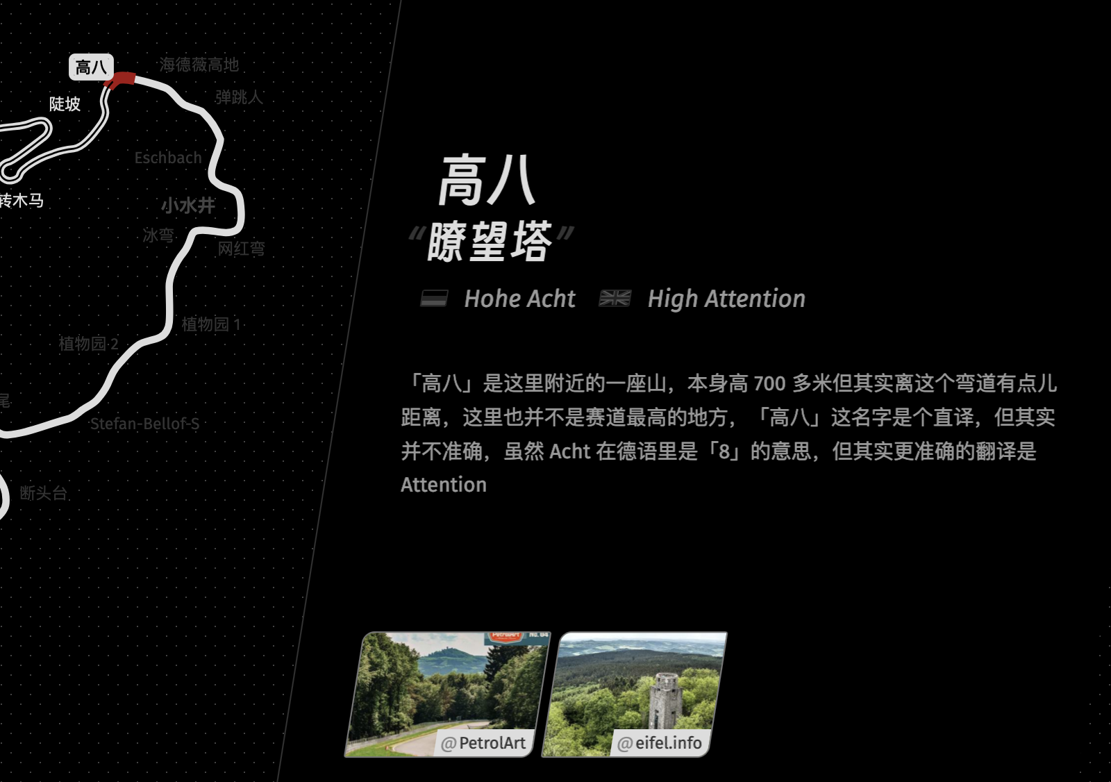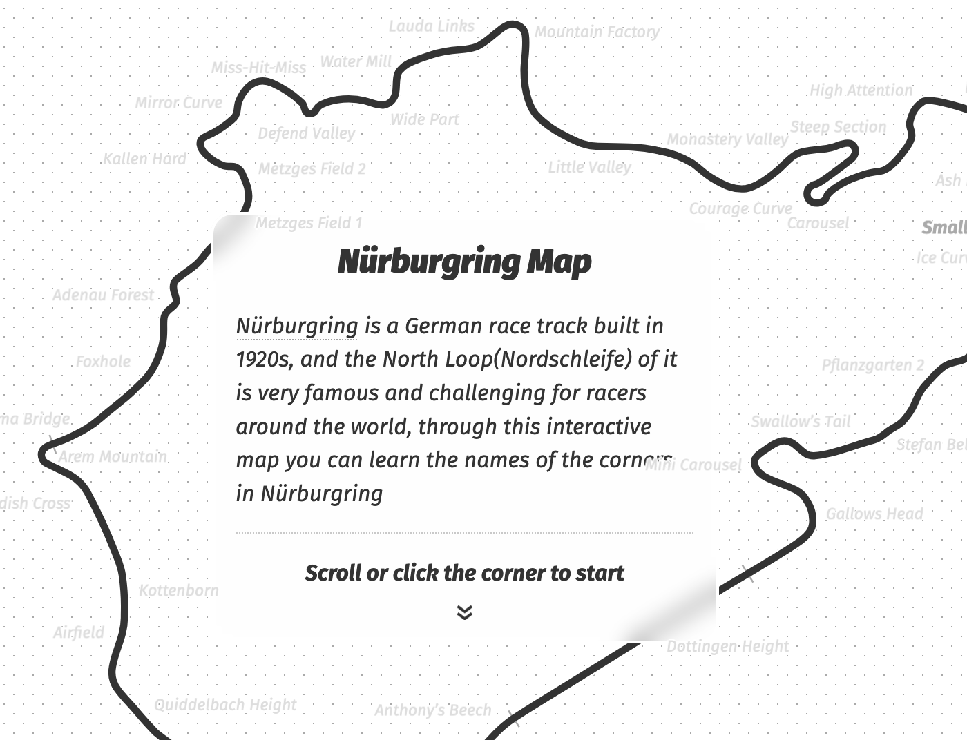 Nürburgring Map Contributed by JJ Ying on Oct 19th, 2024. Artwork published in October 2024. Source: jjying.com License: All Rights Reserved. English version, dark mode An interactive map of the famous German race track Nürburgring. Source: jjying.com License: All Rights Reserved. Chinese version, light mode Source: jjying.com License: All Rights Reserved. Detail Source: jjying.com License: All Rights Reserved. Detail Typefaces More about Smiley SansGet Smiley SansMore about Fira SansGet Fira SansMore about PingFang Formats Web (5638) Infographics/Maps (558) Topics Sports (785) Designers/Agencies JJ Ying (5) Tagged withwebsites (3580)car racing (37)Nürburgring (1)interactive (108)italics (712)self-initiated projects (435)multiscript (903)multilingual (2645)Latin (script) (734)Chinese (language/script) (150)English (language) (2456)dark mode (34)reversed type (3393)red and black (1141)maps (436) Artwork location China (82) Shanghai (24) In Setsfree font (Charly Morfin) (13) Post a comment Name Email – will not be published Website Your response Submit Comment More Fira Sans in use Mittenmang & Tolerant2016Contributed by Florian Hardwig Good Pictures by Kim Beil2019Kevin Barrett KaneContributed by Kevin Barrett Kane EUT+ (European University of Technology)2021BrandBoxContributed by BrandBox Sponsor More in Sports Grantland websitec. 2014Contributed by Webtype Merckx Ocana – Duel au Sommet book cover1974unknownContributed by Mathieu Triay GEST Conference 2025, “Fusion of Science and Sport”c. 2024Eric SchwarzContributed by Eric Schwarz Studio Soleil2025Adèle MahéContributed by Alexandre Créquer More in Infographics/Maps Daytum website and app2010Nicholas FeltonRyan CaseContributed by Arielle Weiler Hamburg town plan and major sights (1952)1952Hans-Günther BaassBruno KarbergPhoto(s) by mikeyashworth on Flickr. Staff Pick Ice Lab2013OK-RMContributed by Or Type KinderKulturMonat2012Studio Laucke SiebeinContributed by Florian Hardwig Staff Pick More Fonts In Use Lingua1972Contributed by Stephen Coles Staff Pick Aerodynamics by L. R. Parkinson1944unknownContributed by Stephen Coles Staff Pick School Life/Daily Life 2025–20262025Rutger van AkenContributed by Rutger van Aken Staff Pick Château d’Auxonne2014Dangles ArchitectesGraphibusIsabell AllégretContributed by Florian Hardwig Staff Pick