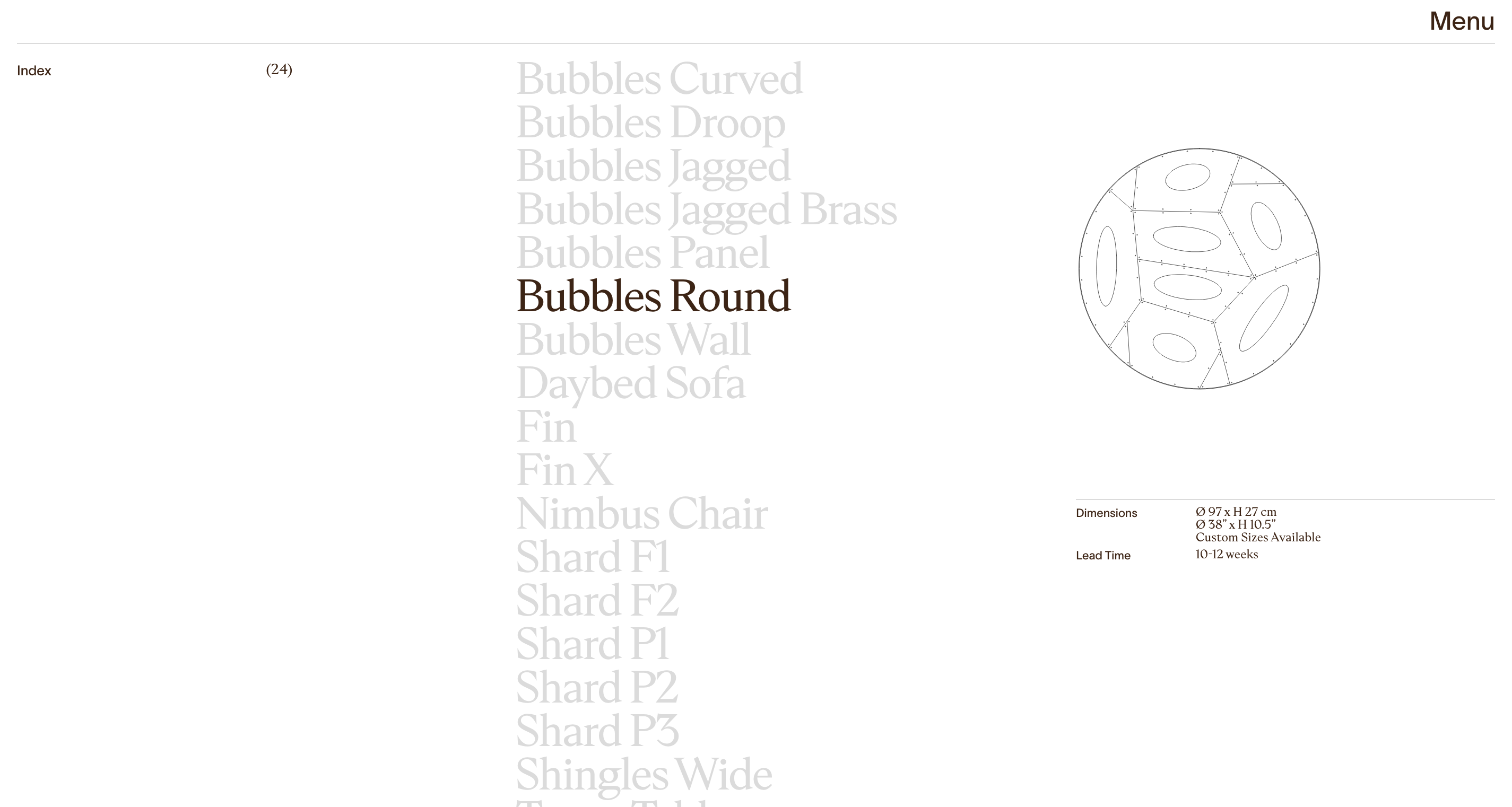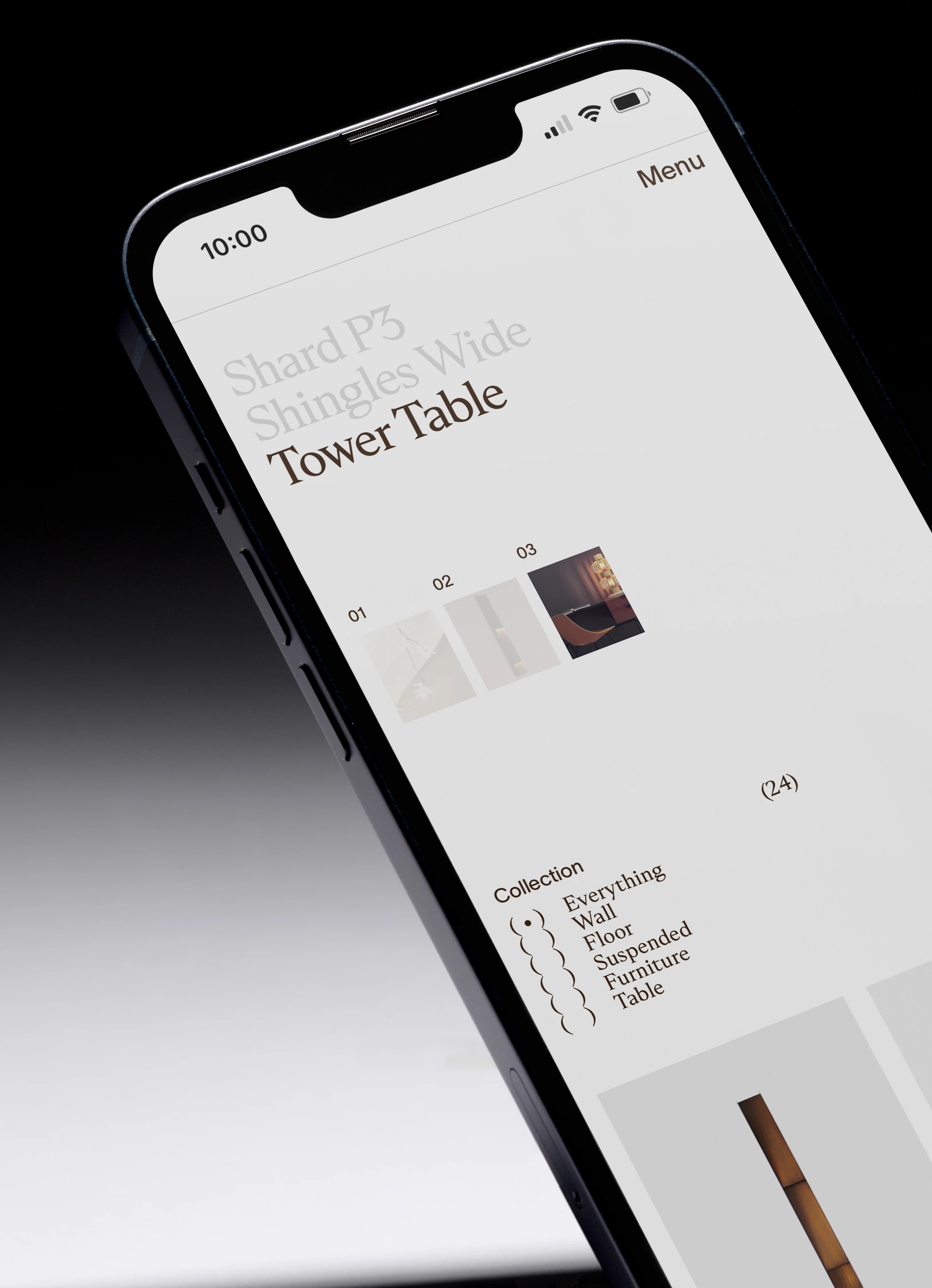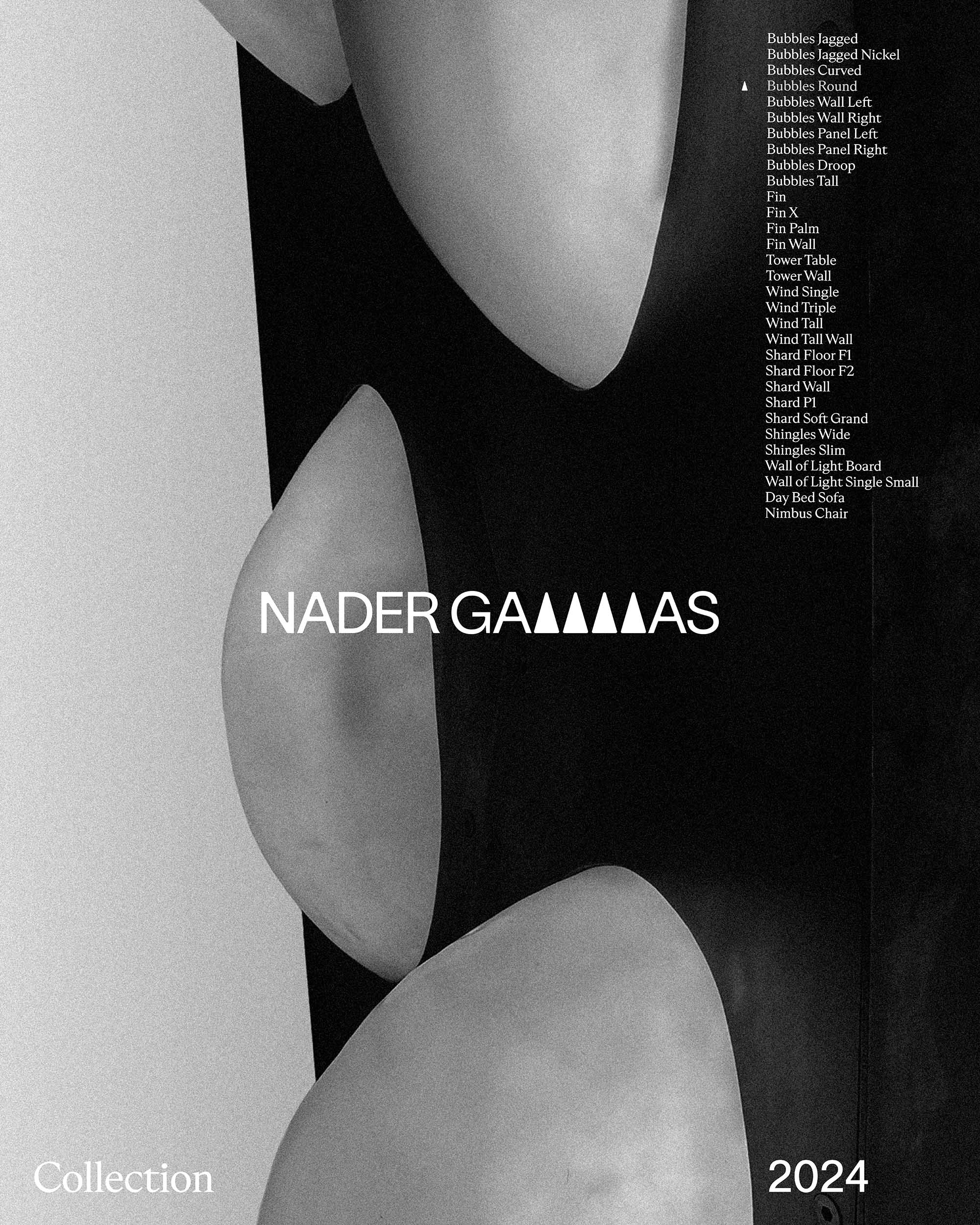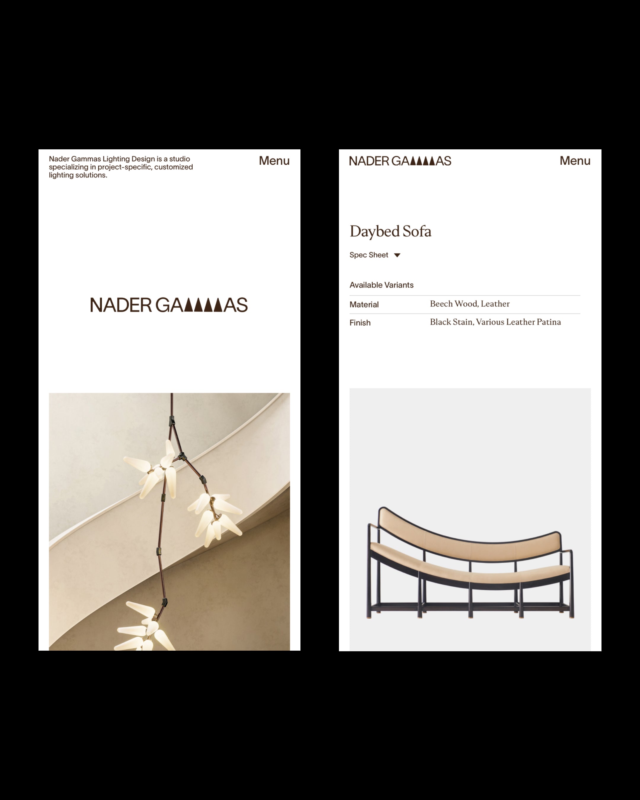 At the centre of this transformation is a custom logotype, crafted to symbolise light itself. Inspired by the interplay of beams of light, our design features a double ‘M’ motif, subtly reflecting the energy behind Nader Gammas’ creations. The accompanying typography palette pairs the spiky serif Ghost and curvy sans-serif Lausanne, typographic choices that reflect the forms and materials inherent in every Nader Gammas piece. Further enhancing the tactile experience, we created a suite of luxurious print materials, including price lists, swatches and stationery items. Utilising print finishes such as foil blocking and embossing on premium paper stocks, each element speaks to Nader Gammas’ commitment to quality.